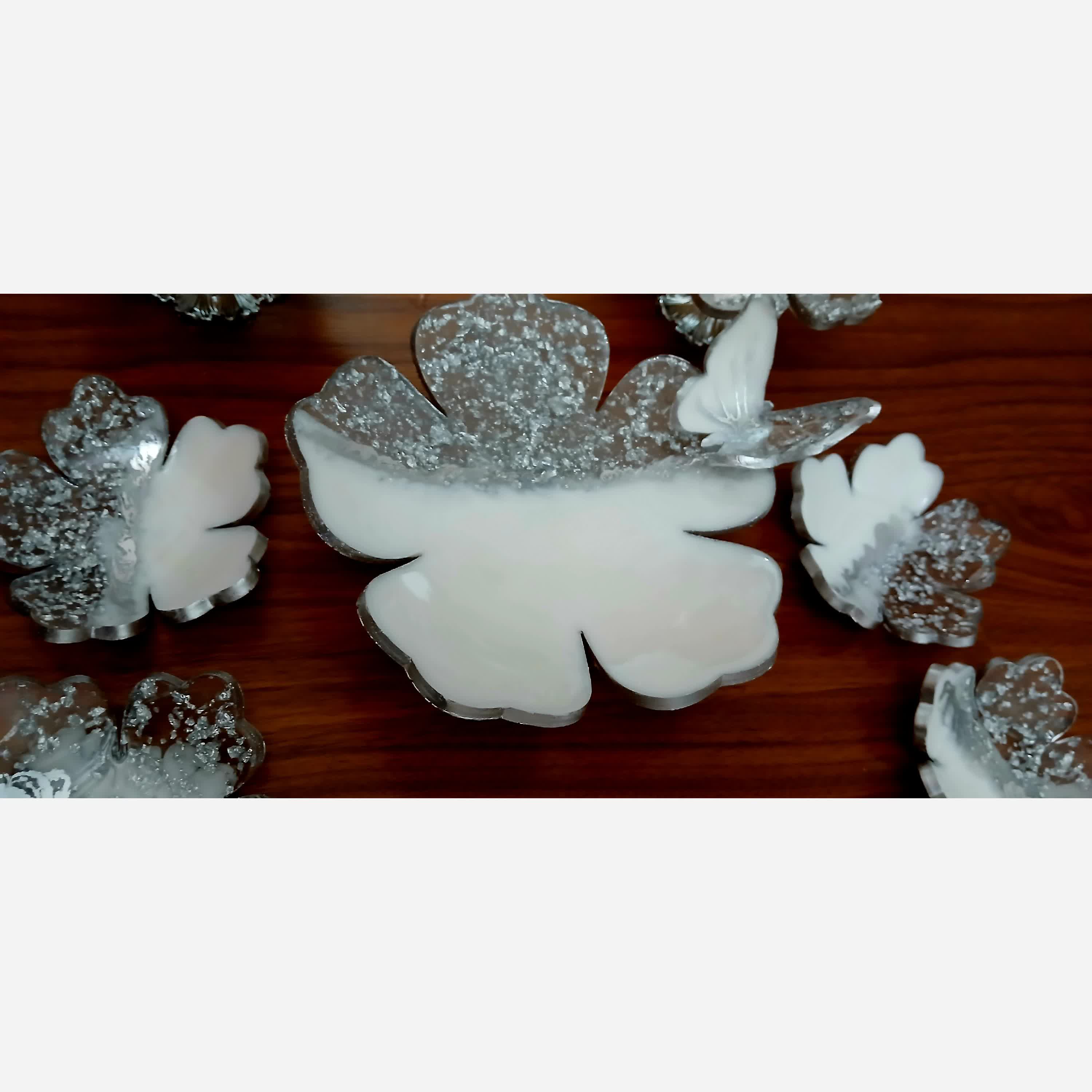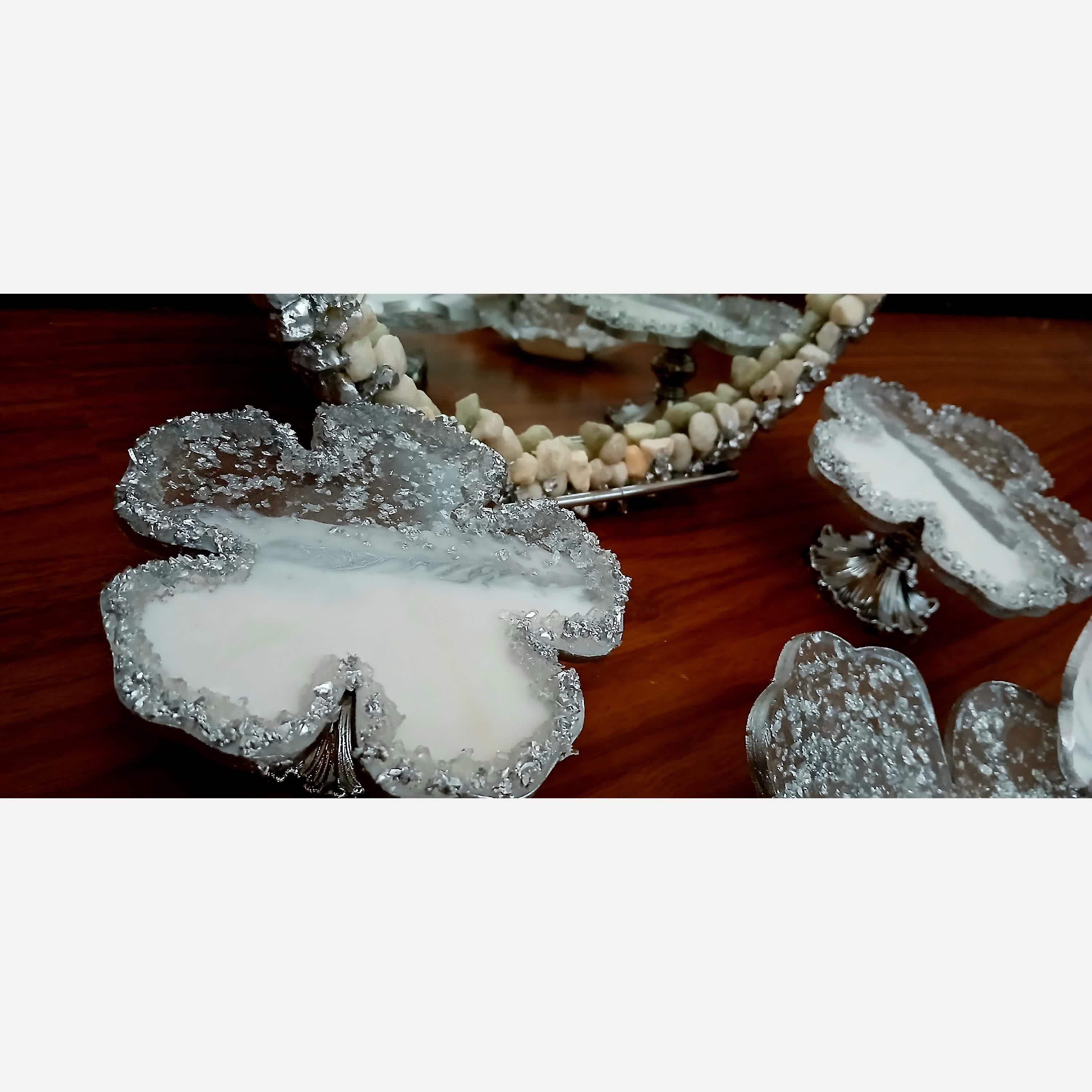 هفت سین سفیدبا ورقه های نقره 6تا کاسه 12 سانت 2تا شمعدان با پایه .ویه کاسه20 سانت و1اینه30 سانت ارسال رایگان