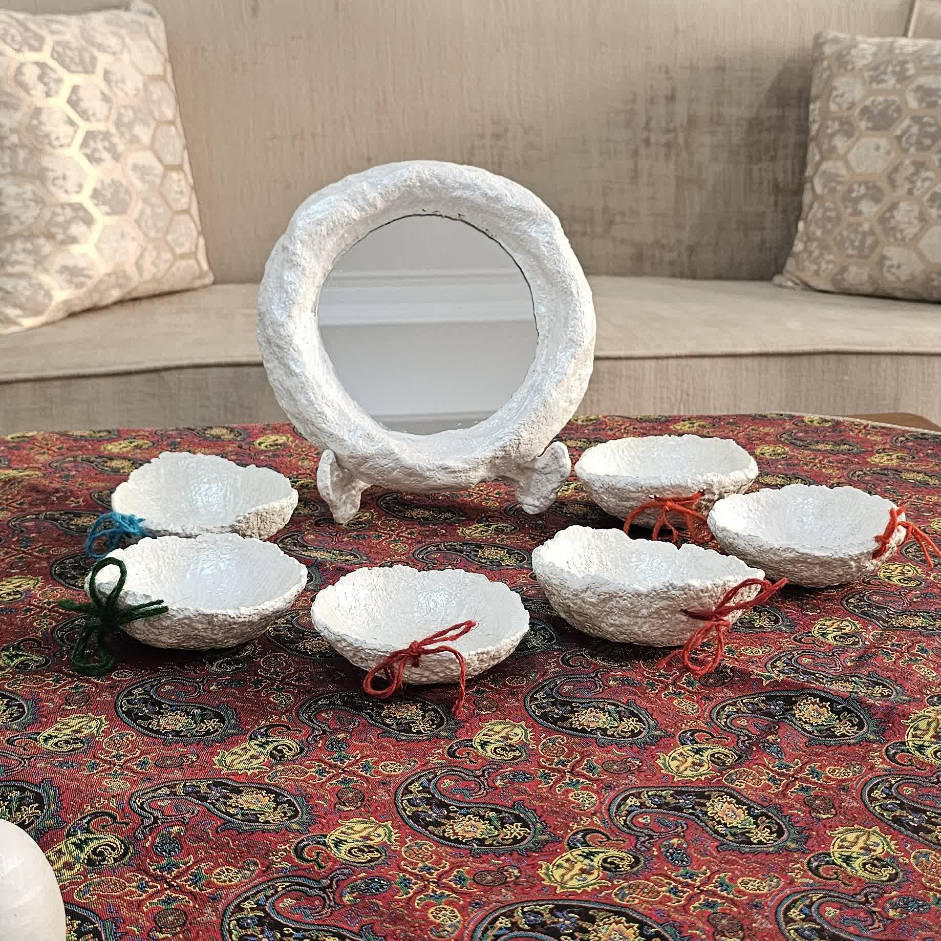 هفت سین جنس پاپیه ماشه شامل ۶پیاله و یک آینه قابل شستشو نیست. و با دستمال نم دار تمیز میشود