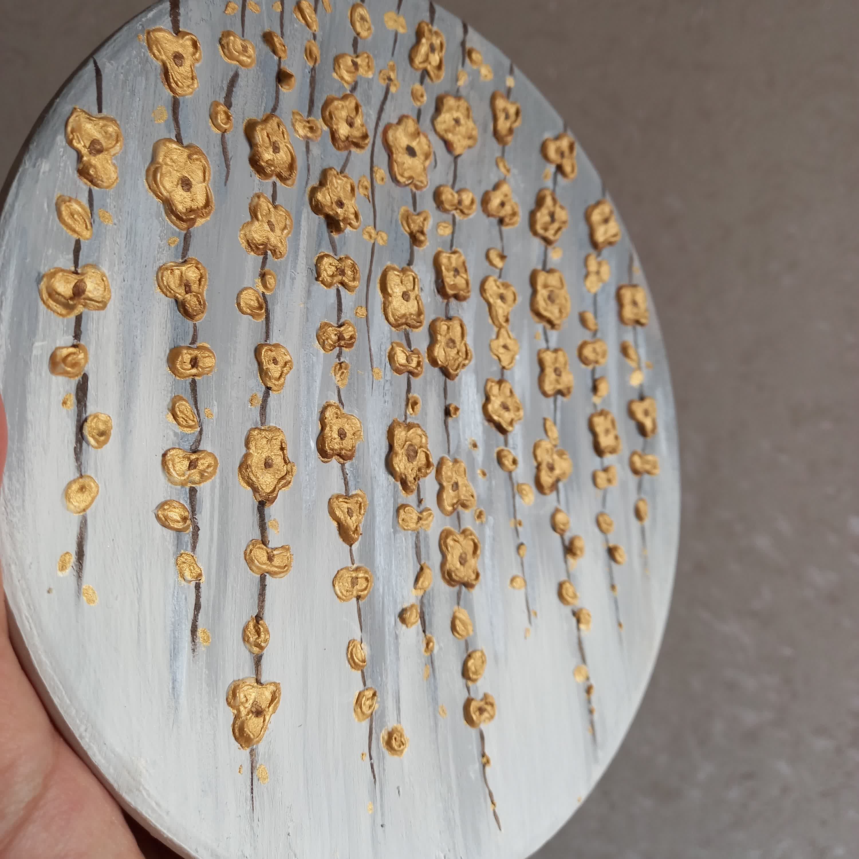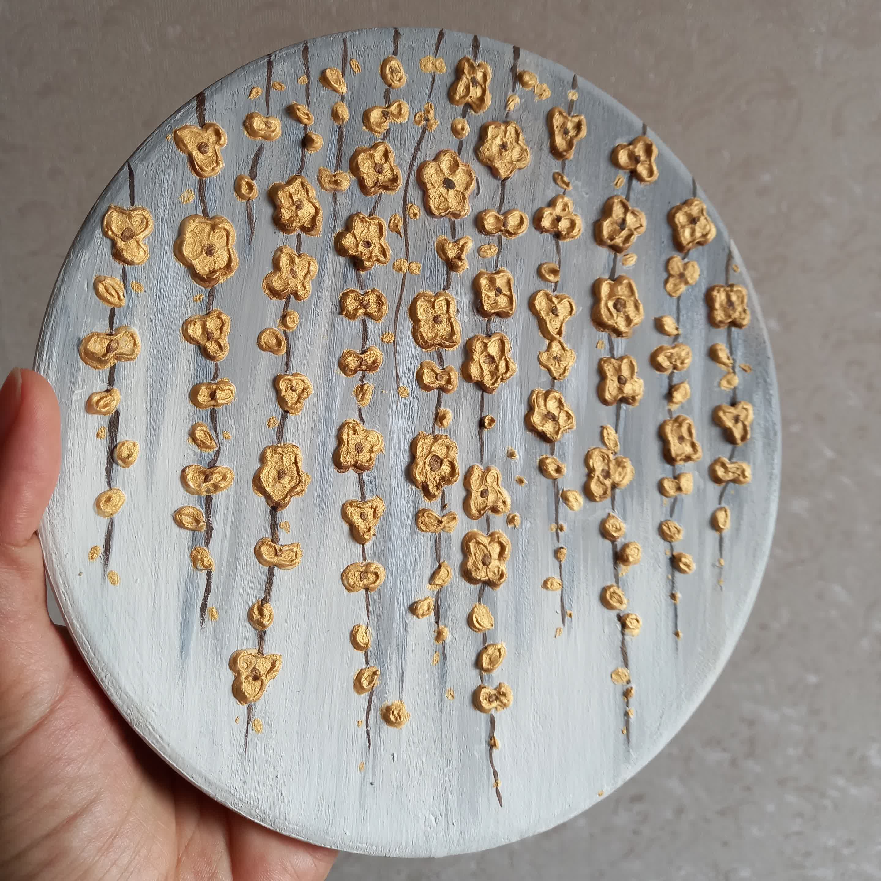 دیوارکوب سفالی، کار شده بصورت برجسته با تکسچر ، ضد آب شده و قابل تمیز کردن با پارچه نمدار هست. طرح پرطرفدار ریسه ی شکوفه با رنگ طلایی💛 عید امسال خاص باشید💫🌟