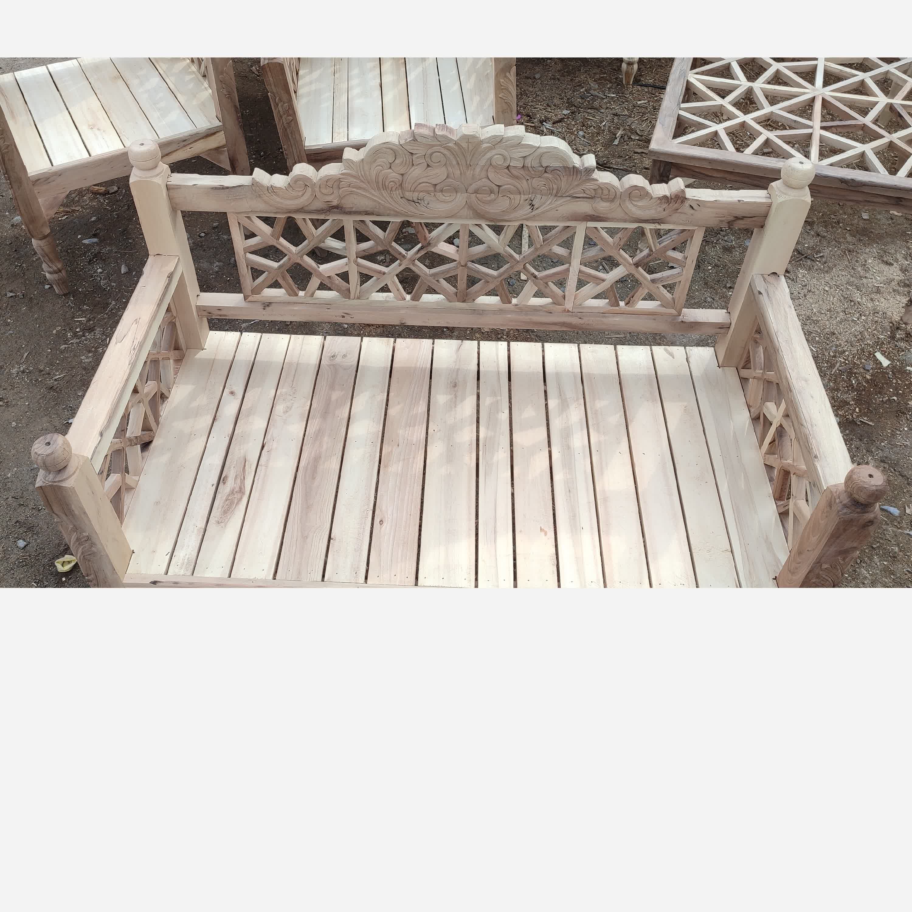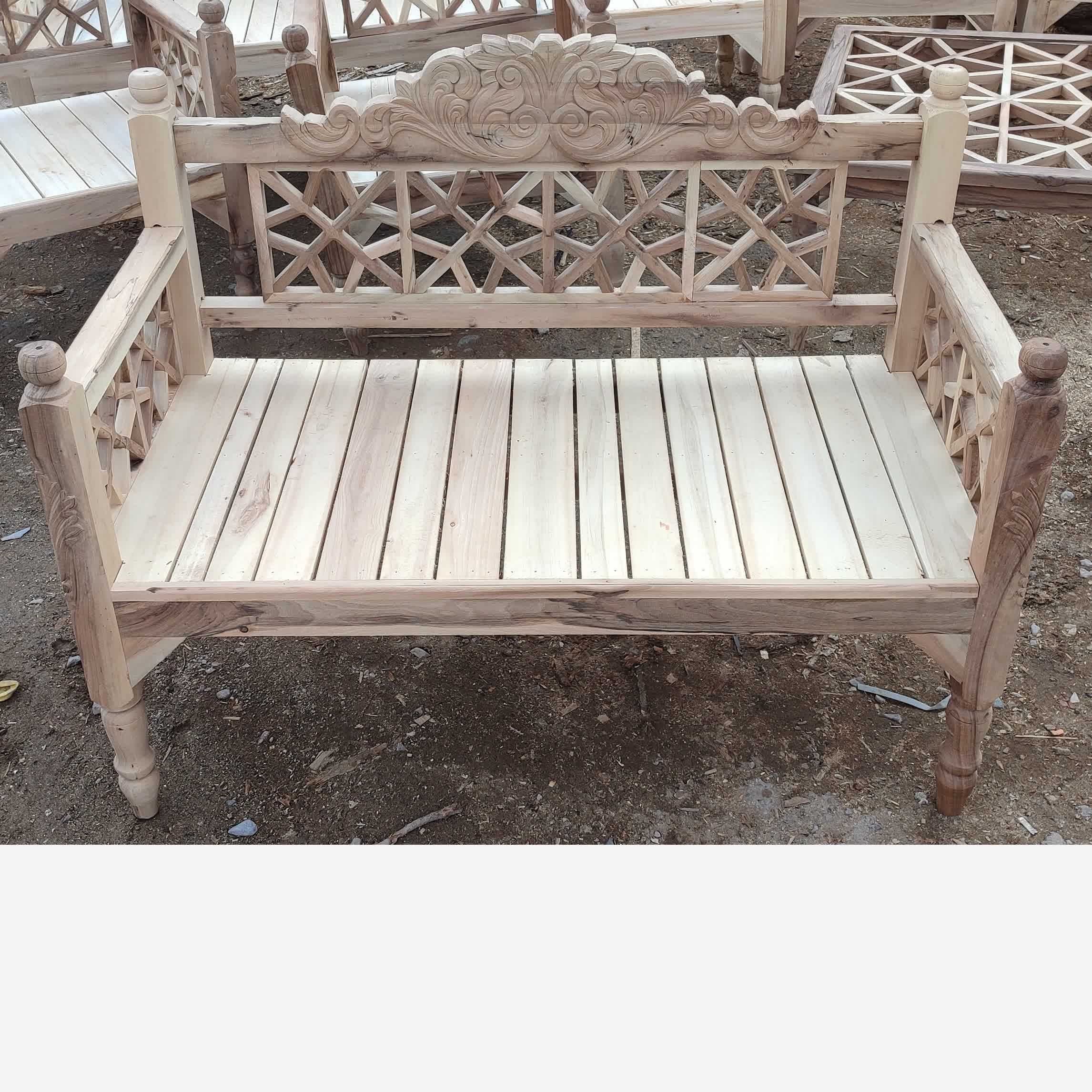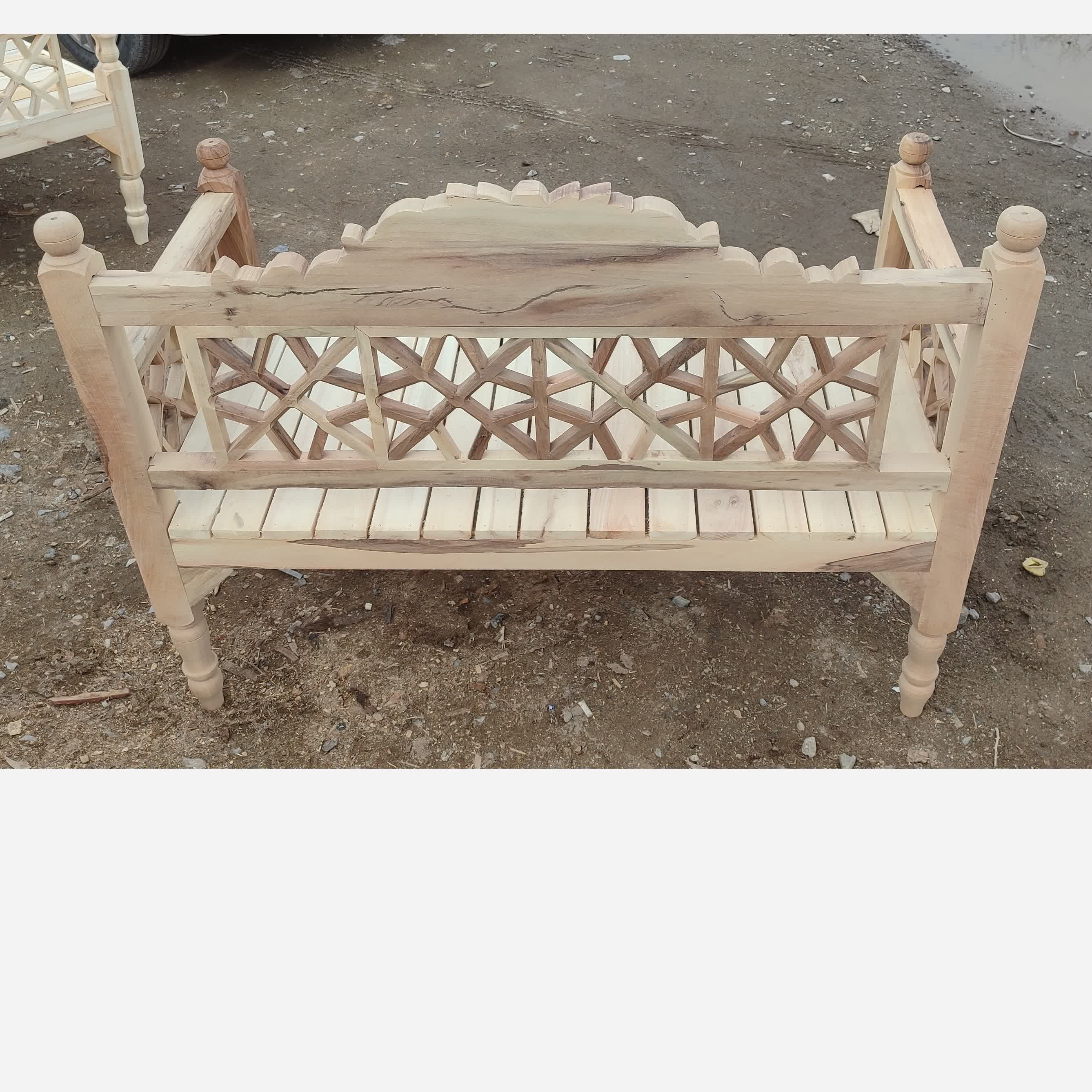 نیمکت دونفره چوبی ساخته شده از چوب گردو در سه طرف این نیمکت مشبک کاری انجام شده پایه های نیمکت هم خراطی شده هم دارای منبت کاری میباشد درضمن نیمکت دارای تاج منبت کاری هم هست تمامی منبت کاری ها و مشبک کاری ها کار دست میباشد که ارزش بالایی دارد کیفیت را از ما بخواهید