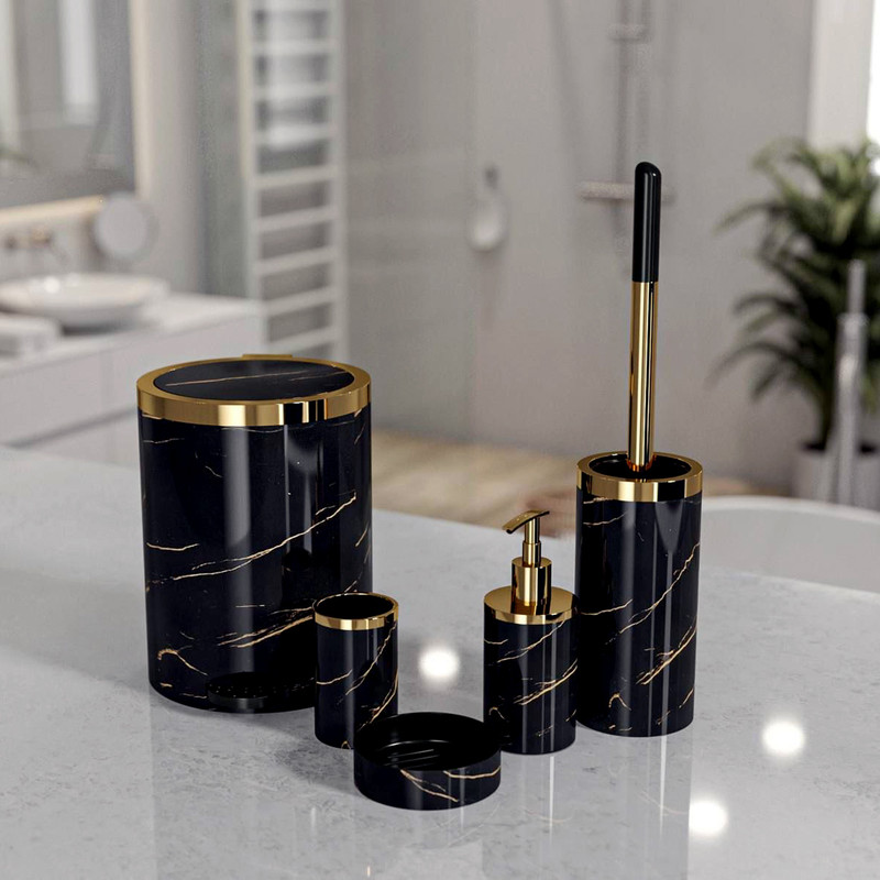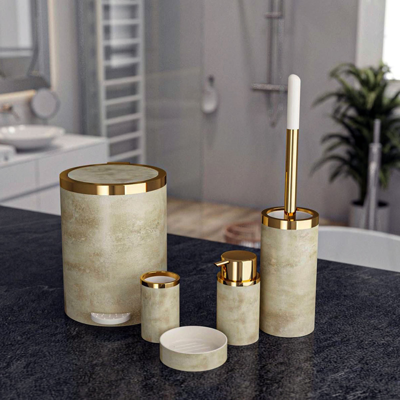 ست پنج پارچه سویس بهداشتی شامل سطل پدالی جا مایعی فرچه توالت جامسواکی و جاصابونی می باشد. طرح های تولید شده مانند کاشی و سنگ های رگه دار طبیعی می باشد که با انواع سنگ و کاشی سرویس بهداشتی قابل ست است و زیبایی دوچندانی می بخشد