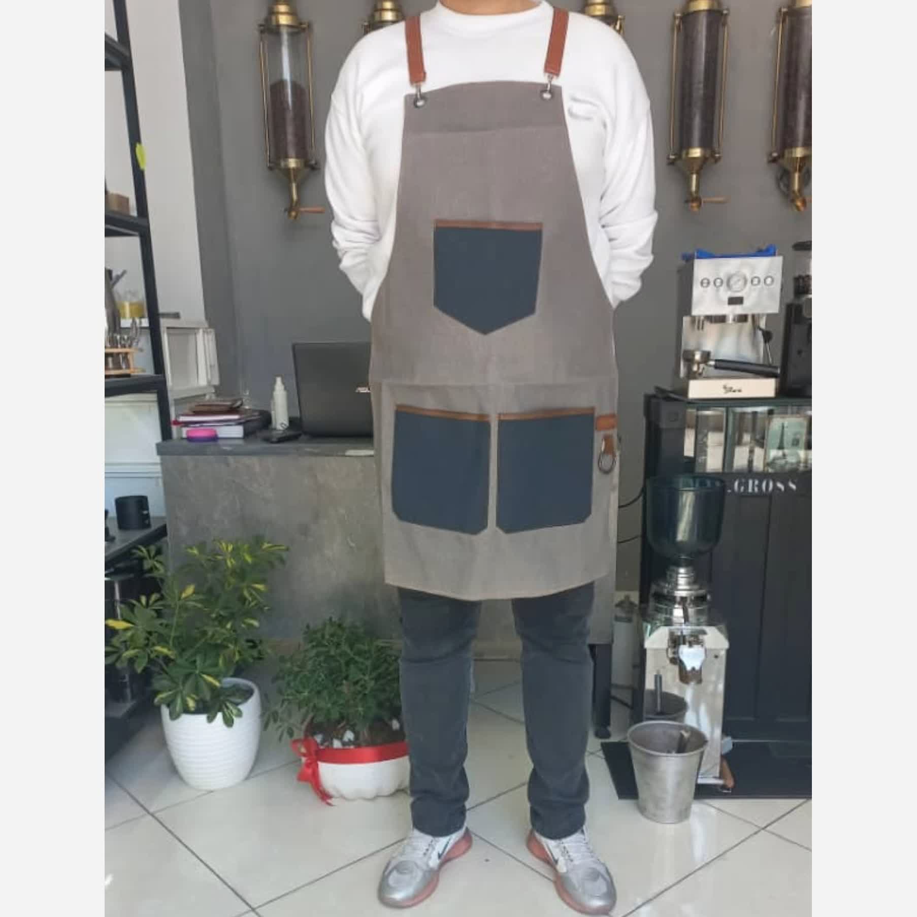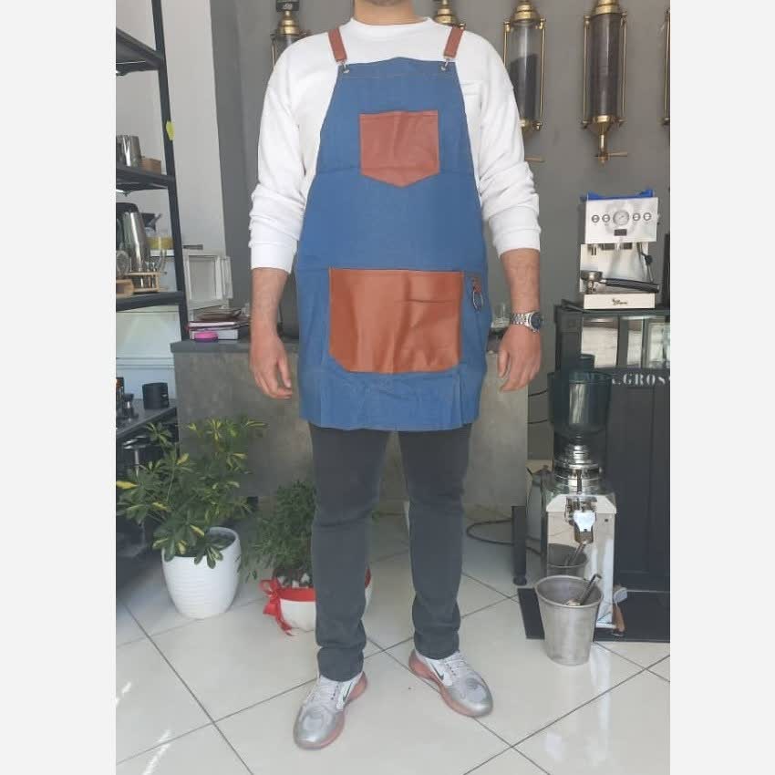 پیشبند باریستا معمولا از جنس کتان چرم و چرم مصنوعی است و مدل های موجود در آگهی رنگ آبی و طوسی جنس پارچه کتان و مدل استارباکس پارچه ضد آب