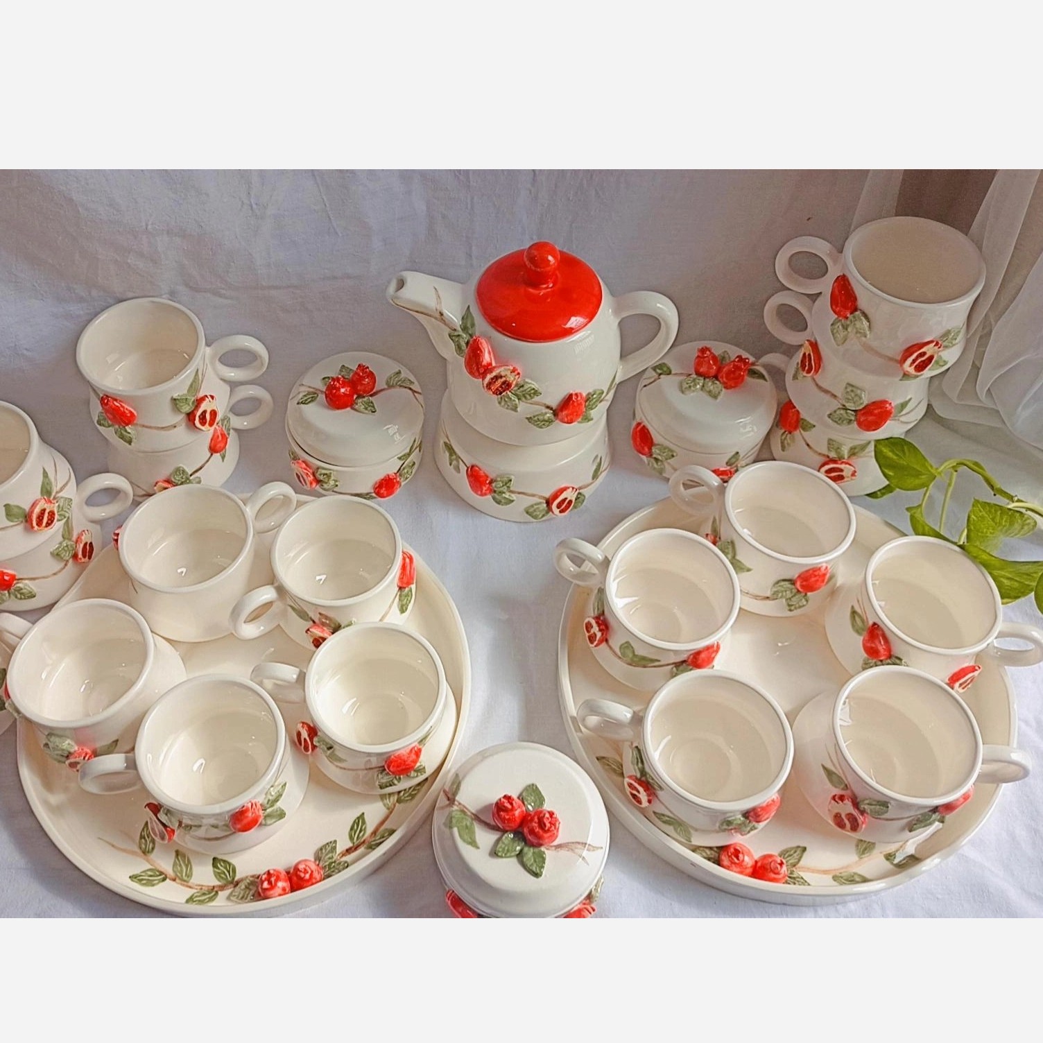 ست پذیرایی طرح برجسته ✅جنس سرامیکی ✅قابل شستشو در ماشین ظرفشویی ✅قابل استفاده در فر ✅رنگ ثابت ✅استفاده از لعاب معدنی وبدون سرب ⬅️سرویس چای خوری 6نفره همراه قوری ووارمر وقندان وسینی 27سانتی