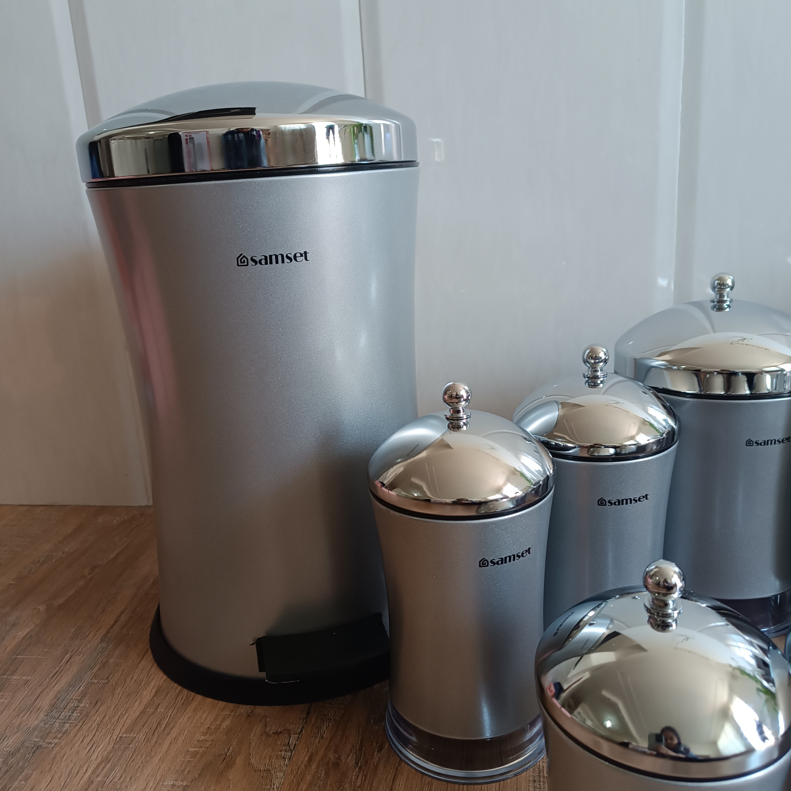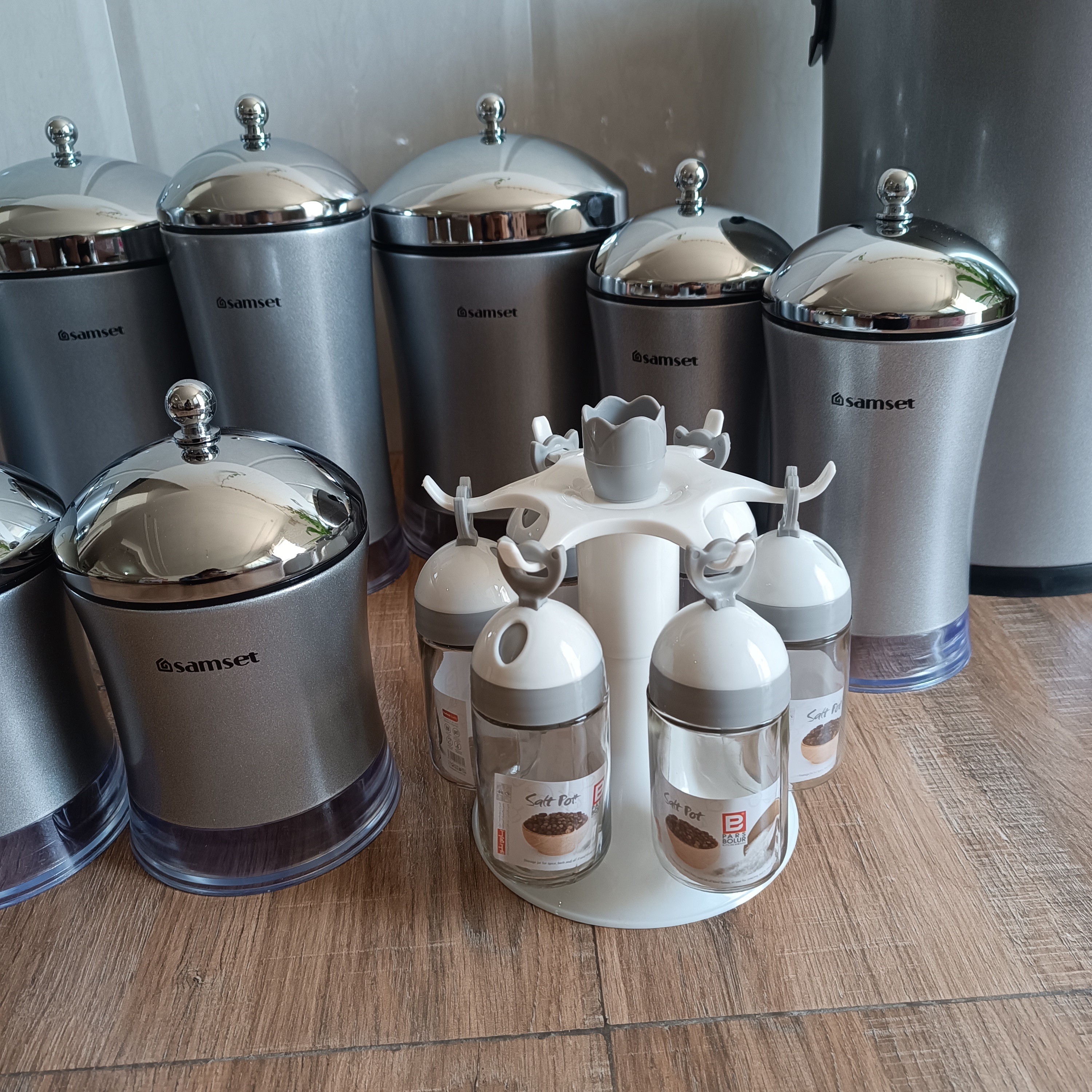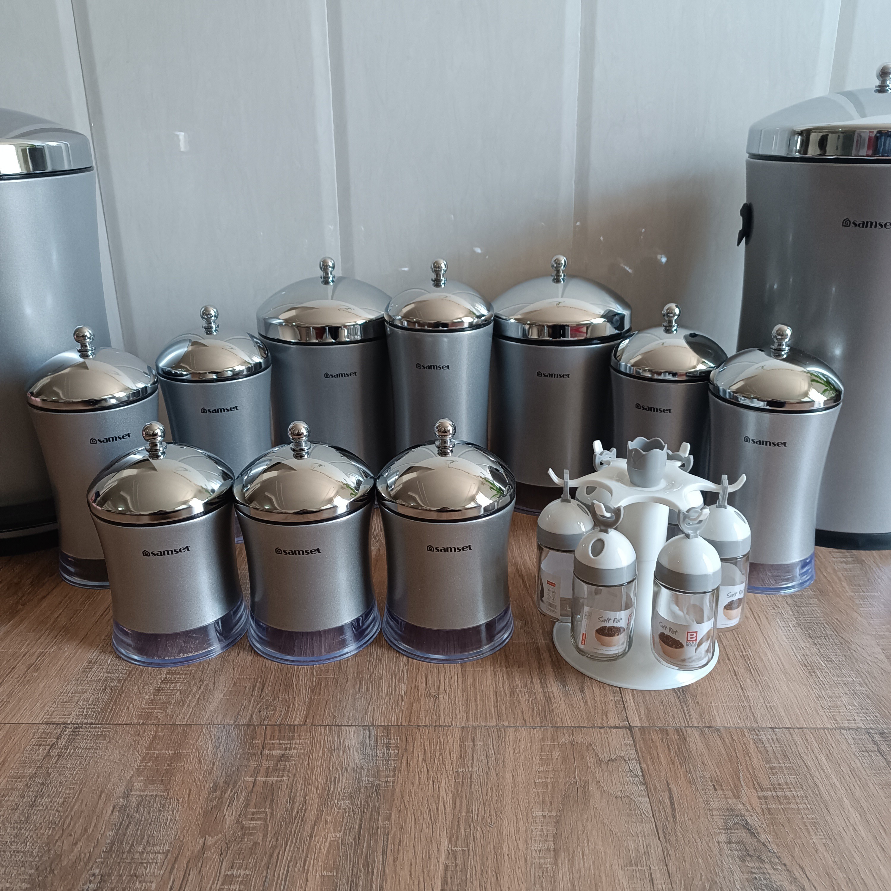 سرویس آشپزخانه 19 پارچه سام ست مدل فلاور سرویس شامل سطل پدالی متوسط با درب آرام بند سطل برنج متوسط سطل قند سطل شکر جاحبوباتی عدد ) پاسماوری کمرباریک عدد سرویس ادویه 6 عدد با استند که خودمون به سرویس اضافه کردیم