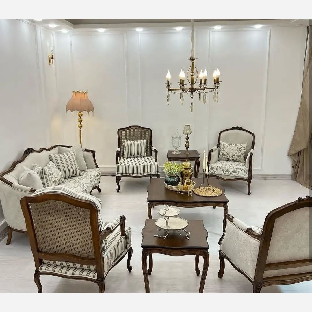مبل هفت نفره فرانسوی شامل یک عدد سه نفره و چهار عدد تک نفره بعلاوه جلو مبلی ها وعسلی ها کیفیت بالا را از ما بخواهید