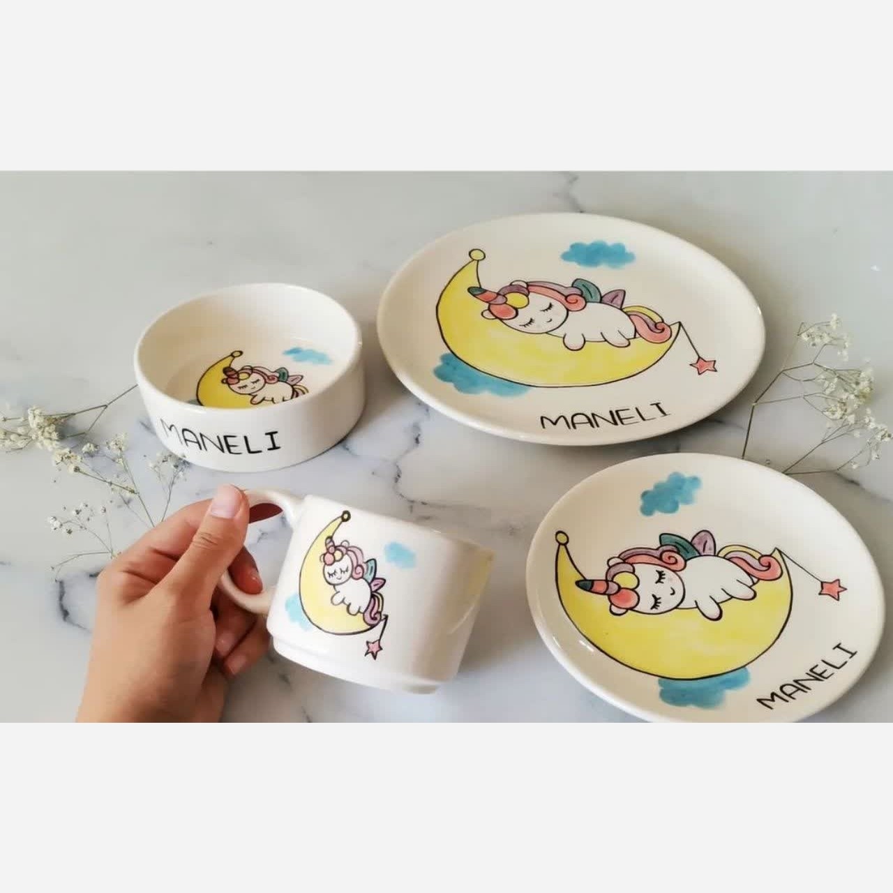 سرویس غذاخوری 4تکه سرامیکی نقاشی کار دست قابل سفارش با طرح دلخواه شماست شامل بشقاب/پیشدستی/پیاله/لیوان