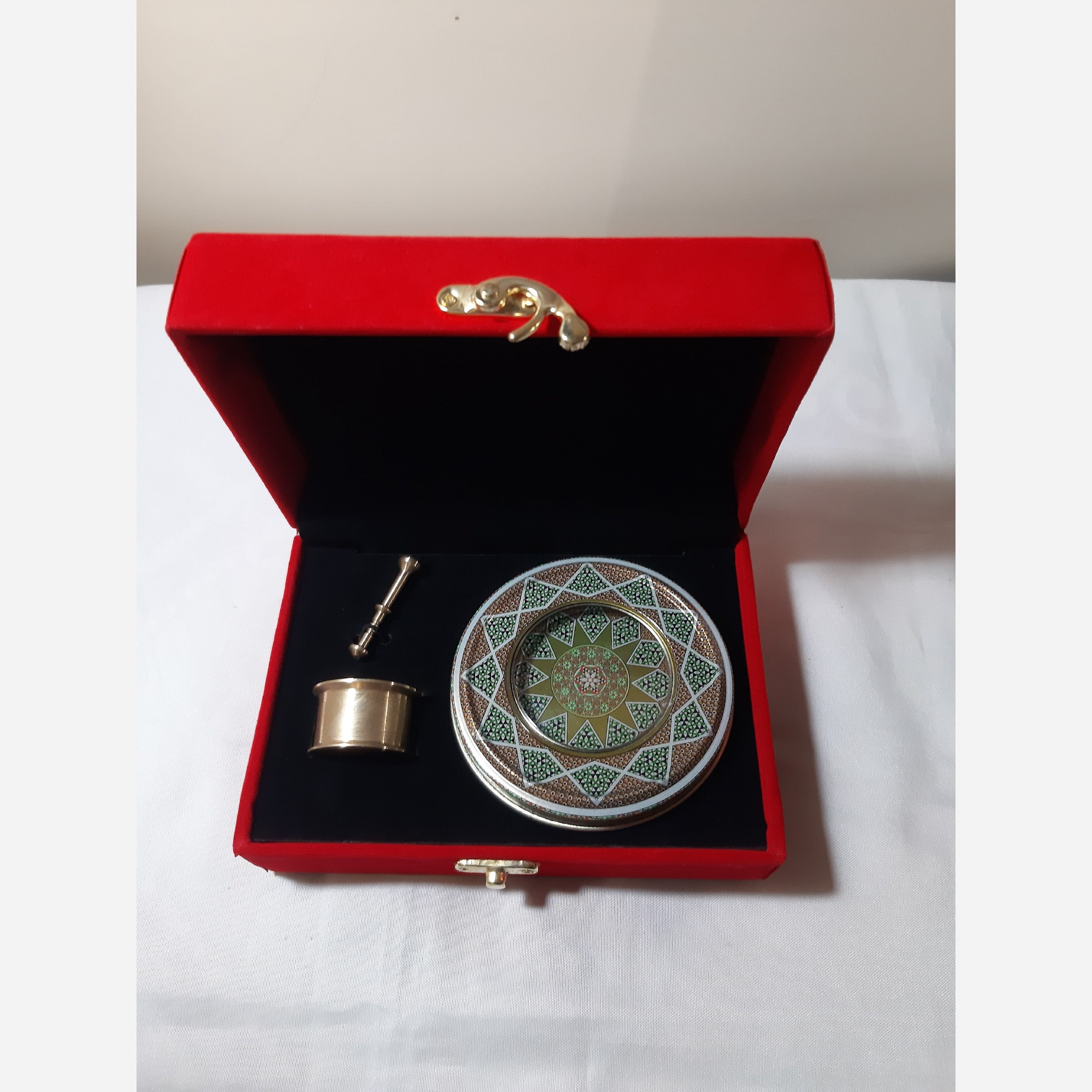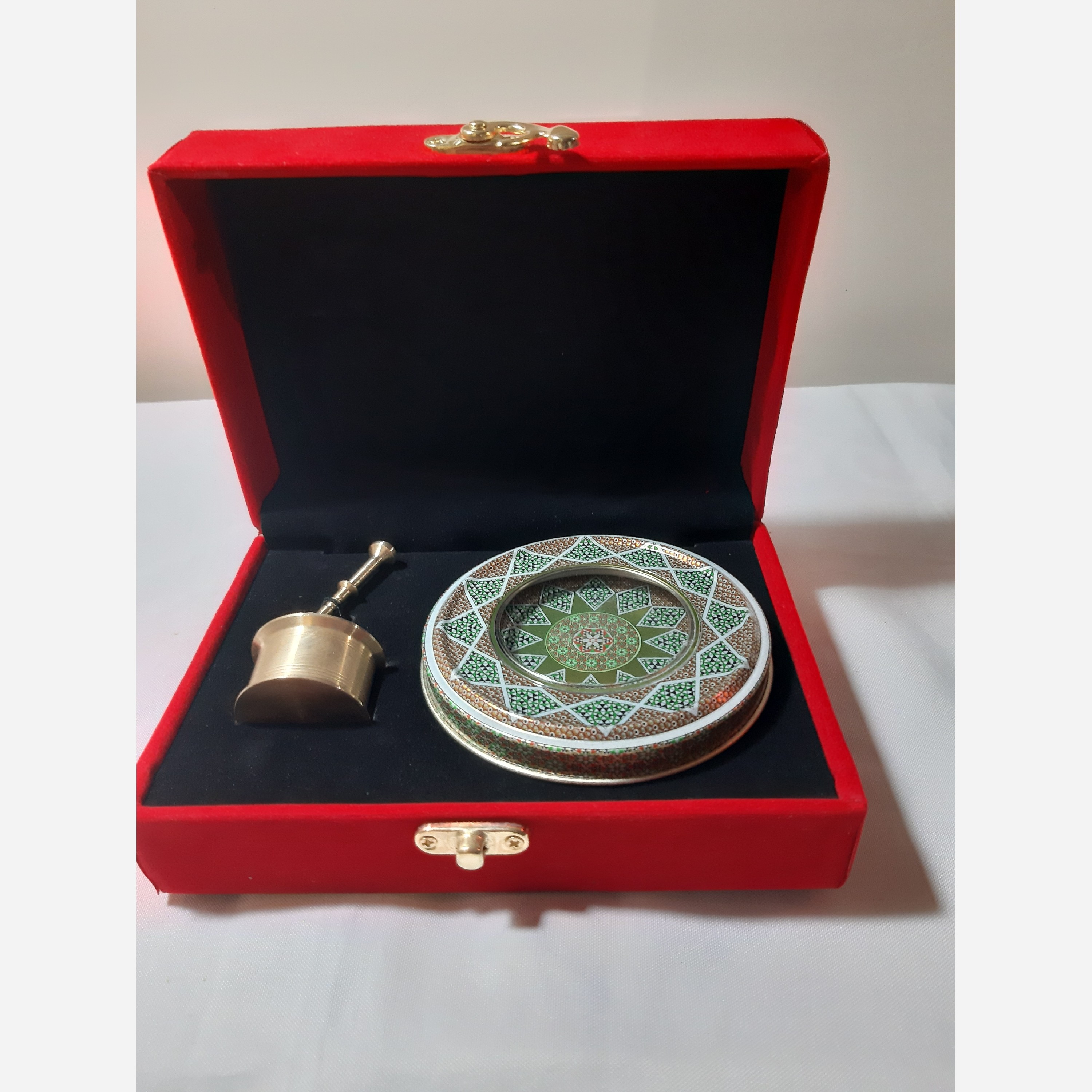 جعبه بسته بندی مخمل شامل یک ظرف خاتم مناسب برای 5گرم زعفران و هاون نقلی برنجی می باشد. این محصول از کیفیت مناسبی برخوردار است و به نحوی طراحی شده تا محتویات کاملا در محل قرار گیری خود به صورت ثابت باقی بمانند.