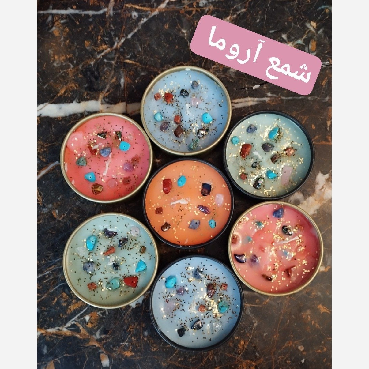 شمع آروما با قوطی فلزی تهیه شده از پارافین و یک ست از سنگهای اصلی هفت چ اکرا که بعد از استفاده از شمع سنگها رو میتونید شارژ کنید و برای همیشه ازشون استفاده کنید