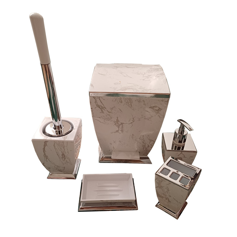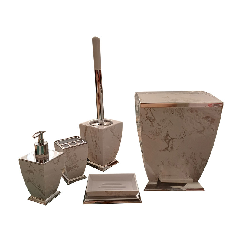 ست 5 تکه سرویس بهداشتی ،کمجا شیک با رنگ ثابت دربرابر آب و رطوبت دارای بهترین متریال پلاستیک فشرده شامل بالاترین تنوع طرح و رنگ آمیزی خاص، برای مشکل پسندان .که شامل سطل زباله ،جای مایع دستشویی، برس توالت شوی، جای صابون جامد و لیوان میباشد .