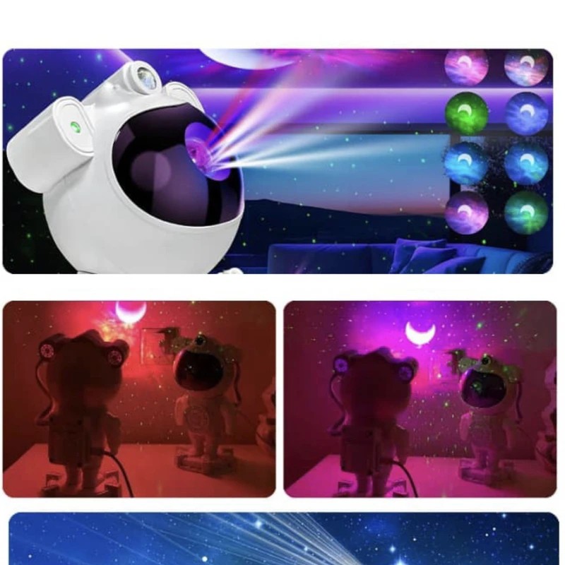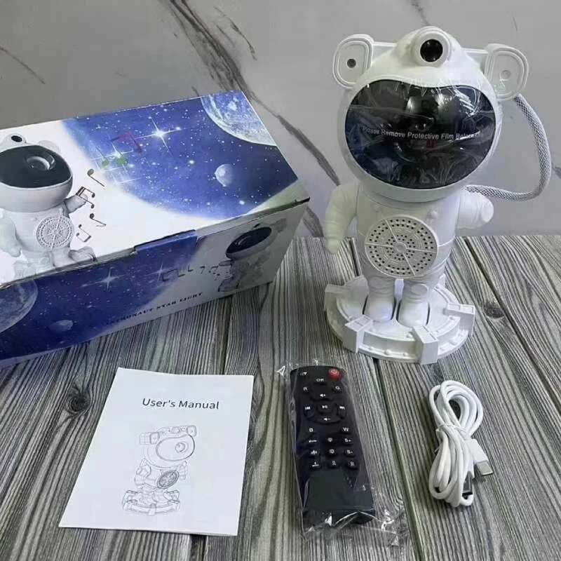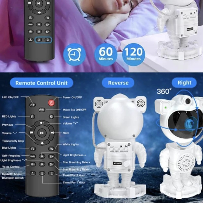 پروژکتور کهکشانی طرح فضانورد مدل اسپیکر دار یک چراغ خواب یا نورپردازی با قابلیت پخش افکت تصویر زنده کهکشانی در رنگ های مختلف به همراه لیزر ستاره ای بر روی سقف و دیوار اتاق یا هر سطح دیگری است که به همراه افکت لیزر ستاره ای حس یک سفر کهکشانی را قبل از خواب به شما میدهد . این پروژکتور کهکشانی دارای یک اسپیکر بلوتوثی در قسمت پایه زیرین نیز هست که میتواند برای شما هر موسیقی آرامش بخشی را پخش نمایید تا بتوانید با آرامش به خواب بروید برای روشن شدن بلوتوث اسپیکر دکمه کوچک روی پایه را فشار دهید تا روشن بشود . تلفیق همزمان تصویر زنده کهکشانی و لیزر ستاره ای و اسپیکر بلوتوثی جذابیت اتاق خواب و خواب شما را چندین برابر میکند . این محصول دارای ریموت کنترل نیز می باشد که میتواند نور پرژکتور یا لیزر را کم یا زیاد و یا برای روشن ماندن محصول تایمر تعریف کنید که سر ساعت مشخص شده محصول خاموش بشود . این محصول دارای باتری داخلی است و میتوانید بدون نیاز به اتصال دائم به برق از آن در هرجایی که دوست دارید استفاده کنید و لذت ببرید ، برای فعال کردن باتری این محصول کلید در قسمت زیرین محصول را باید در حالت ON قرار دهید . برای روشن کردن این محصول باید از آداپتور موبایل استفاده کنید و از طریق کابل داخل بسته بندی آن را شارژ نمایید . قبل از استفاده حتما دفترچه راهنما را مطالعه نمایید.