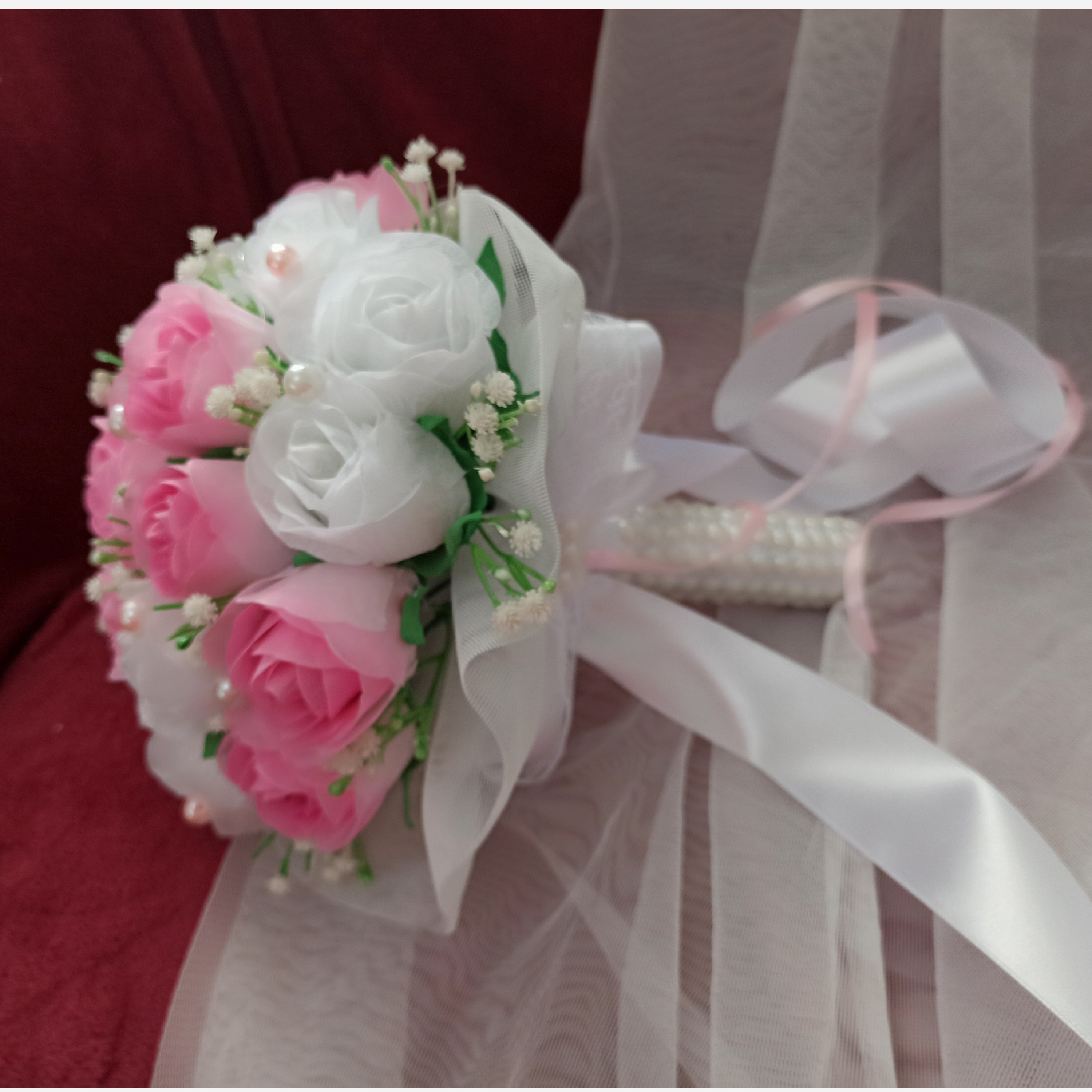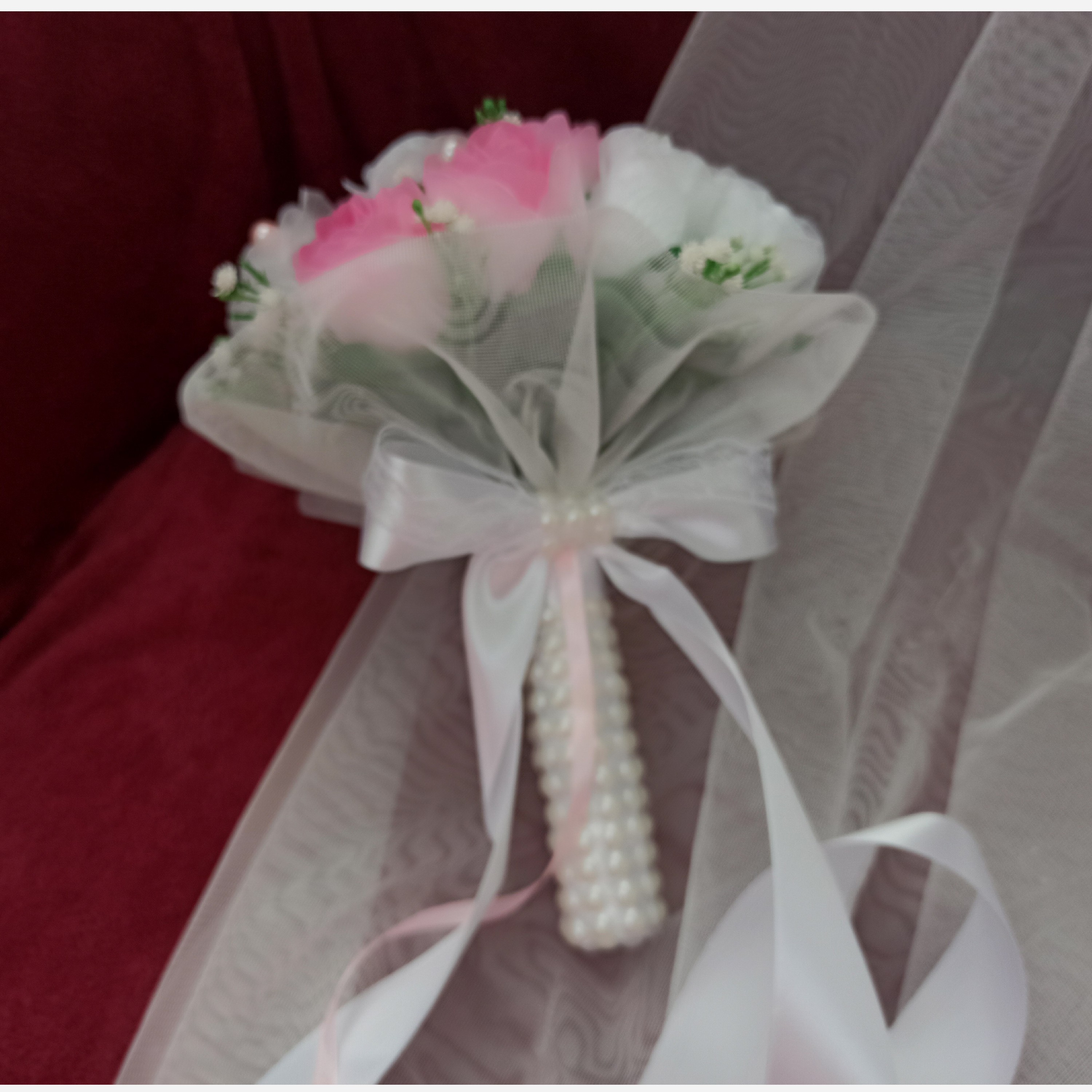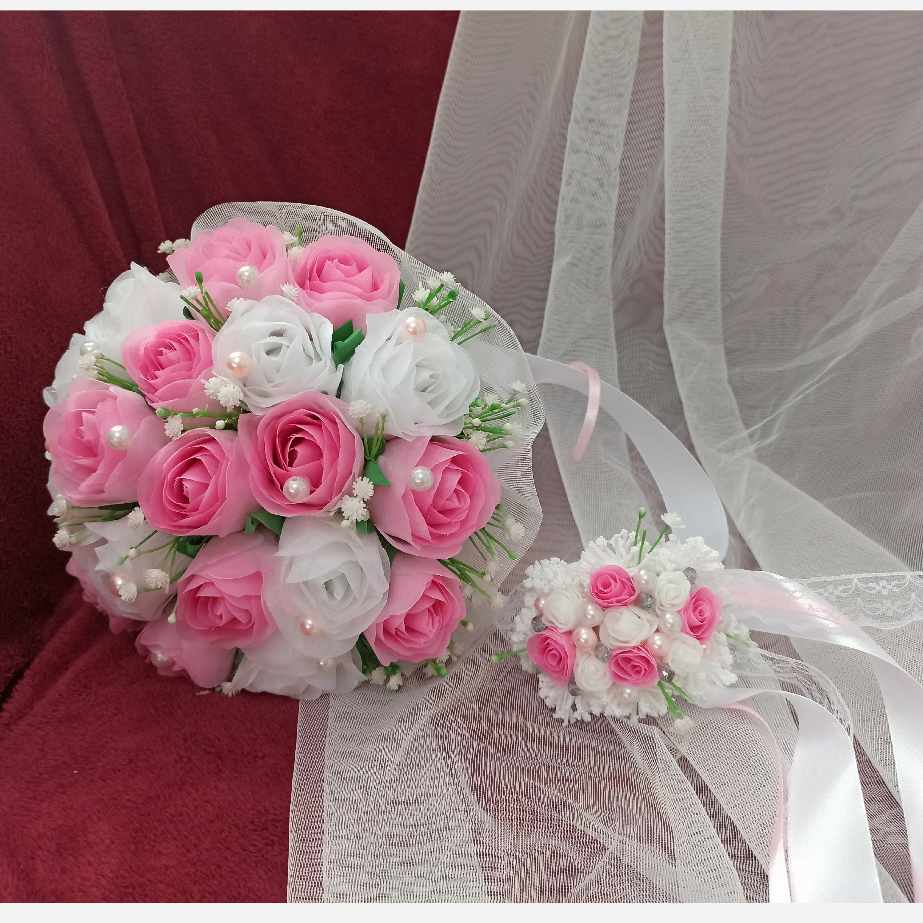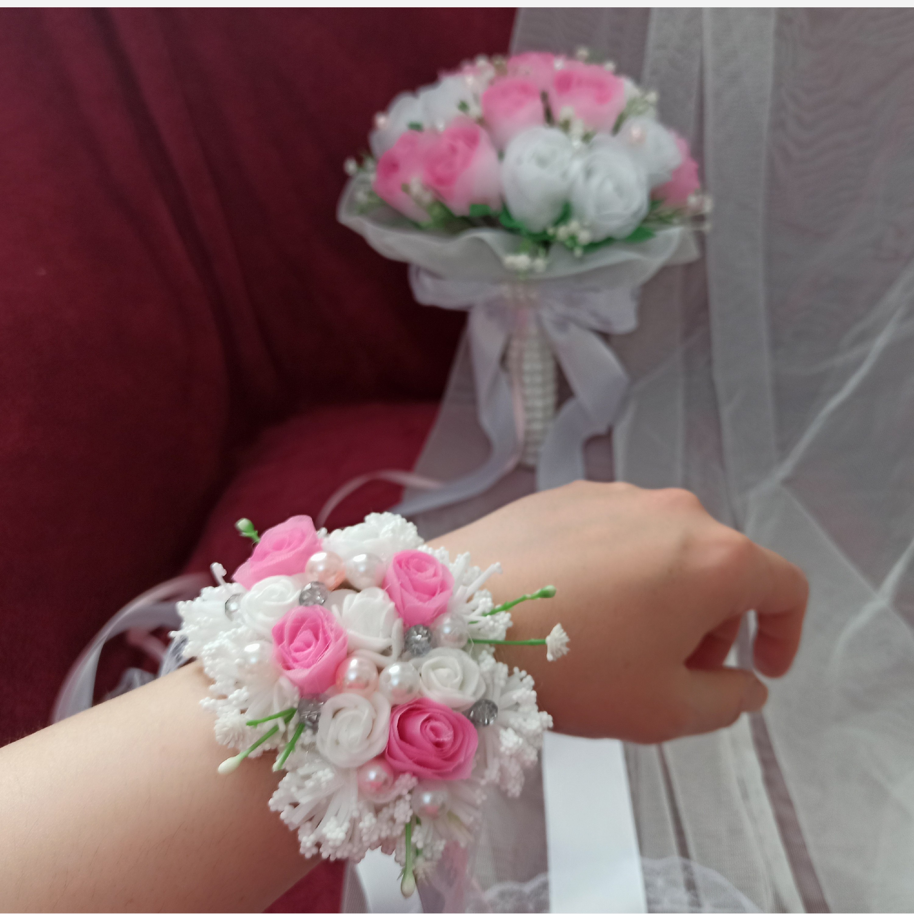 دسته گل سفید و صورتی ودستبند گل عروس مناسب عقد و عروسی ونامزدی، حنابندان ،فرمالیته ، آتلیه ،... ❤️تزیین شده با تور وروبان ومروارید 🎀 و 19 شاخه گل رز ❤️جنس گلها از گلبرگ پارچهای لمسی هستند و قابل شستشو ❤️ بهمراه گل کت داماد بعنوان هدیه
