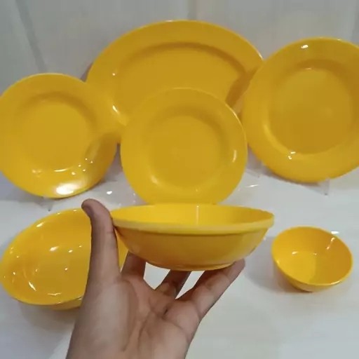سرویس 37 پارچه ملامین رنگی رنگ زرد مارک شیرکوه یزد دارای استاندارد شامل 6 عدد برنج خوری 6 عدد خورشت خوری 6 عدد ماست خوری 6 میوه خوری 6 تا آبگوشت خوری یک نفره 6 تا ترشی خوری 1 عدد دیس دارای استاندارد رنگ های نارنجی و صورتی و سبز هم در غرفه موجود هست