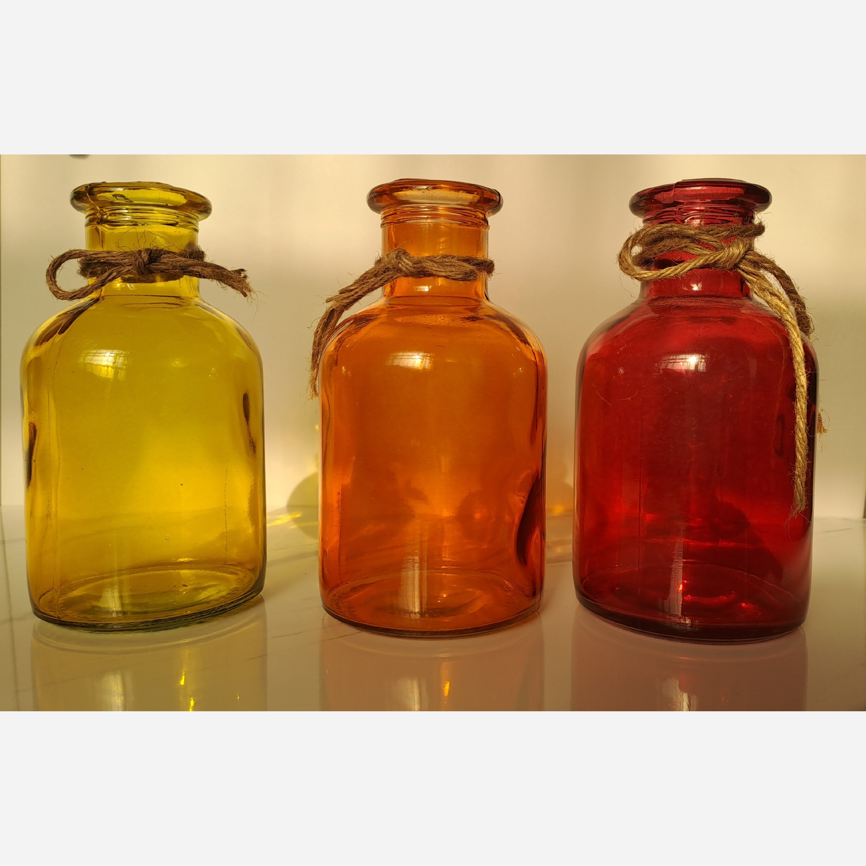 بطری شیشه ای ویال رنگی گلدان شیشه ای دهنه گشاد کوتاه 300 سی سی رنگ ثابت قابل شستشو چوب پنبه به طور کامل کیپ می شود و نشتی ندارد. مناسب برای روغن، آبلیمو،عطر، عسل، تزیین آشپزخانه رنگها: قرمز، نارنجی، زرد، آبی، سبز، صورتی