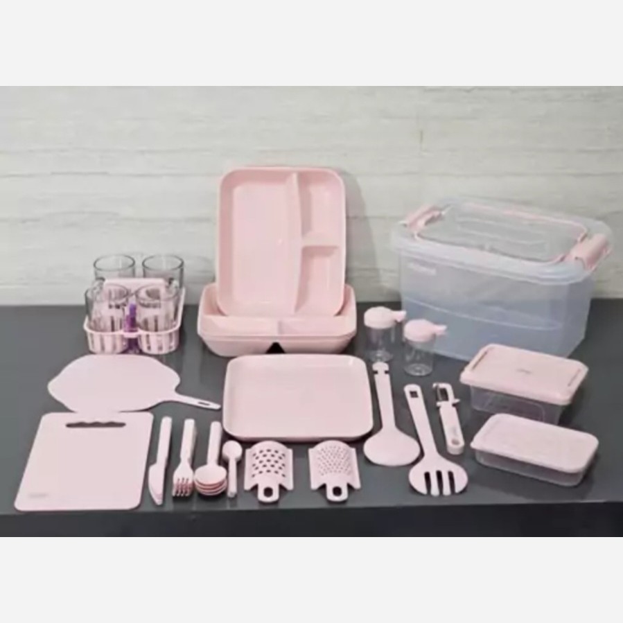 یک سبد/ یک سینی جای لیوان/ شش عدد لیوان فرانسوی/ یک عدد فندک/ شش عدد بشقاب/ یک عدد بادبزن/ شش عدد قاشق غذا خوری/شش عدد چنگال/ شش عدد چاقو/ شش عدد قاشق چایخوری/یک عدد کفگیر/بک عدد ملاقه/ یک عدد پوست کن/یک جفت نمکدان/یک عدد دیس پلو خوری/ دو عدد ظرف دردار نگهدارنده/یک عدد تخته گوشت/ دو عدد رنده یکی ریز و یکی درشت