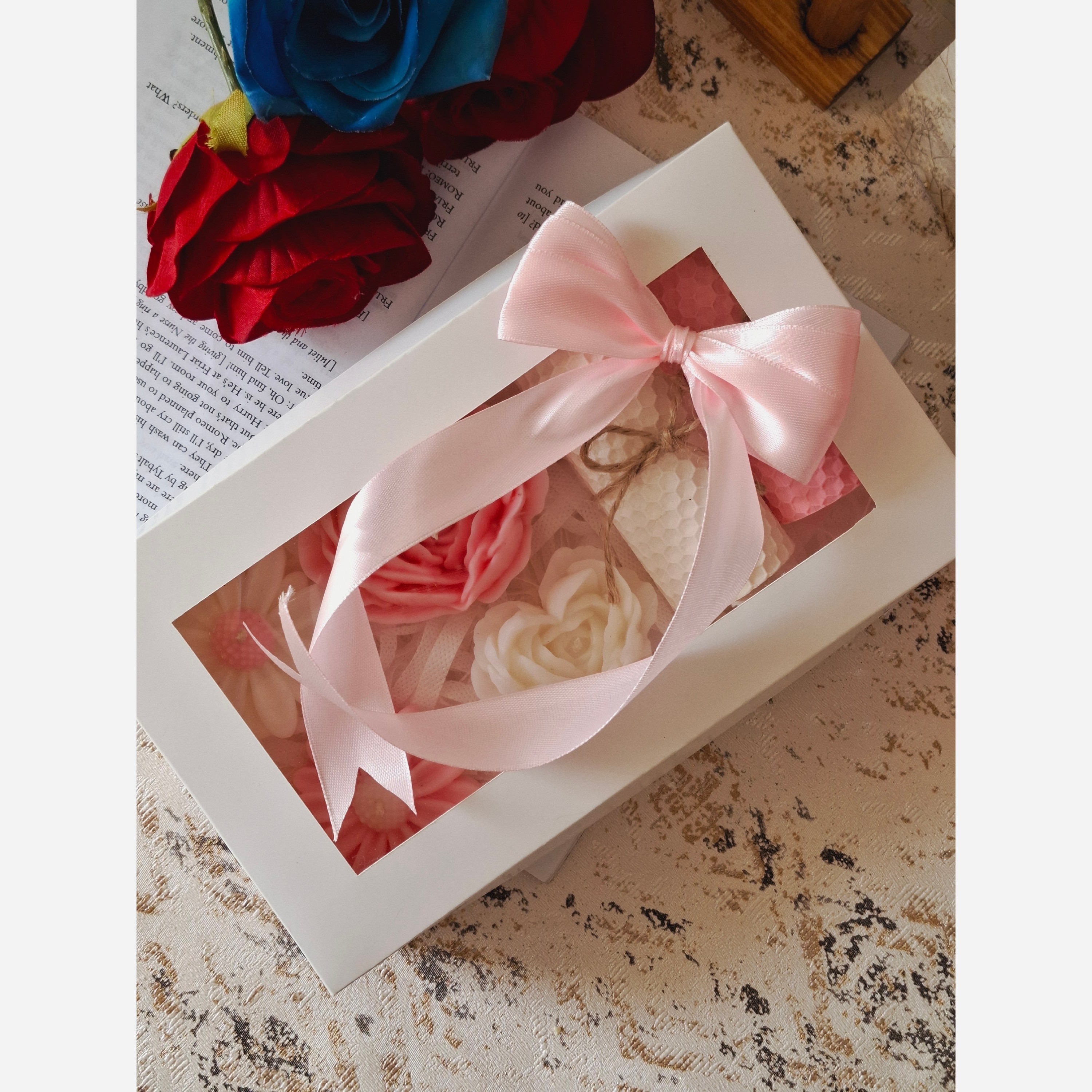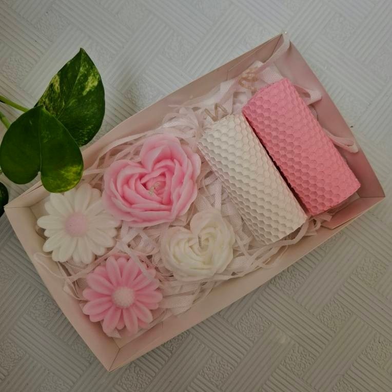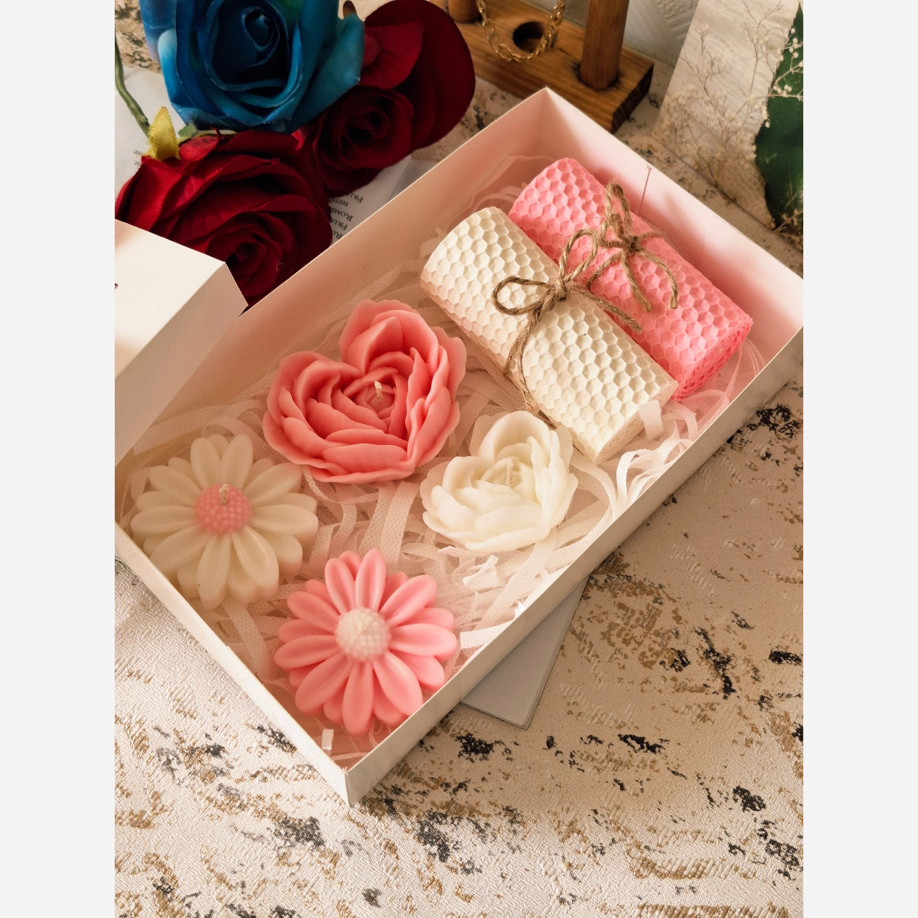 پک هدیه صورتی دو عدد بابونه 6 سانت ، رز قلبی 6 و 8 سانت دو عدد شمع قلمی موم عسل 9 سانت با قطر 5