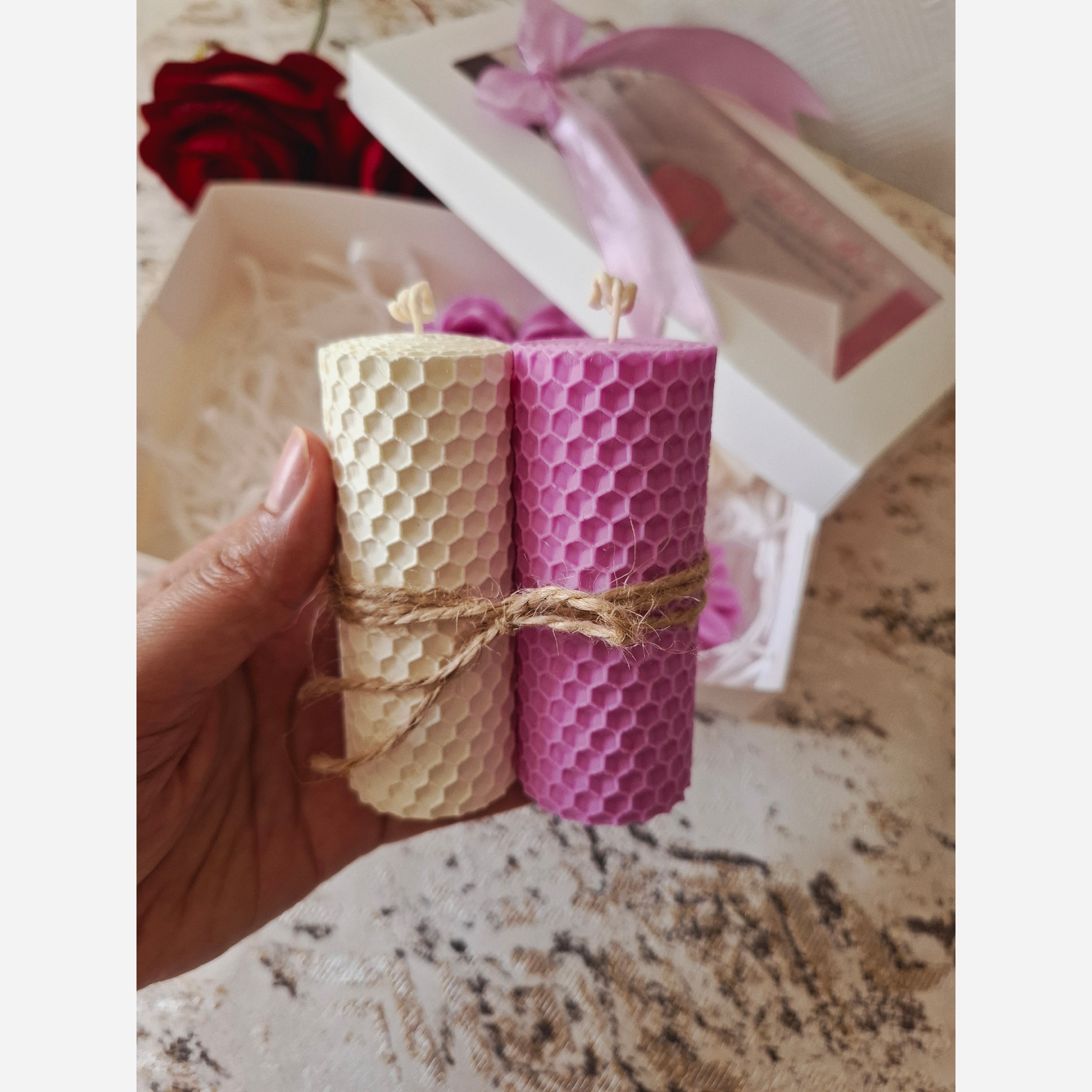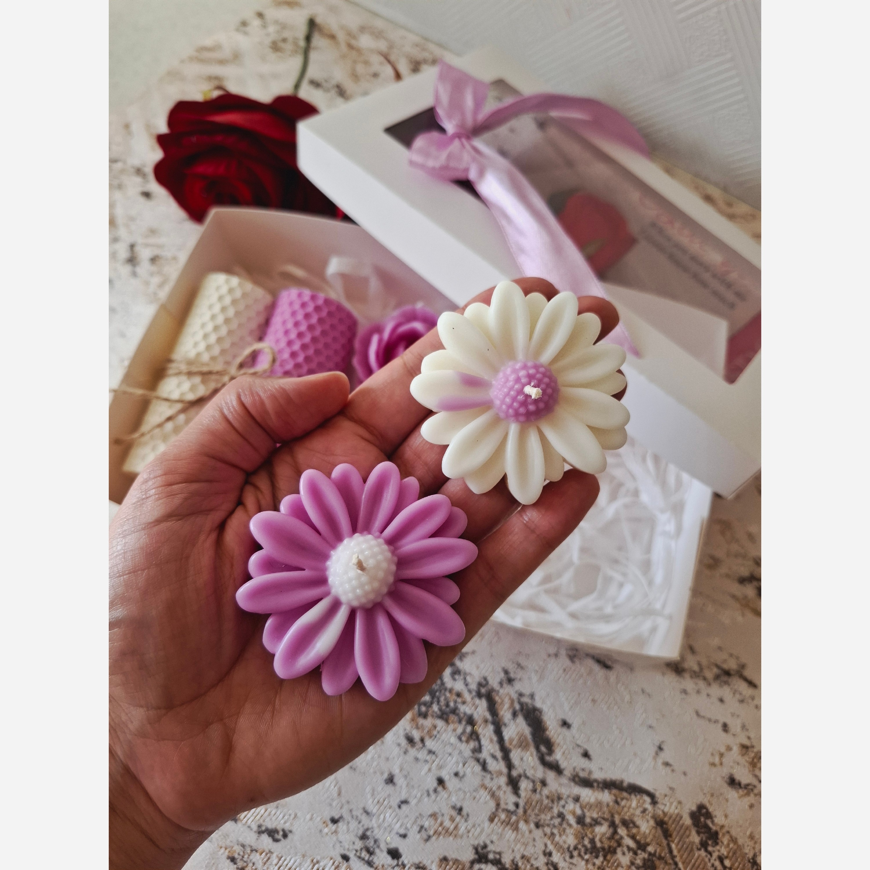 پک هدیه صورتی،شمع بابونه 6 سانت دو عدد، رز قلبی 6 و 8 سانت ، دو عدد قلمی 18 سانت موم عسل با قطر 5 سانت