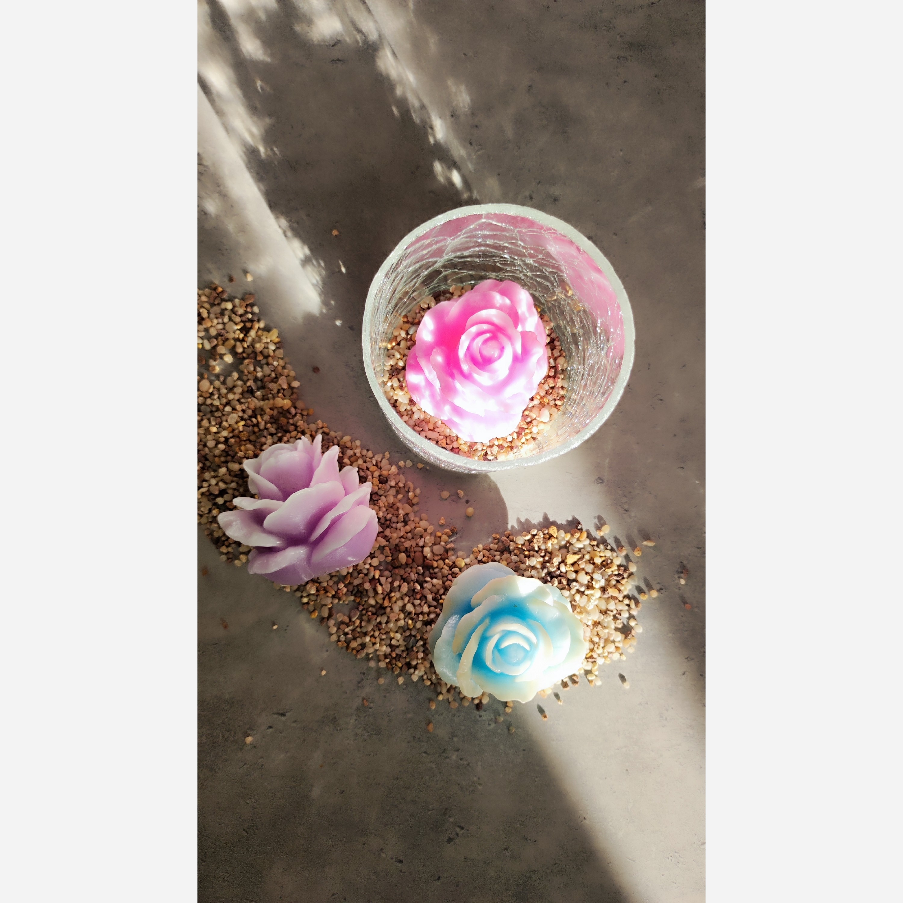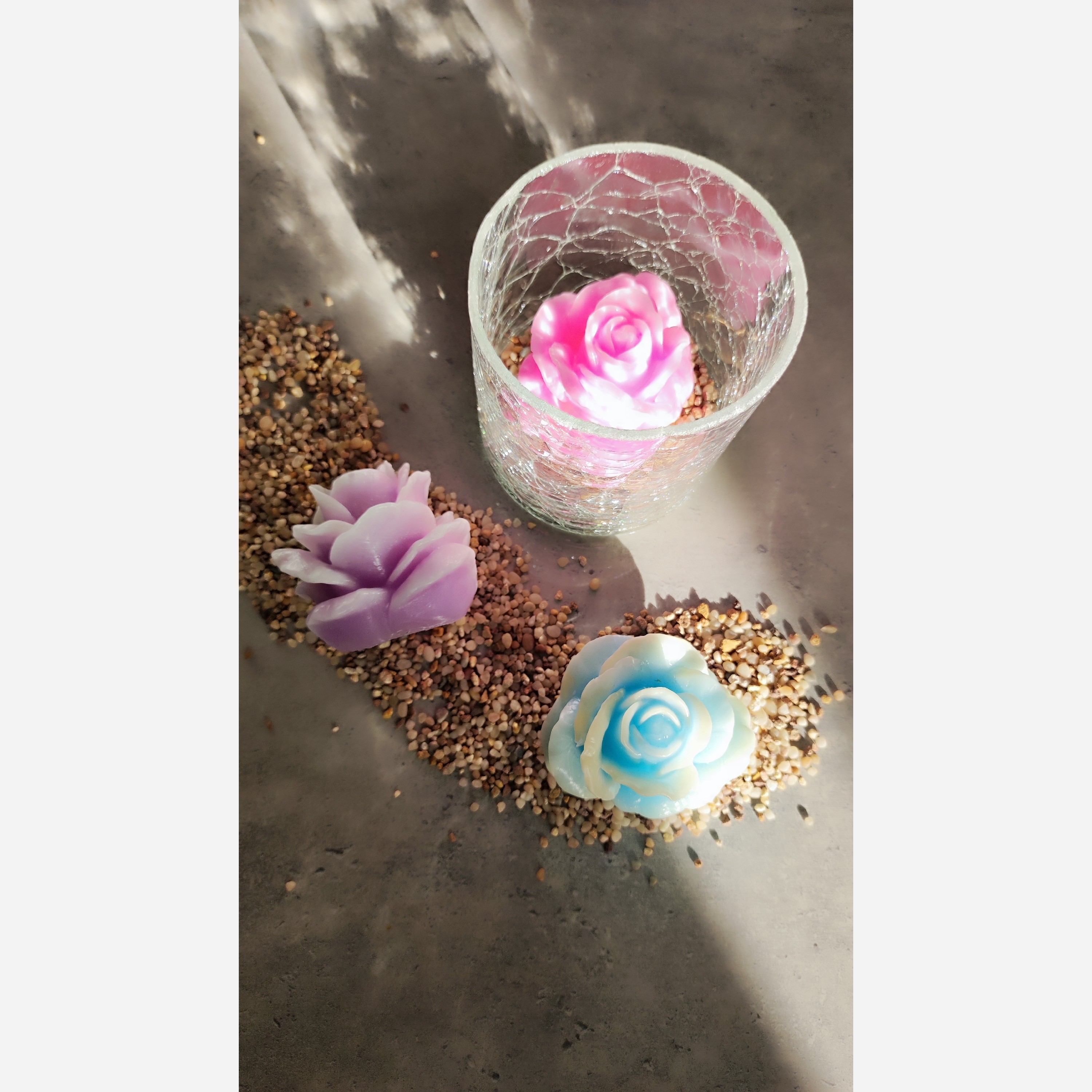 پک جار گل شامل جار شیشه ای سه عدد شمع گل رز رنگ بندی طبق سلیقه ی شما یک عدد جار سنگ ریزه شیشه ای همراه سنگ ریزه