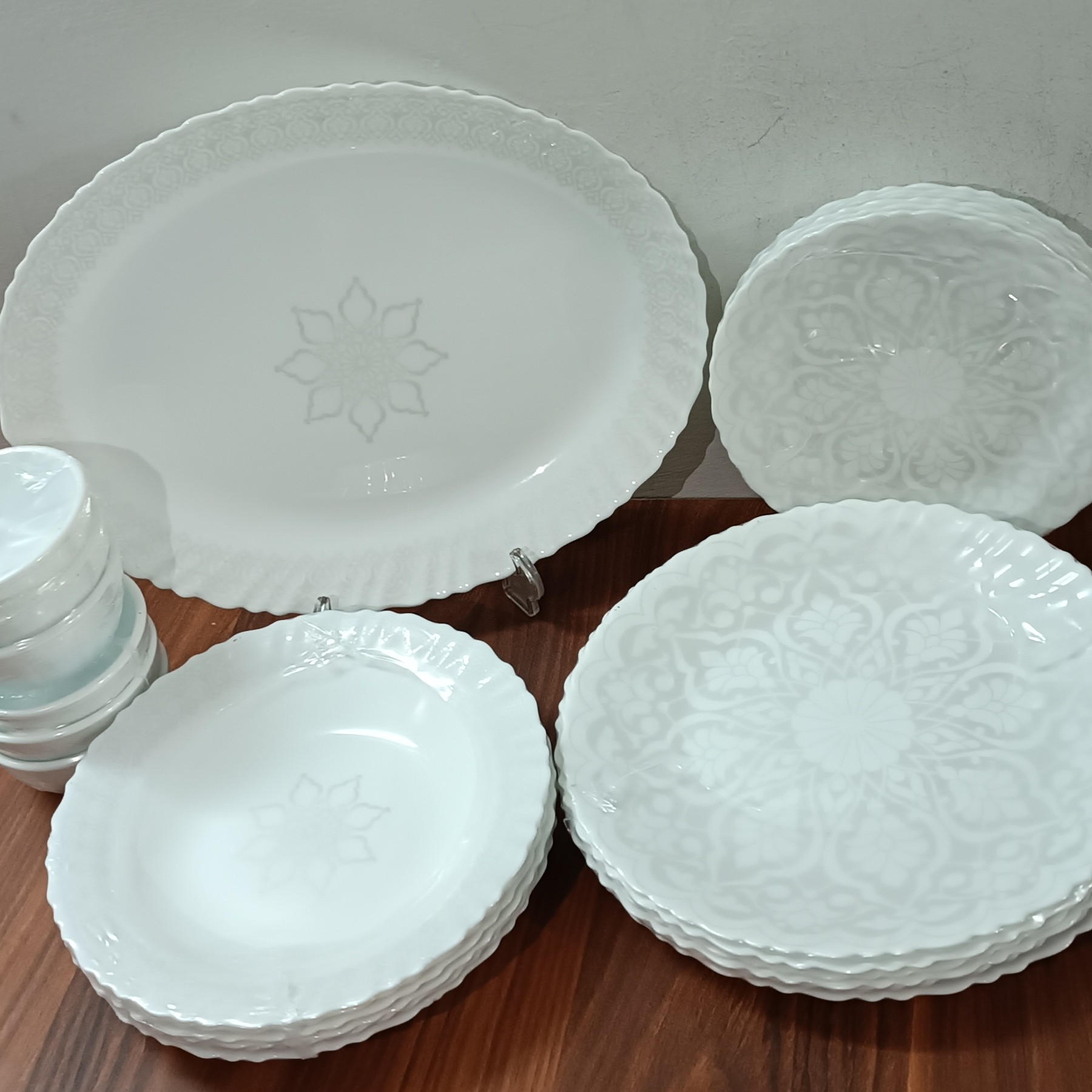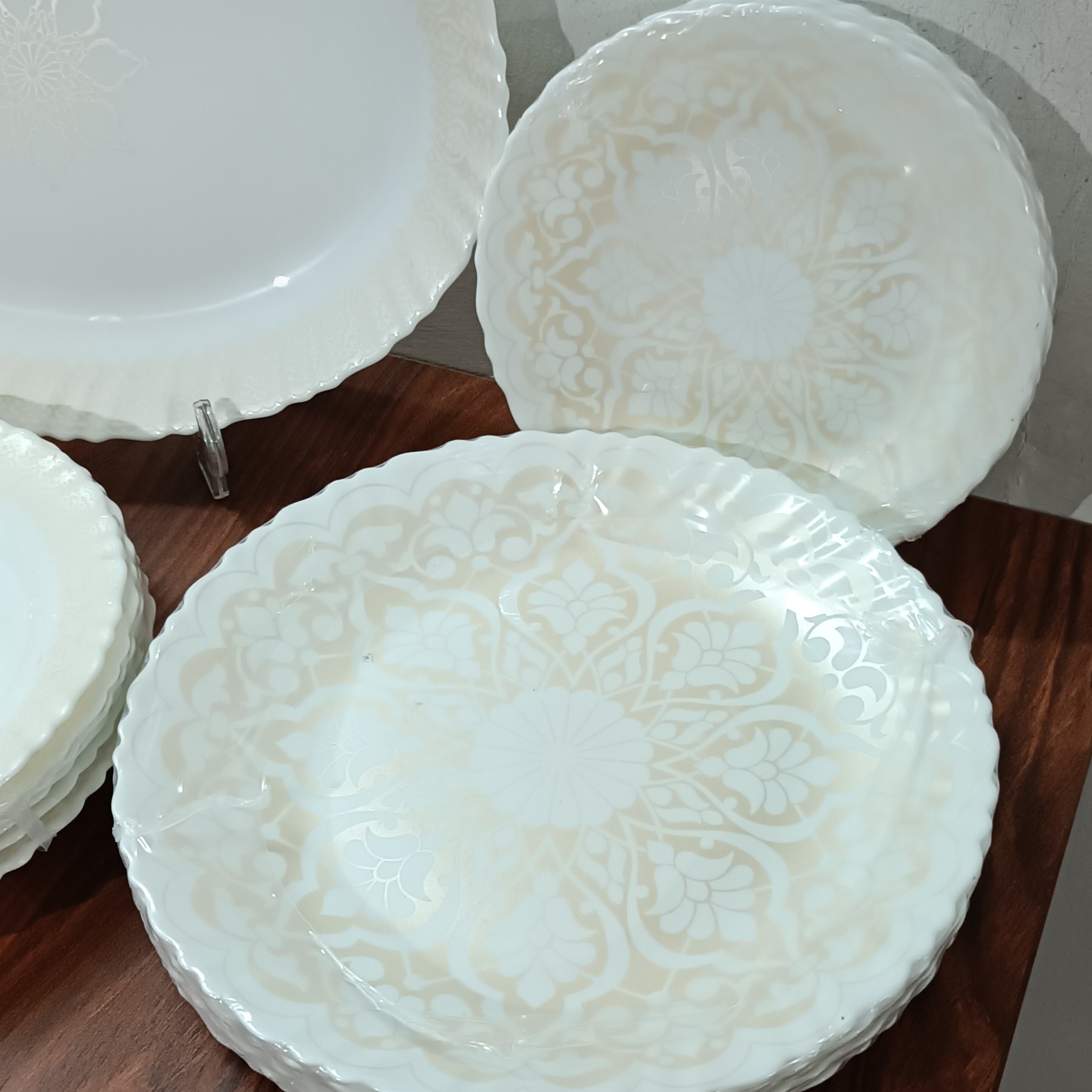 آرکوپال لب پیچ کد 28009 برند دینو قابلیت استفاده در ماشین ظرفشویی و مایکروفر 25 پارچه شامل شش پلو و خورشت خوری و پیاله ماستی و پیش دستی ویک عدد دیس زیبا و شیک در دورنگ طلایی نقره ای