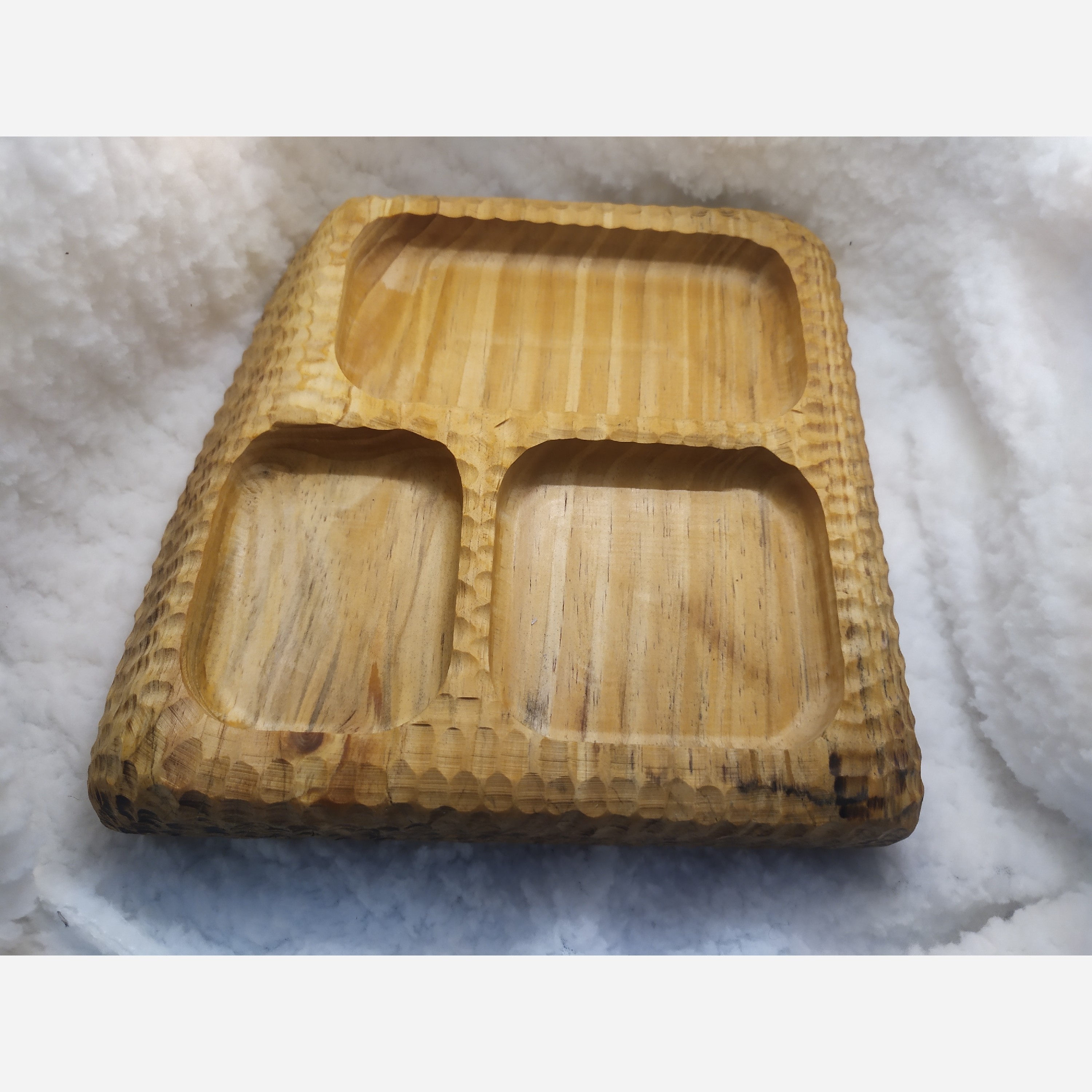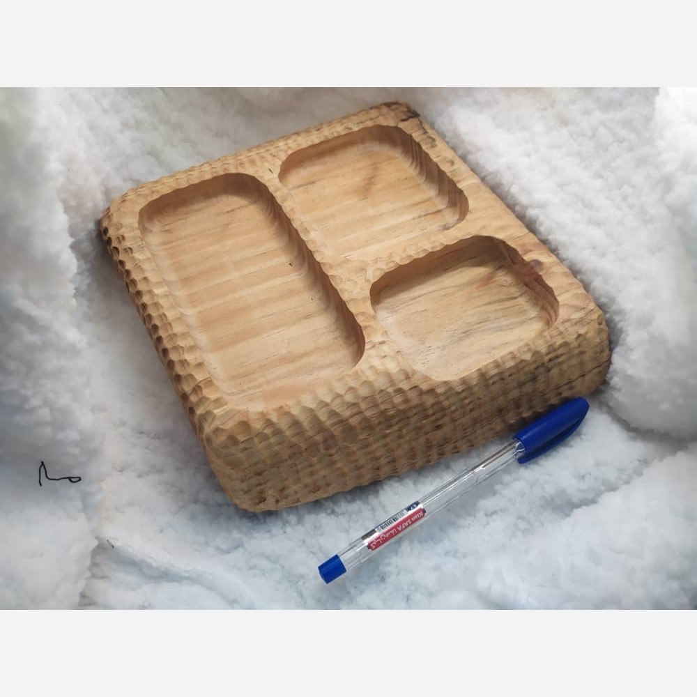 ظرف چوبی پذیرایی کاملا دست ساز چوب کاج عمق خانه ها 18 میلیمتر ابعاد ظرف : 20 در 21 سانت قطر : حدود 4 سانت این ظرف کاملا دست ساز است و برای ساخت و تزیین آن زمان بسیاری صرف شده است یک نسخه بیشتر تولید نشده است
