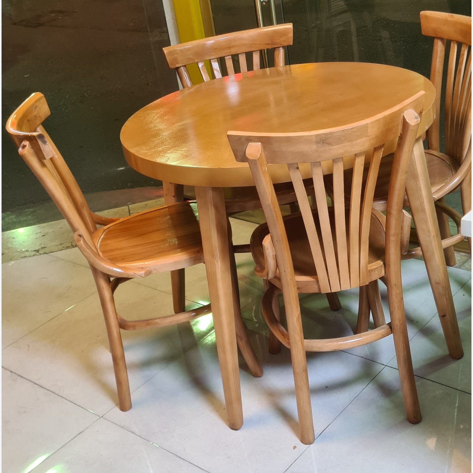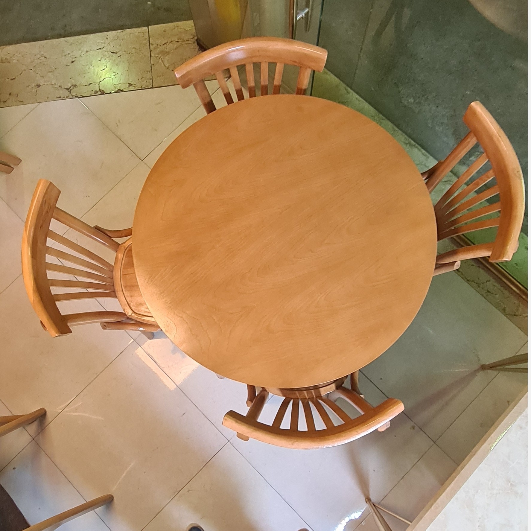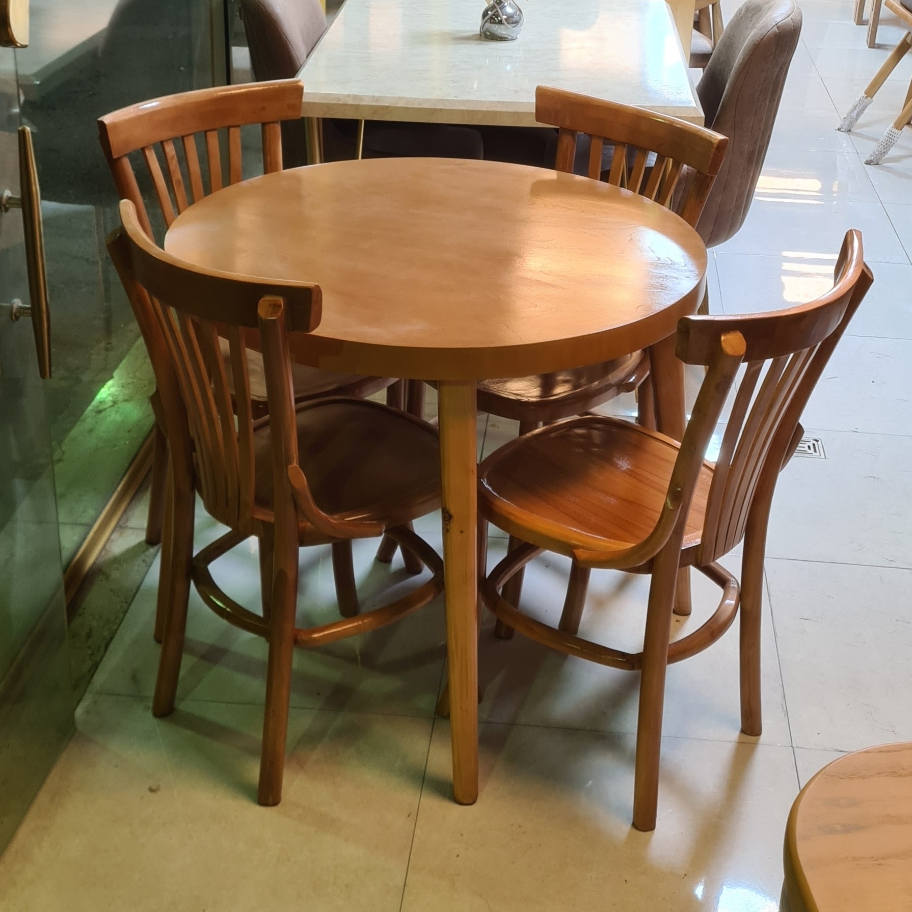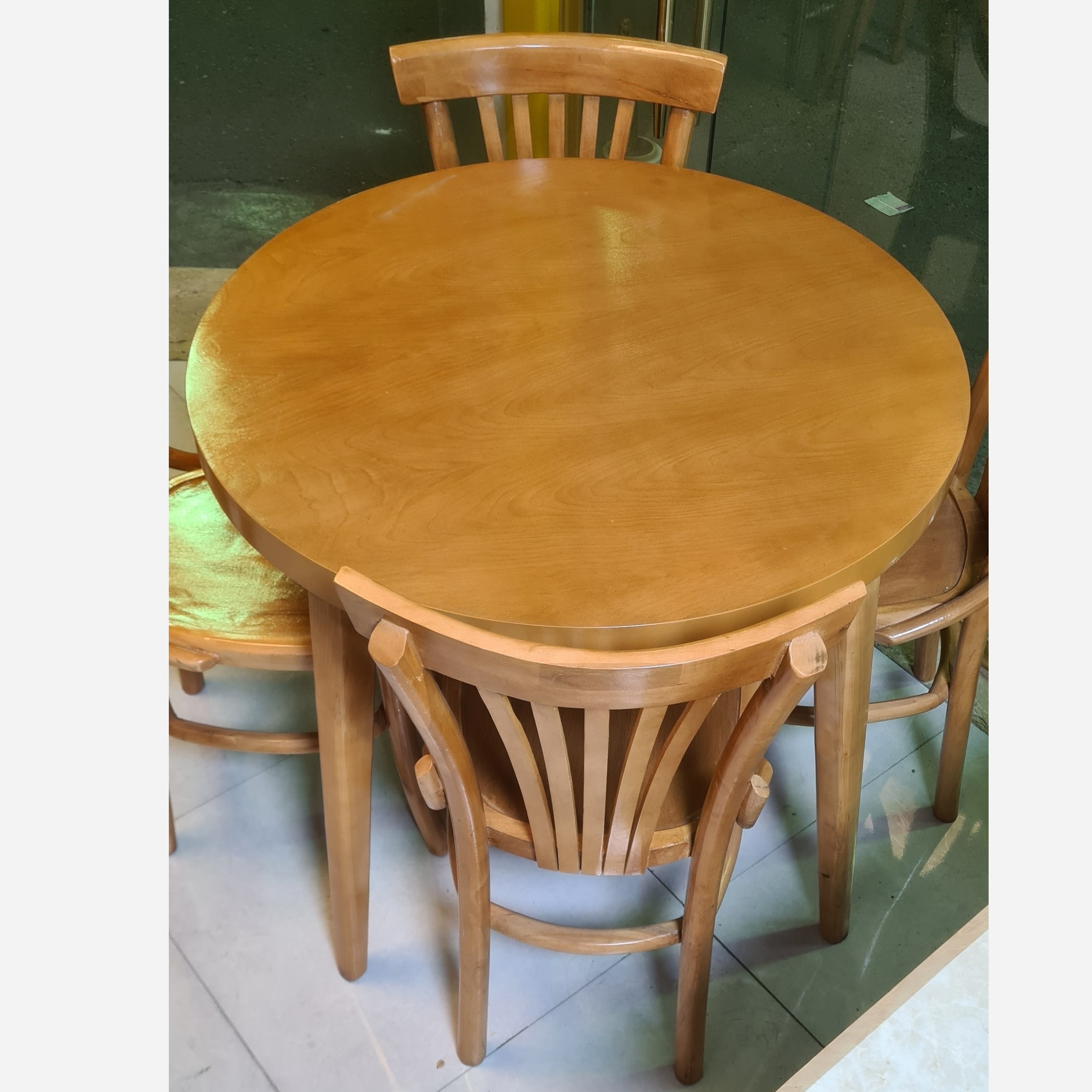 میز و صندلی ناهار خوری 4 نفره مدل لهستانی 5 تیرک ⭕️نکتهی مهم : این مدل کار شرکتی است و با کار های کارگاهی مقایسه نکنید🙏 🟢جنس صفحه میز: MDF روکش راش 🟢جنس پایه میز : چوبه روسی 🟢پایه میز به صورت پیچو مهره ای است و قابلیت بازو بسته شدن از صفحه را دارد 🟢ابعاد صفحه میز: قطر میز 90 سانتیمتر 🔴جنس چوبه صندلی: صددرصد چوبه توسکا 🔴رنگ چوب : فندقی تیره 🔴رنگ بندی چوب: فندقی تیره و فندقی روشن موجوده و رنگ های دیگه هم قابل سفارشه 🟣برای تغییره رنگه چوب 10 الی 14 روز کاری زمان لازمه 🟣هزینه و باربری و اسنپ به عهده مشتری عزیز میباشد🌹❤️ رضایت شما هدف ماست ✅️