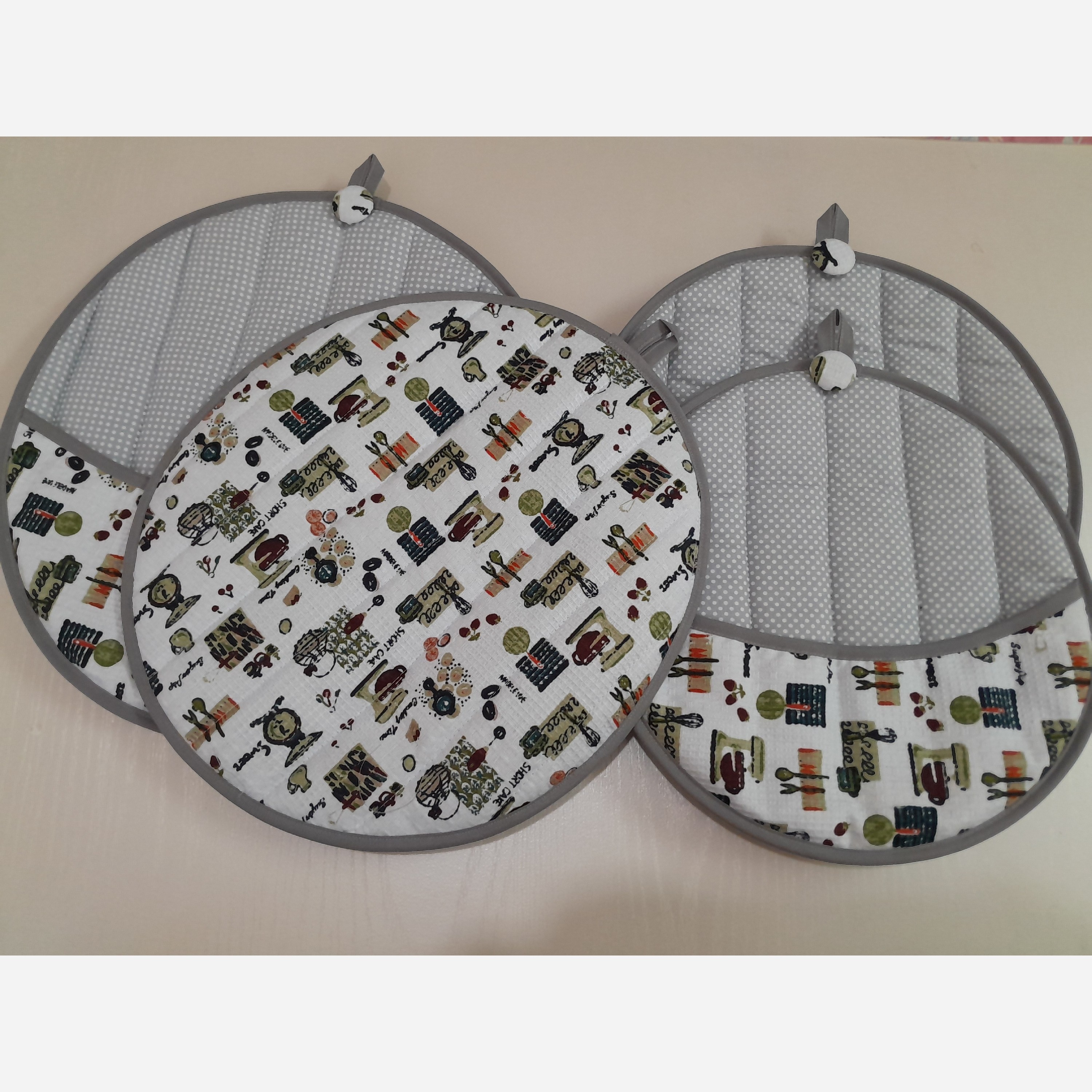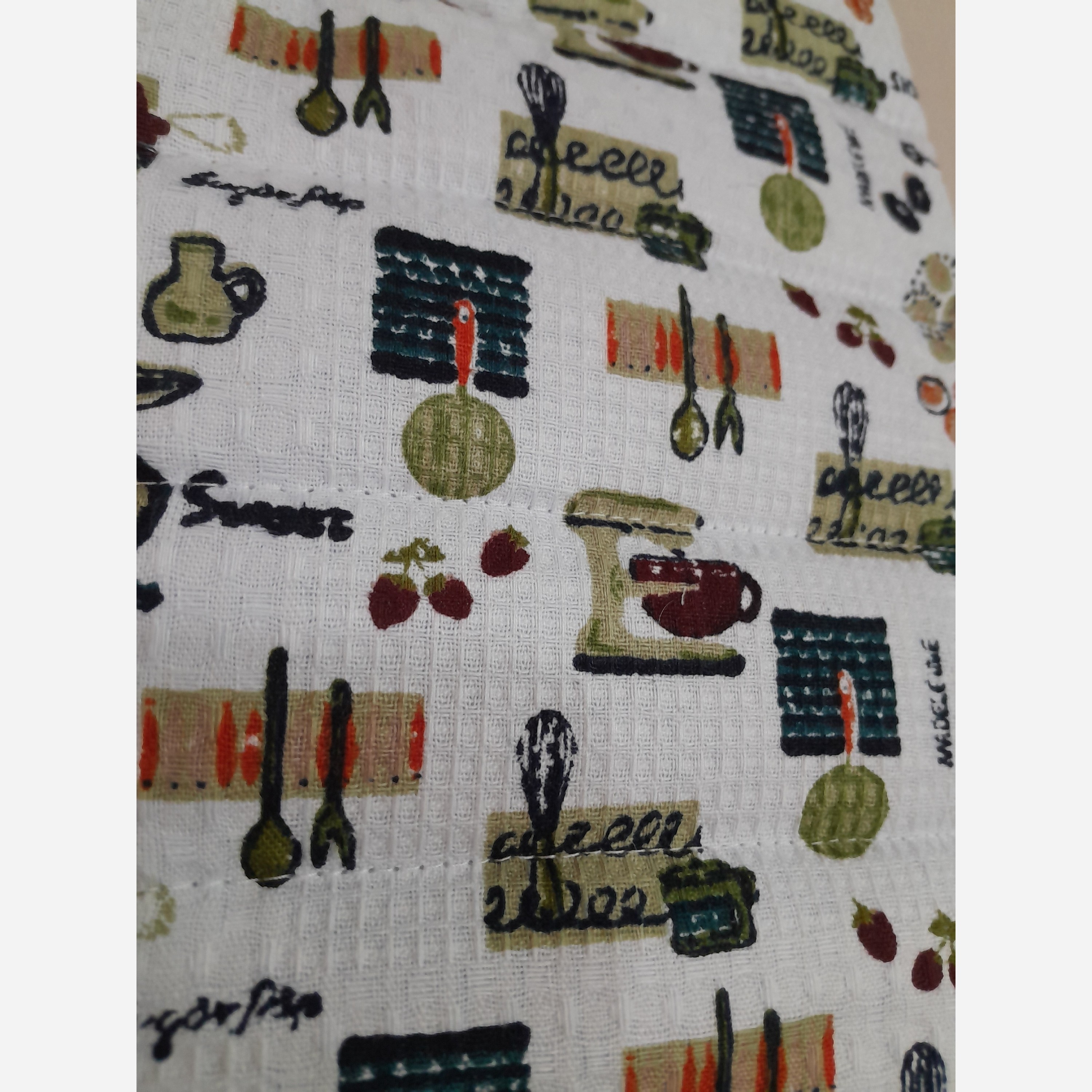 پارچه مصرفی در این محصول از جنس کتان نخ می باشد که 100٪پنبه ای بوده وعلاوه بر مقاوم بودن در برابر حرارت قابلیت جذب بالای بخار آب را دارد و در بین دو لایه از این پارچه پشم شیشه فشرده استفاده شده که آنهم در جذب رطوبت تاثیر به سزایی دارد و این محصول با نوار اریب کتان تزئین شده که علاوه بر زیباتر شدن محصول در برابر حرارت نیز مقاوم می باشد. تجربه یک آشپزی دلپذیر را با محصولات تکمیل کنید.