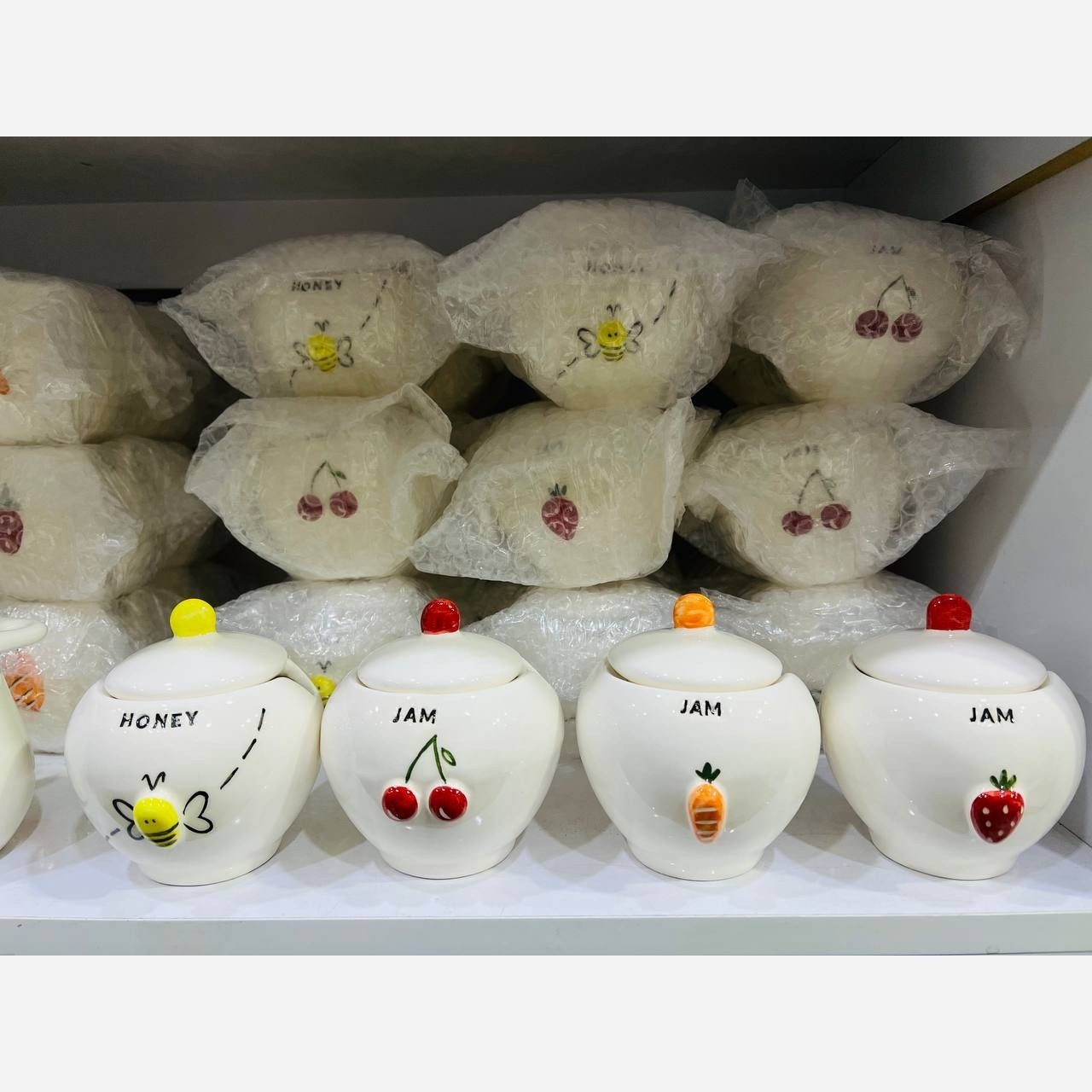 ظروف مربا و عسل سرامیکی برجسته دو مدل استوانه ای و تپل کیفیت عالی 🍎🍓🍒🥕