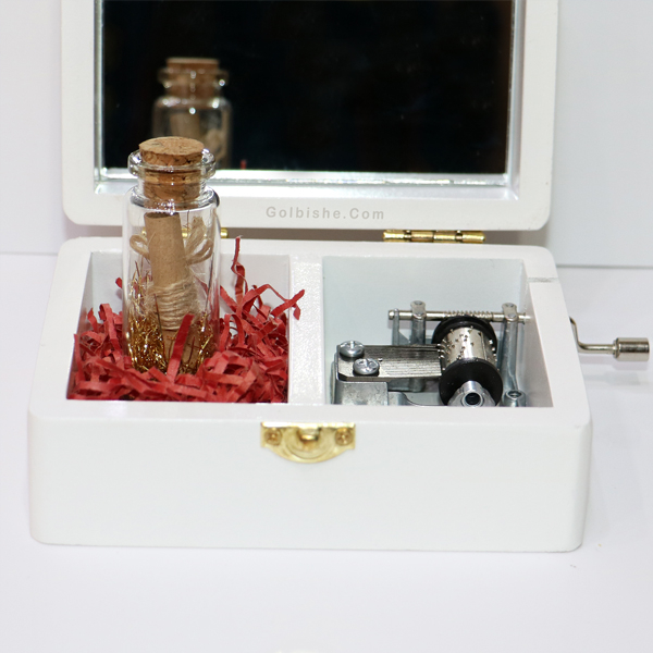 جعبه موزیکال Happy Love از جنس چوب مستحکم و کیفیت بالا ، بسیار مناسب هدیه برای دختران خوش پسند است . این جعبه موزیکال آینه دار برای گذاشتن لوازم آرایشی و جواهرات خانمها با سلیقه عالیست . عکس چاپ شده روی درب آن با طرح عاشقانه ، هدیه شما خاص تر کرده است . برای تامین تمام سلیقه ها و خاص پسند ها ، مدل های متنوعی از جعبه های موزیکال ارائه کرده است . ما درون این جعبه موزیک دار ، شیشه حاوی نامه لول شده برای نوشتن متن شما قرار داده ایم .
