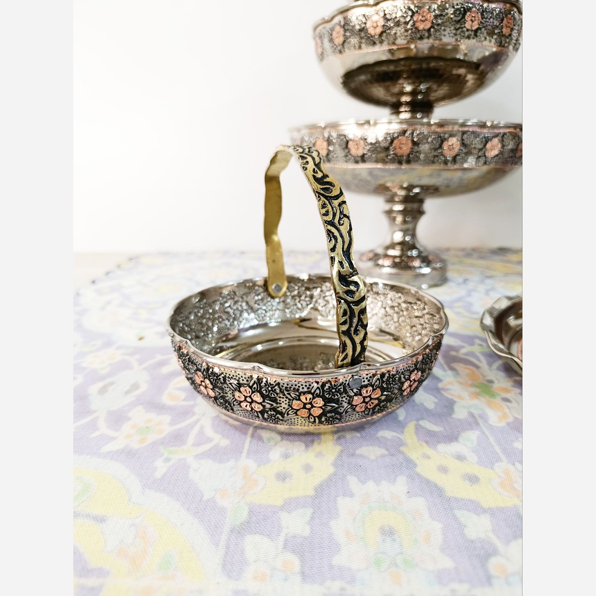 سبد مسی کروم دسته برنجی تراش شده زیبای گلبرگ با گلهای برجسته زیبا نانو مبلمونسرا مدل 277142