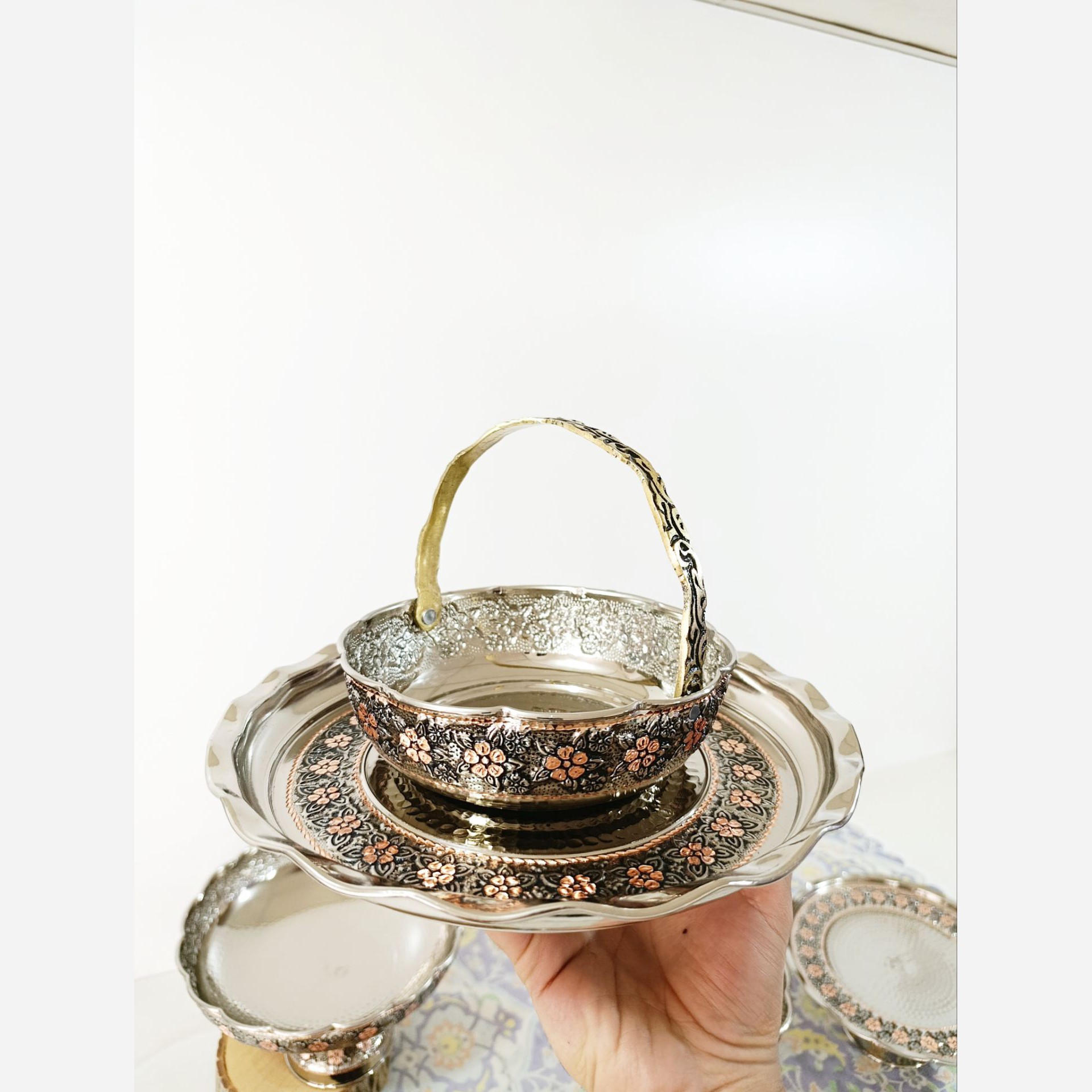 سبد شکلات یا تنقلات مسی کروم شده و تراش و نانو زیبای گلبرگ دسته برنجی کار اعلا درجه یک رنگ ثابت ارسال رایگان