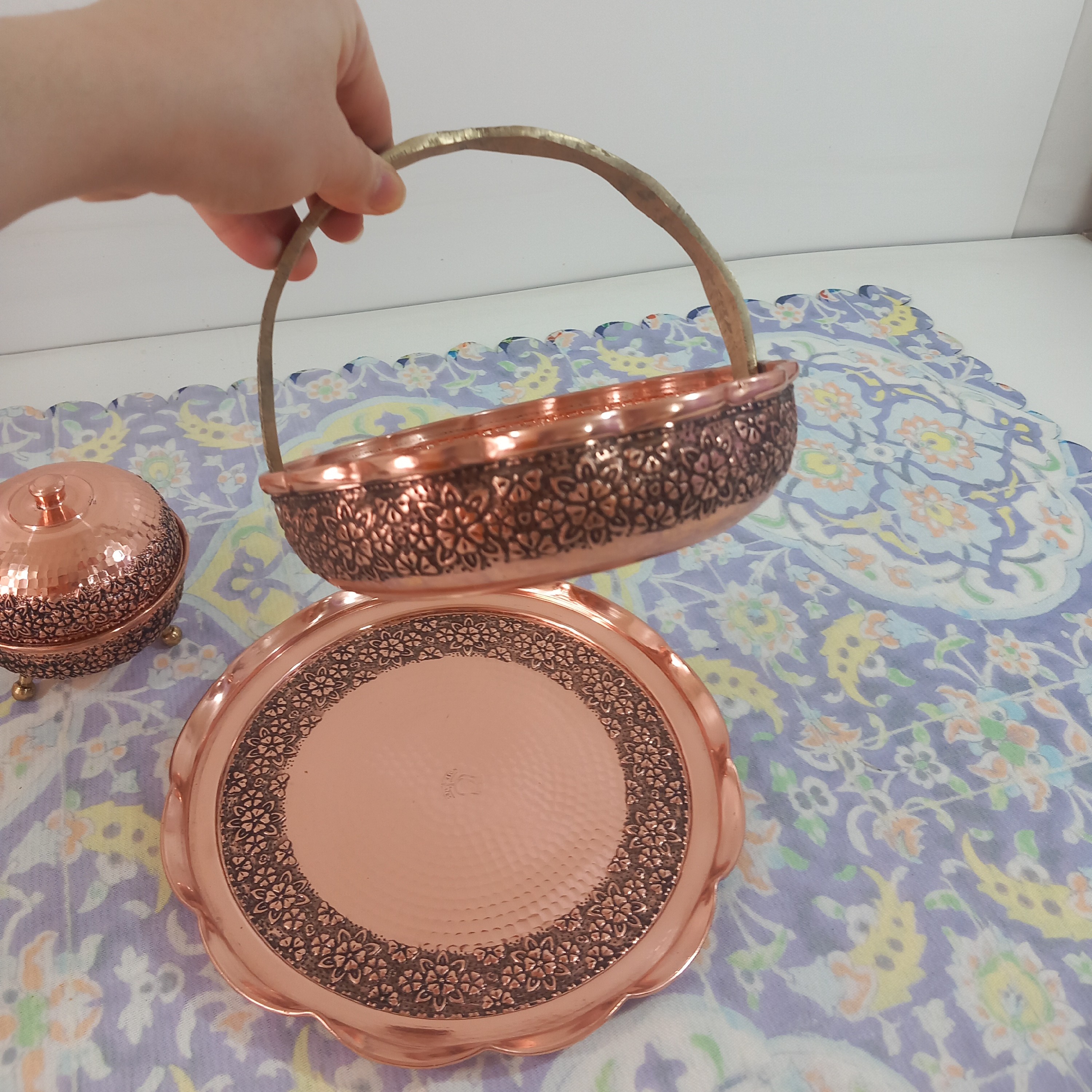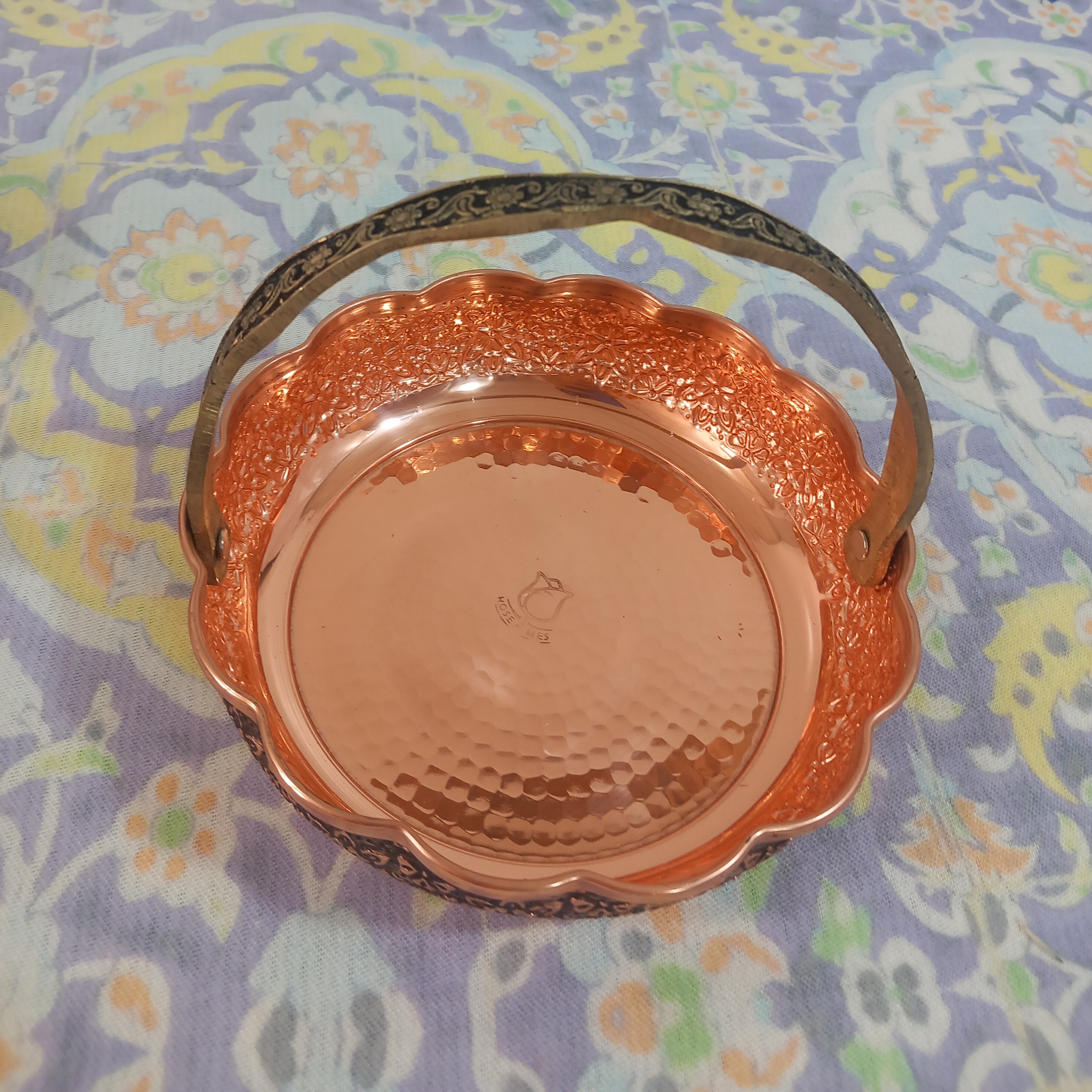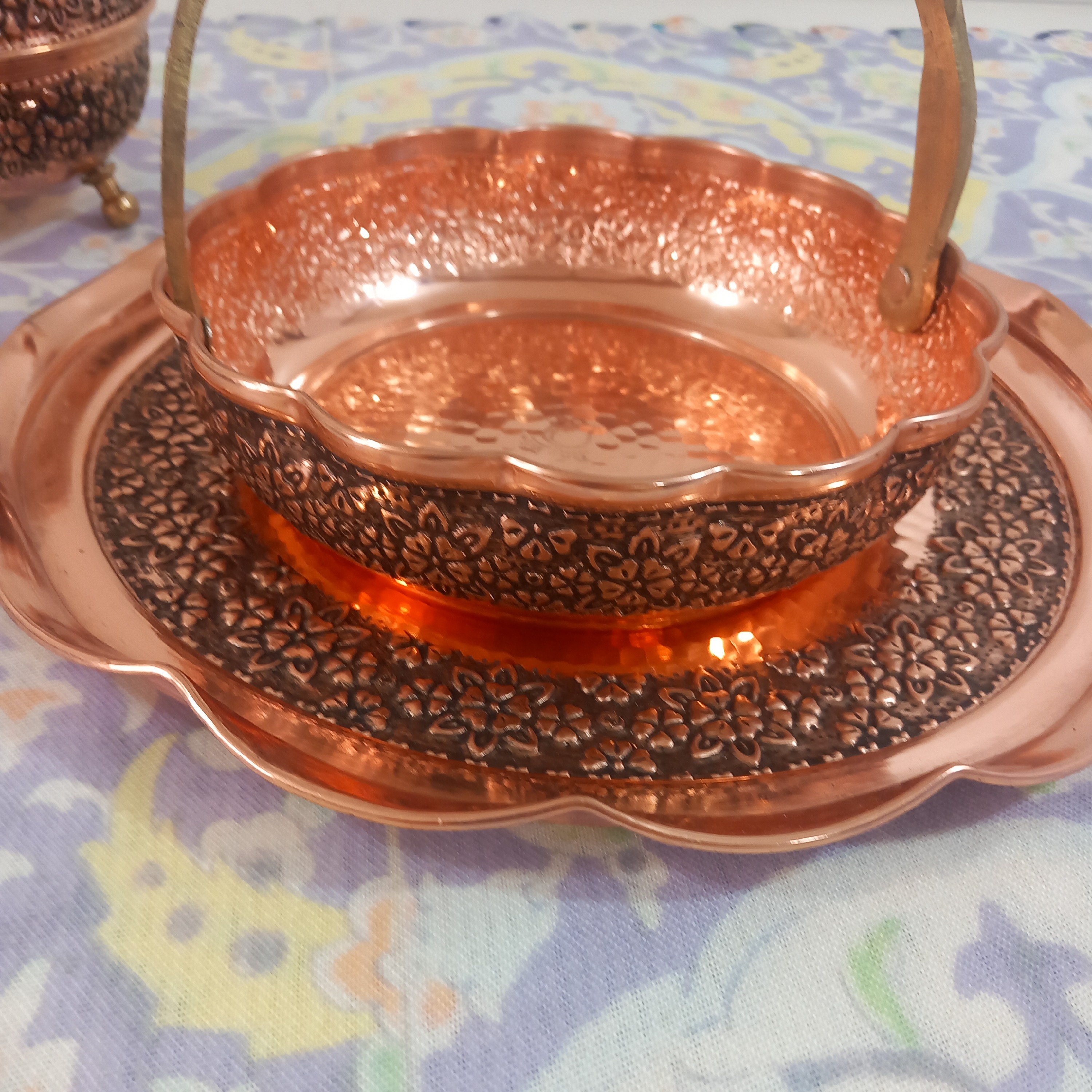 سبد شکلات مسی زیبا با گل های برجسته و سیاه قلم از مس خالص ضخیم ساخته شده شفاف و رو کس نانو شده همیشه شفاف خواهد بود دسته این سبد مسی برنجی کار اعلا درجه یک نانو شده رنگ ثابت ارسال رایگان قطر سبد مسی 18 سانت و ارتفاع 5 سانتی متر است ارسال از زنجان فروش حضوری هم داریم عمده هم می فروشیم