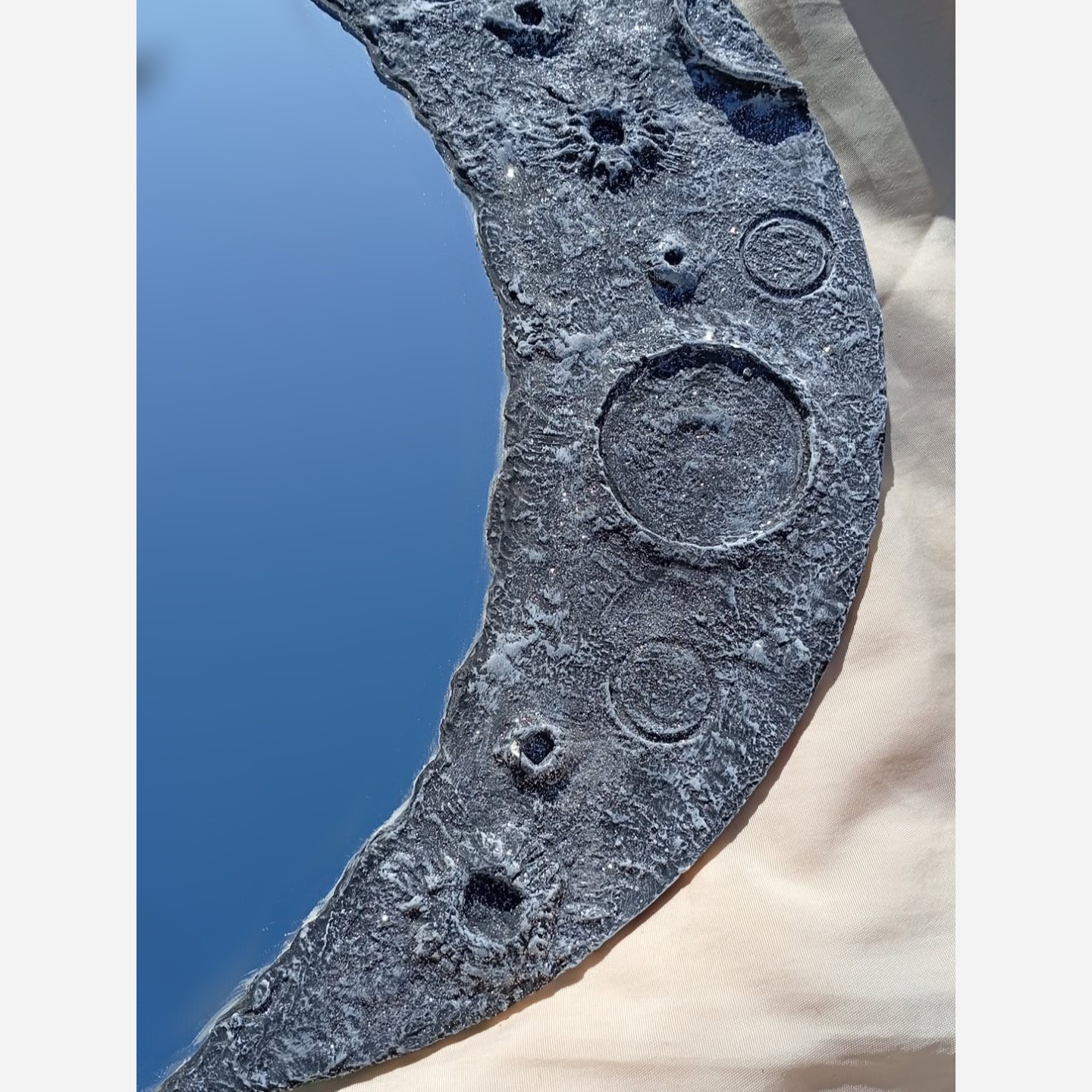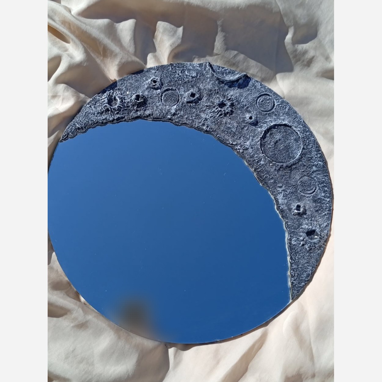 ورق بزن 🫶🏻❤ "یه آینه معمولی نیست🌕… تکهای از ماهه که افتاده روی زمین. با بافتی شبیه سطح ماه و انعکاس آسمون، هر بار نگاش میکنی انگار توی خیال قدم میزنی."🌓🌙✨ آینه ماه قطر: 40 روی کار اکلیل کار شده است 🤌 قابل سفارش در ابعاد مختلف😍🤍 و البته رنگ های ✨ . این آینه ماه قشنگم تقدیمتون میشه 380💰💕 . #آینه_ماه #آینه #ماه #اکسپلور
