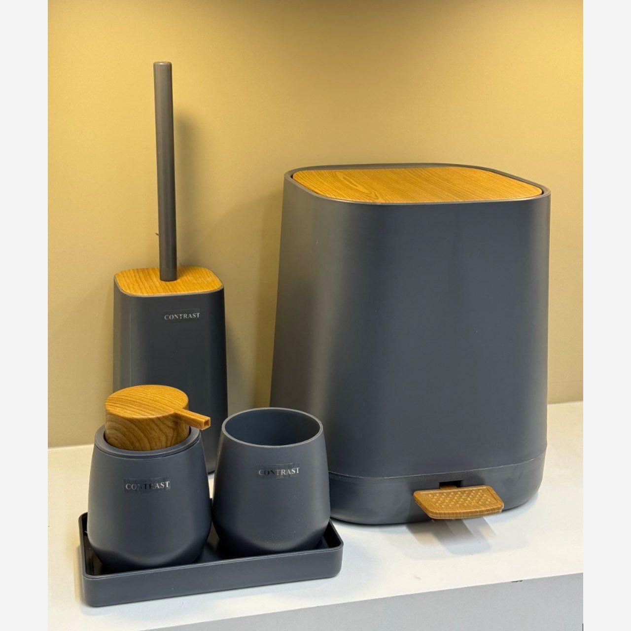 ست 5پارچه مدل 9900چوب طوسی تیره برند کنتراست دارای سطل پدالی ، برس توالت شور،جاصابونی ،جامایع ،جامسواک جزو برترین برندهای حال حاضر کشور نسبت به برندهای خارجی جزو کمترین قیمت با بالاترین کیفیت نسبت به برندهای خارجی مناسب فضاهای حمام ،دستشویی ،جهزیه عروس