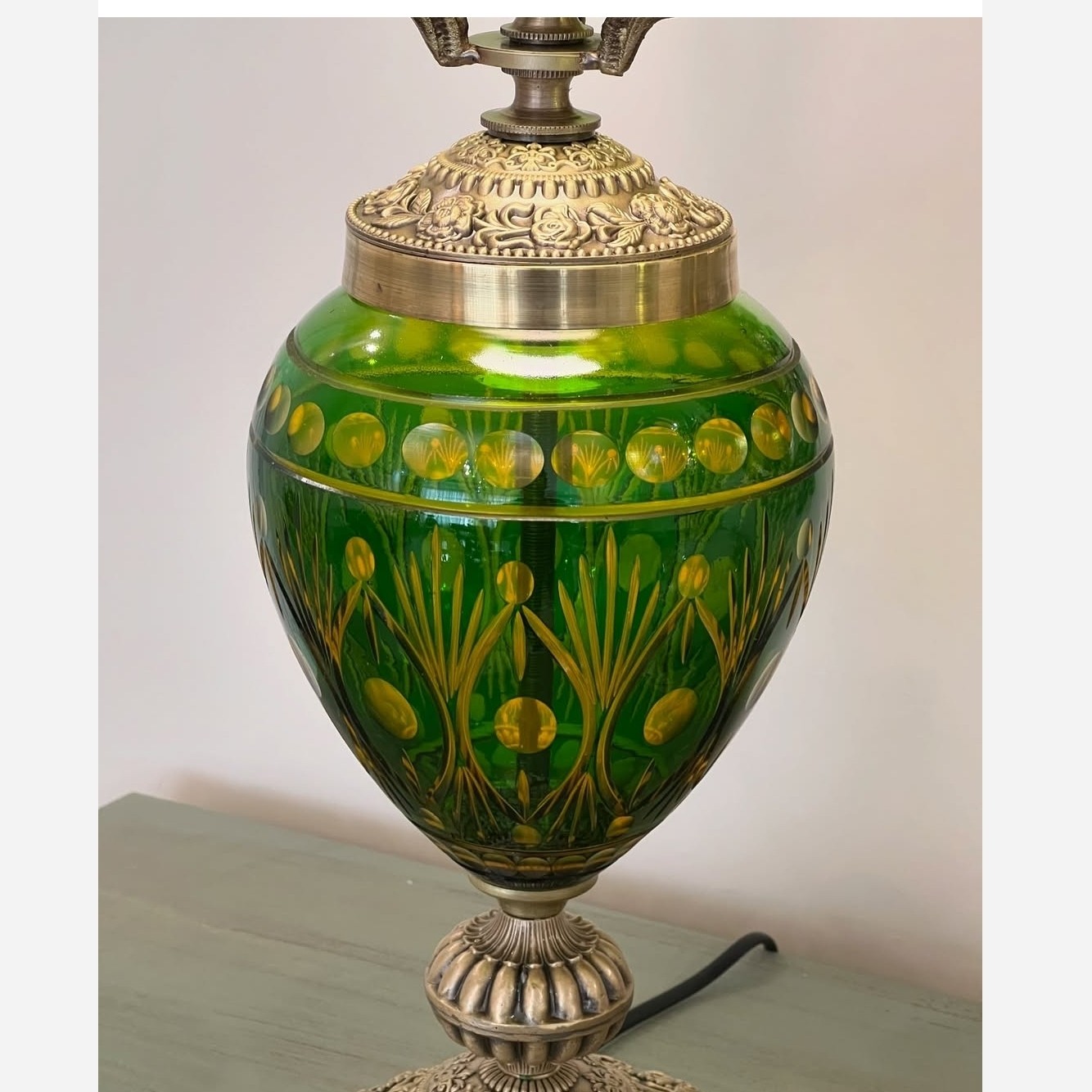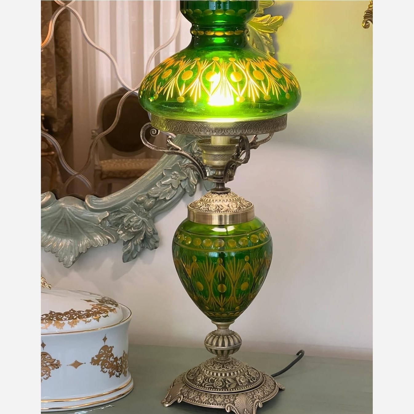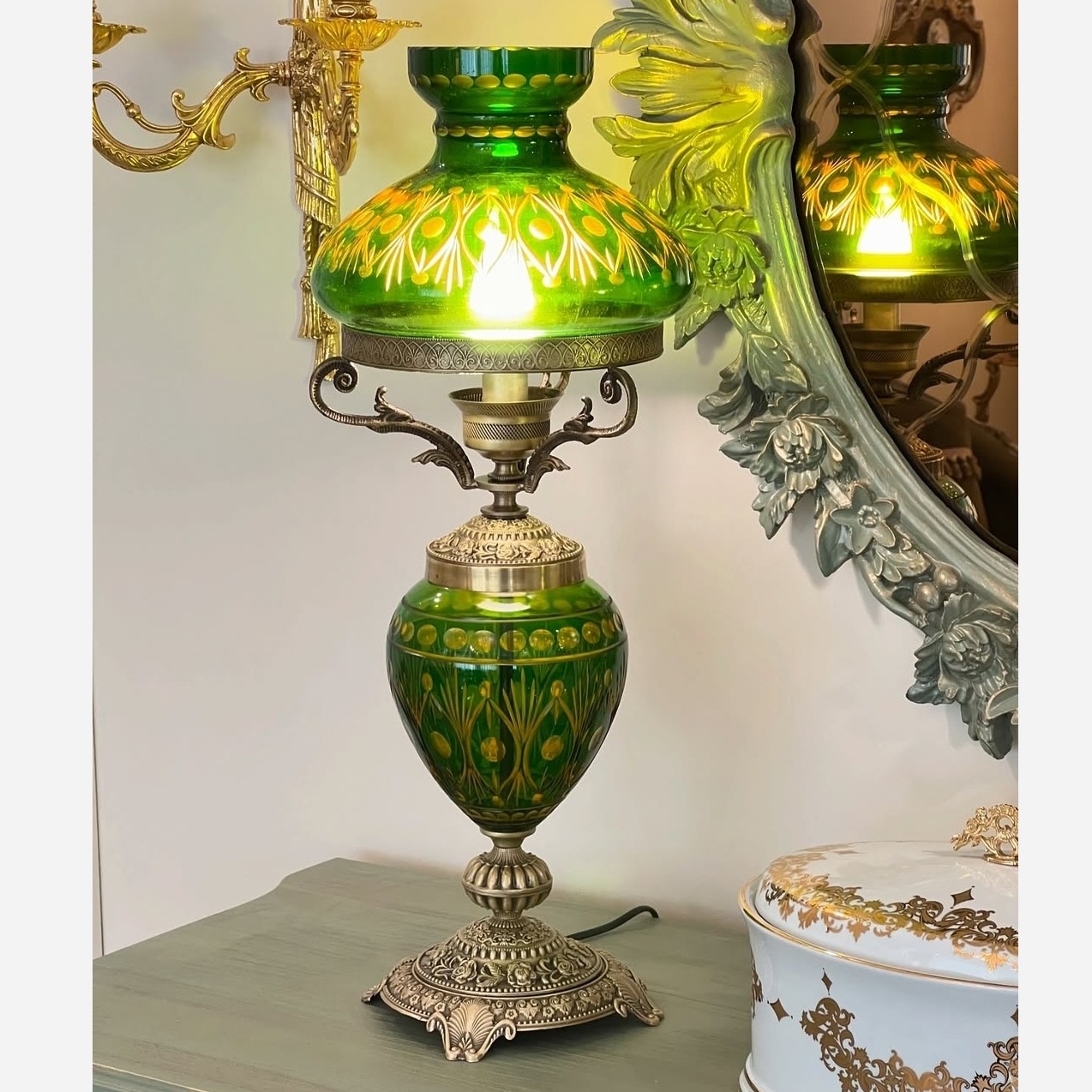 آباژور رومیزی لمپا لنتر چینی برنز سبز شمعدان چراغ درباری چراغ حباب دار قالپاقی برنزی مبلمونسرا مدل 231159