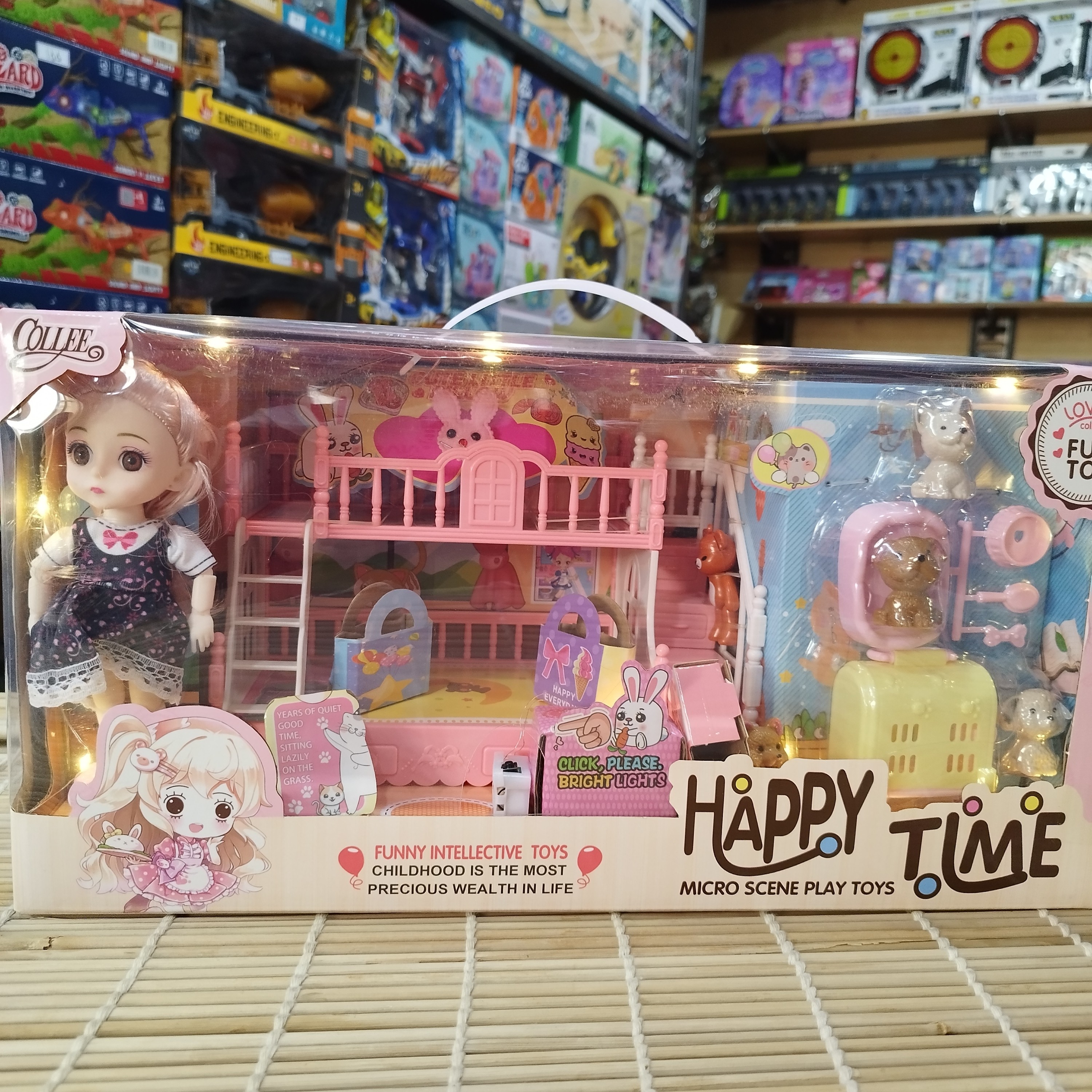 ست اسباببازی Happy Time – مدل اتاق کودک با تخت دوطبقه این ست زیبا شامل یک عروسک دوستداشتنی، تختخواب دوطبقه، میز و صندلی کودک، لوازم جانبی و حیوانات کوچک است. طراحی رنگارنگ و فانتزی آن، کودک را وارد دنیایی از بازیهای تخیلی و مهیج میکند. ویژگیها: مناسب برای کودکان بالای 3 سال شامل عروسک، تخت، میز، صندلی، لوازم کودک و حیوانات،چراغ کمک به رشد خلاقیت و بازیهای نقشآفرینی ساخته شده از مواد باکیفیت و ایمن