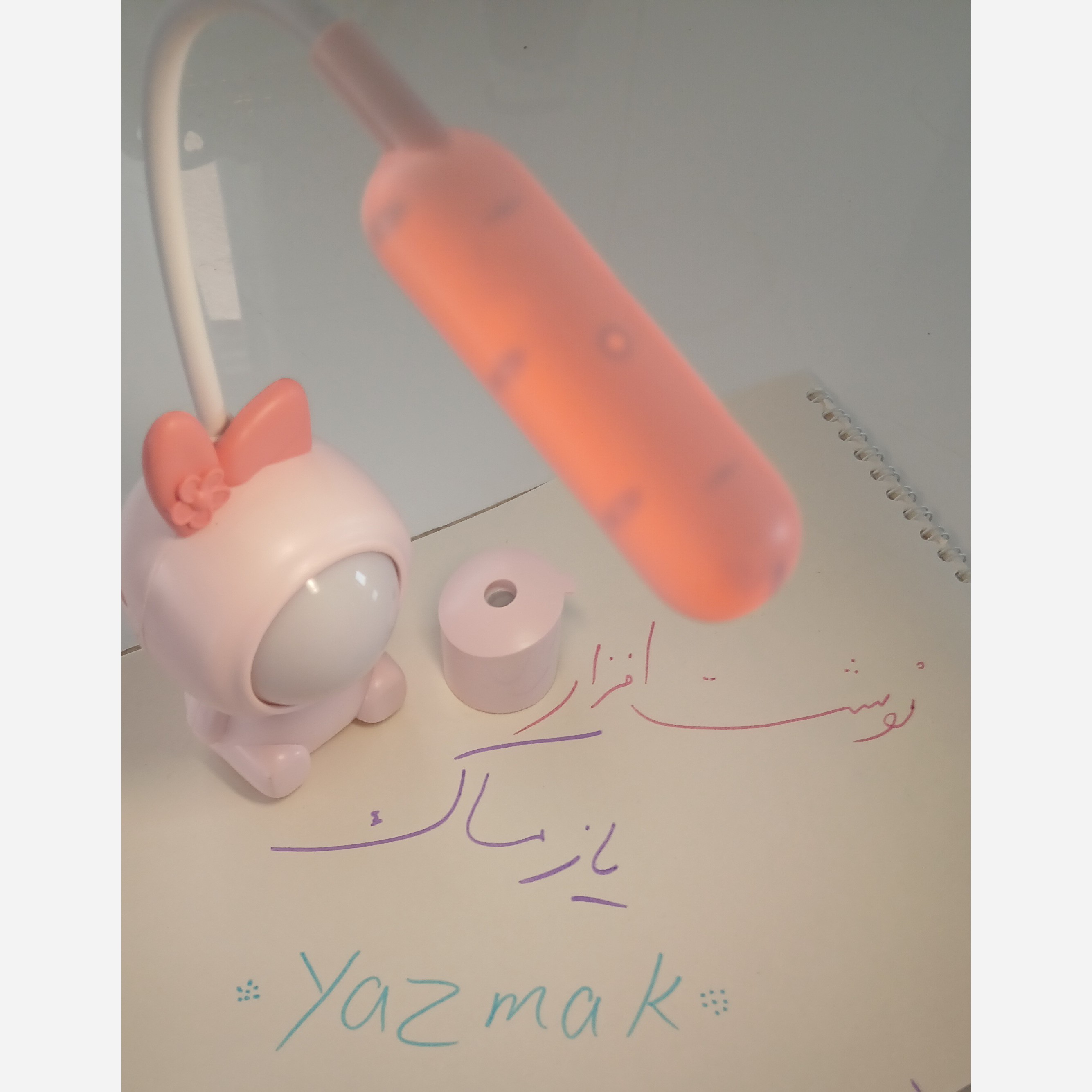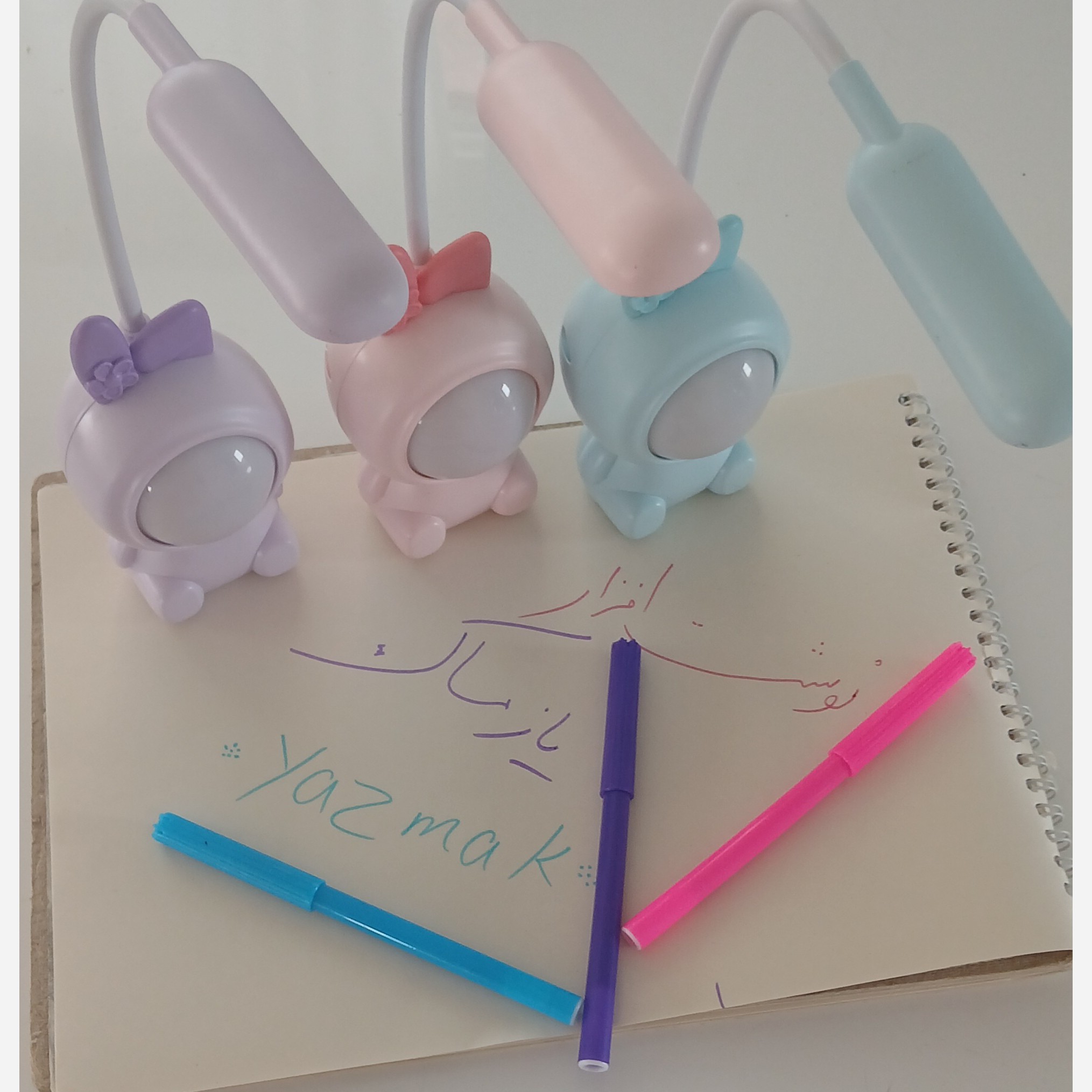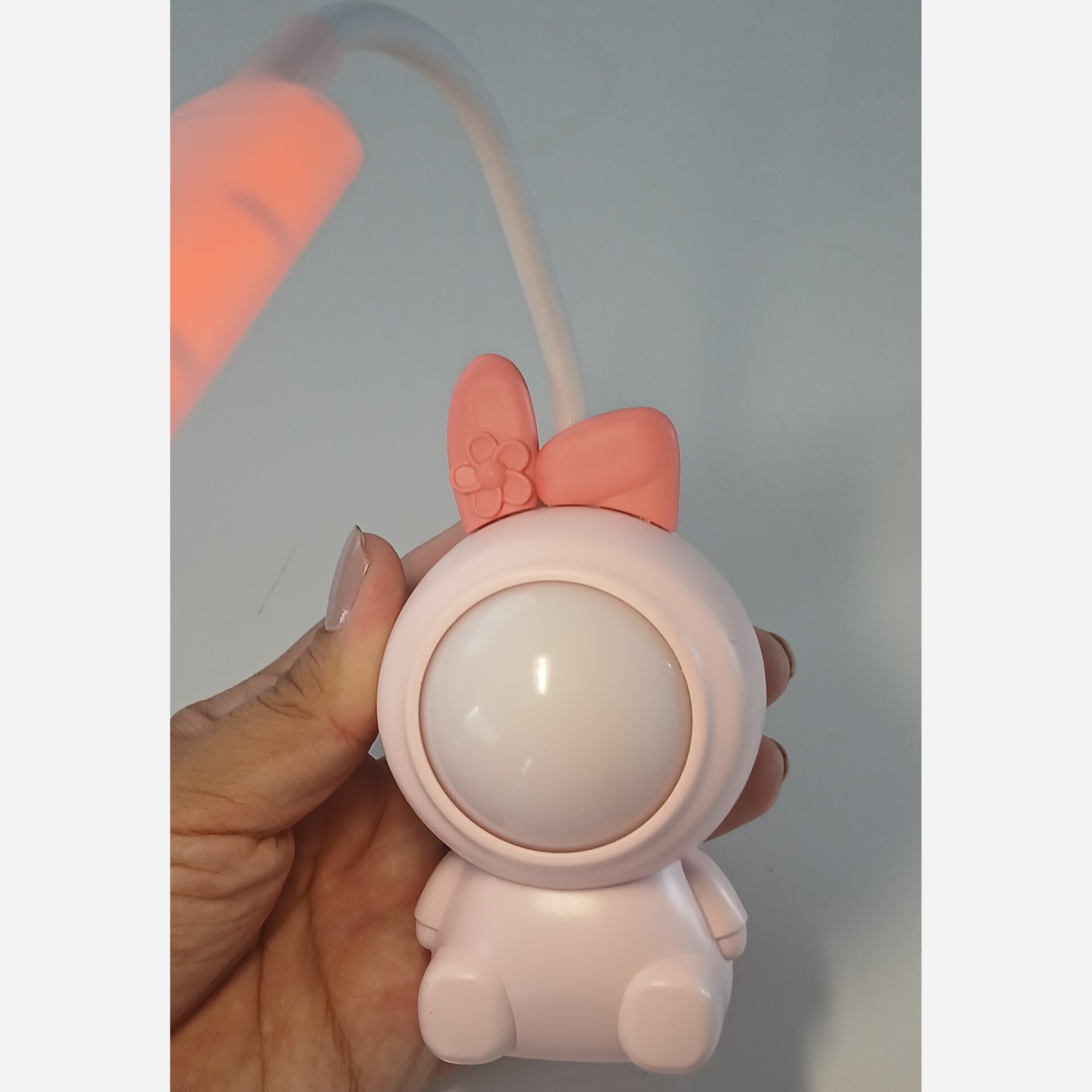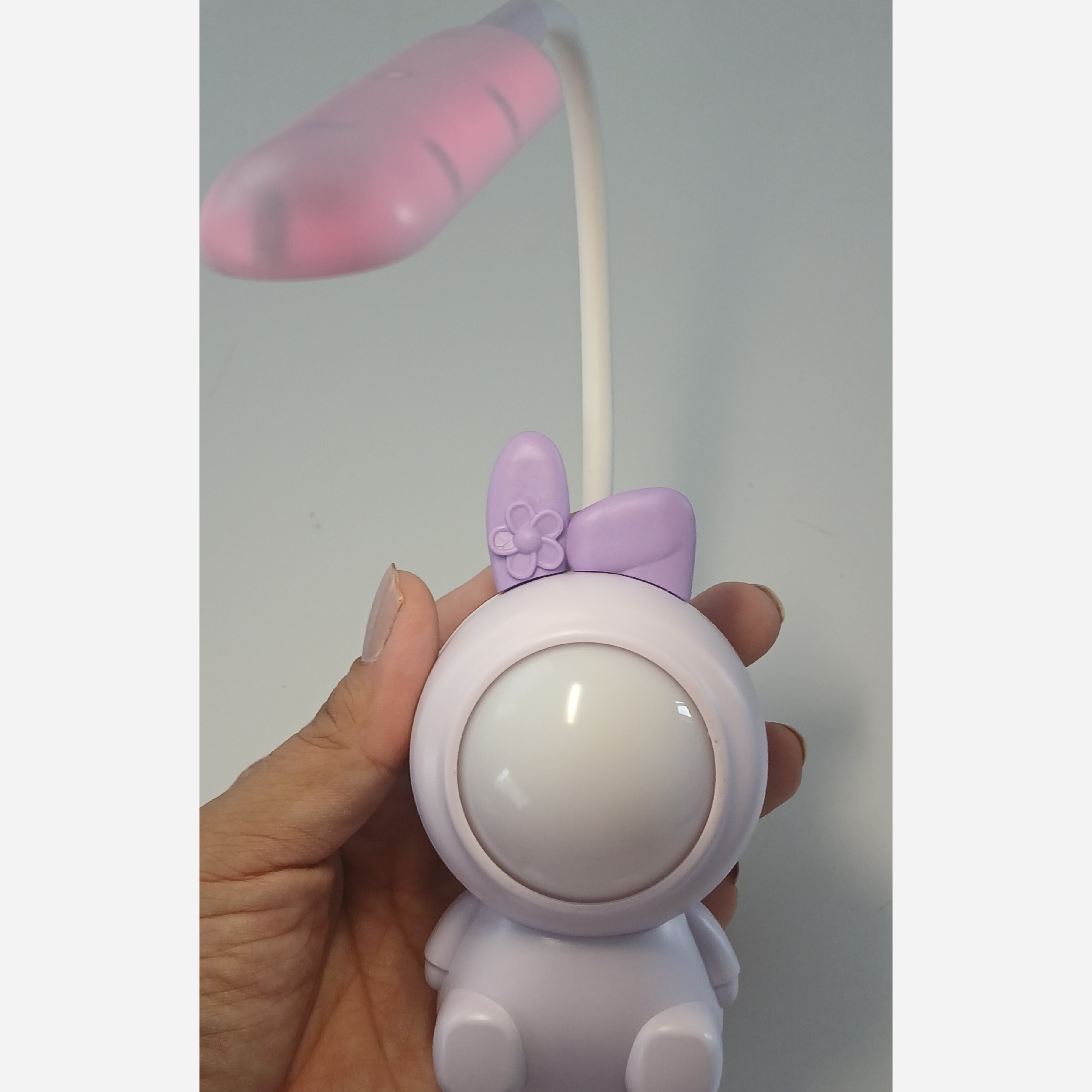 چراغ مطالعه خرگوشک فضانورد این چراغ مطالعه زیبا و دوست داشتی بسیار کیوت و زیبا میباشد . چراغ مطالعه دارای یک سطح نوری است . صورت خرگوشک به صورت رندمی تغییر رنگ میدهد و به رنگ های آبی ،سبز،صورتی و یاسی تغییر میکند. از این ویژگی تغییر رنگ میتوان به عنوان چراغ خوای اتاق کودک استفاده کرد. ویژگی دیگر این محصول این است که دارای کابل یو اس بی است به دلیل نیازی به باطری ندارد و از باطری داخلی استفاده میکند. این چراغ مطالعه دارای تراش مخزن دار است که در پشت محصول قرار دارد.
