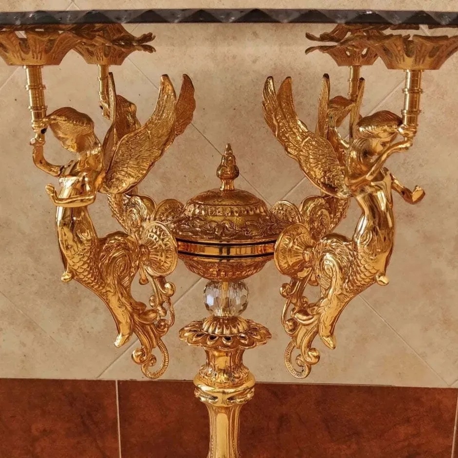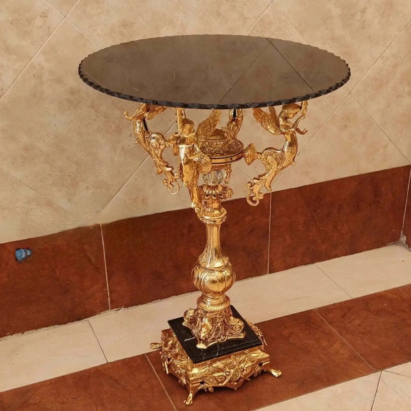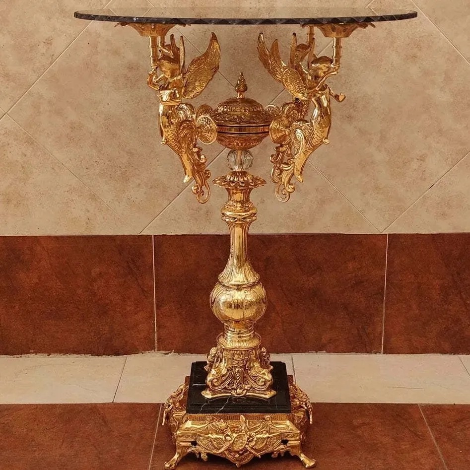 میز خاطره گل میز 4 فرشته برنز کنار سالنی ملکه برنزی پایه سنگی فورتیک آبکاری طلا مبلمونسرا مدل 224695