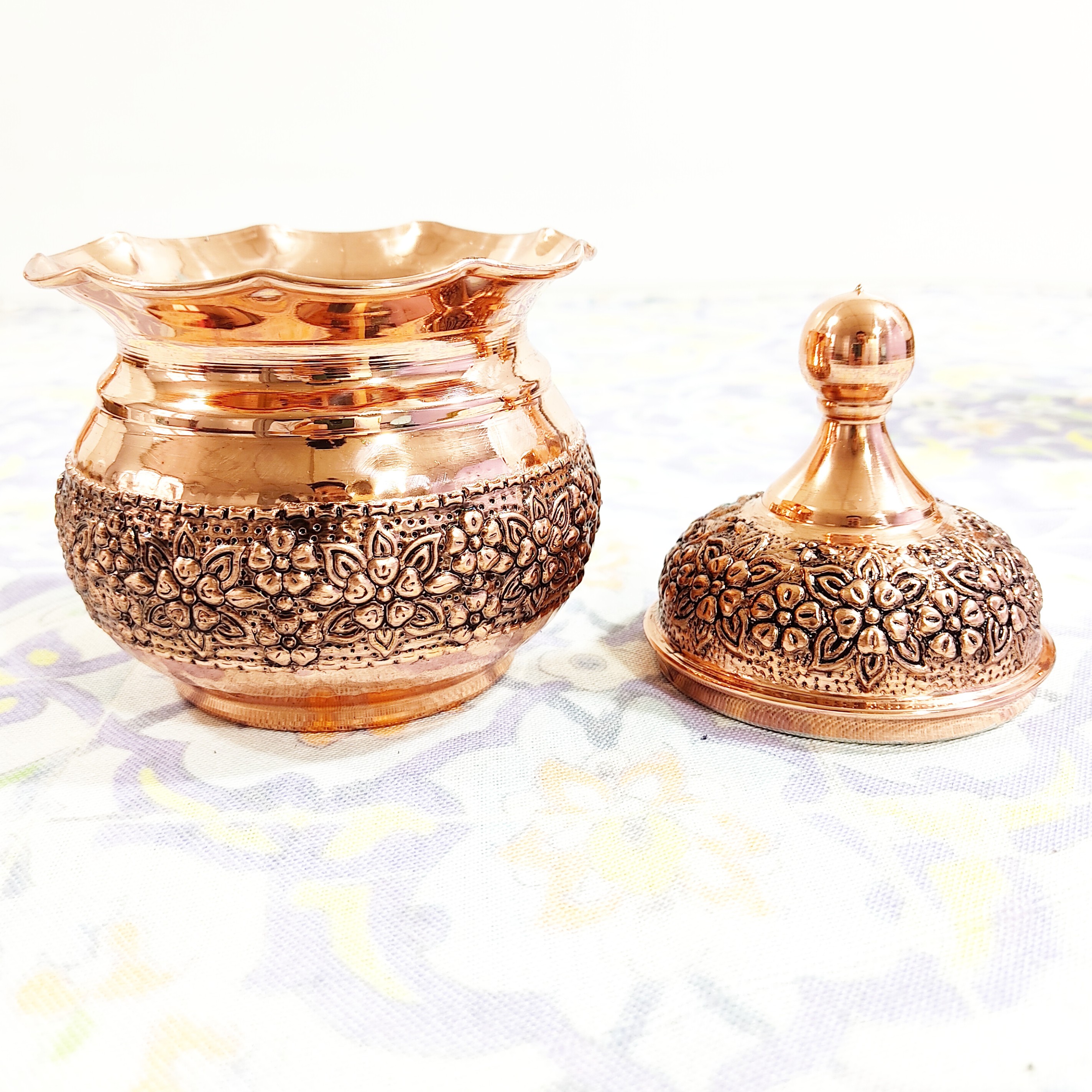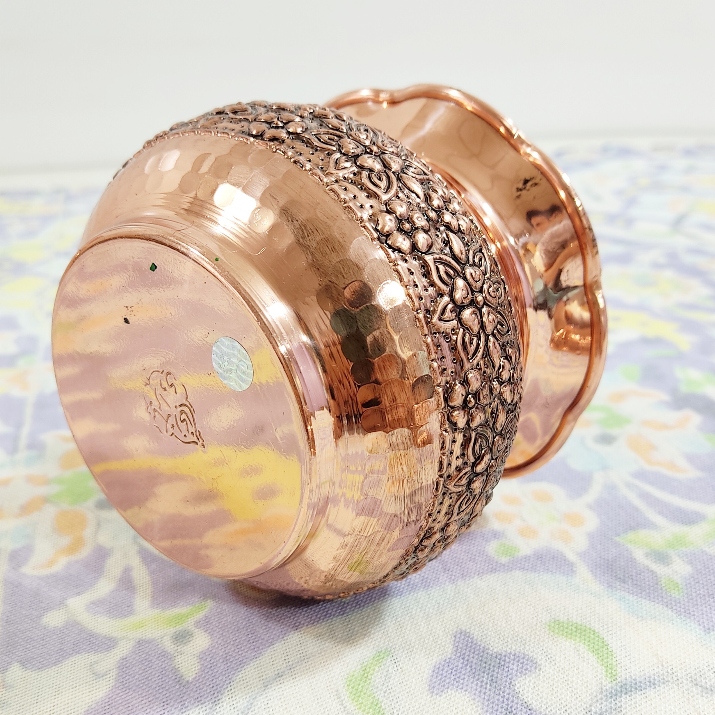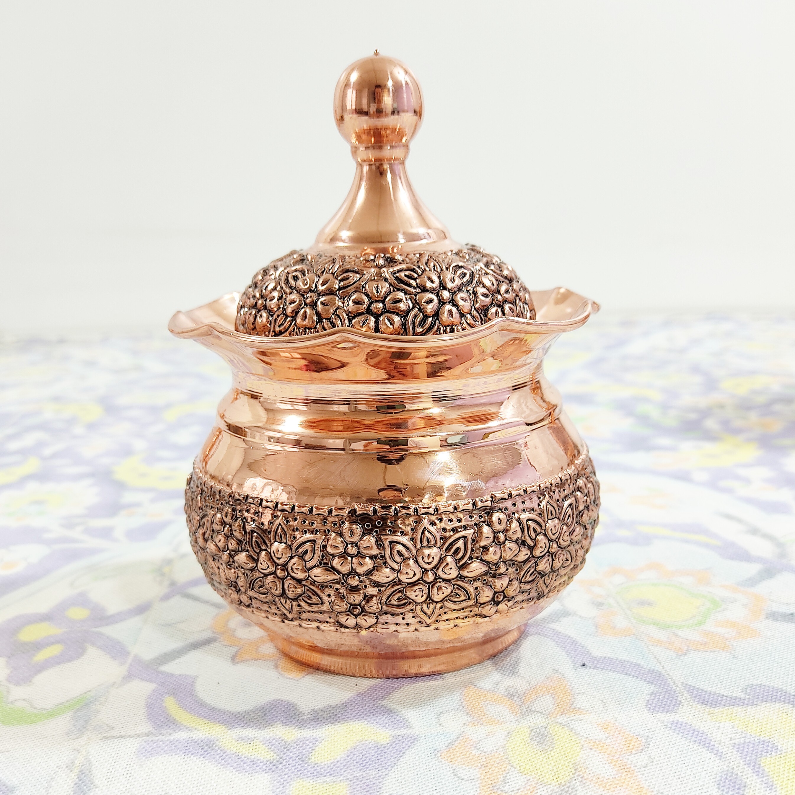 قندان و تنقلات خوری تمام مسی گلبرگ گل برجسته طرح قلم کاری شده روی بدنه و روی درب ارتفاع 14سانتی متر قطر 10سانتیمتر داخل قلع کاری شده یک محصول مسی دست ساز زنجان با ضخامت بالا و ورق بسیار با کیفیت