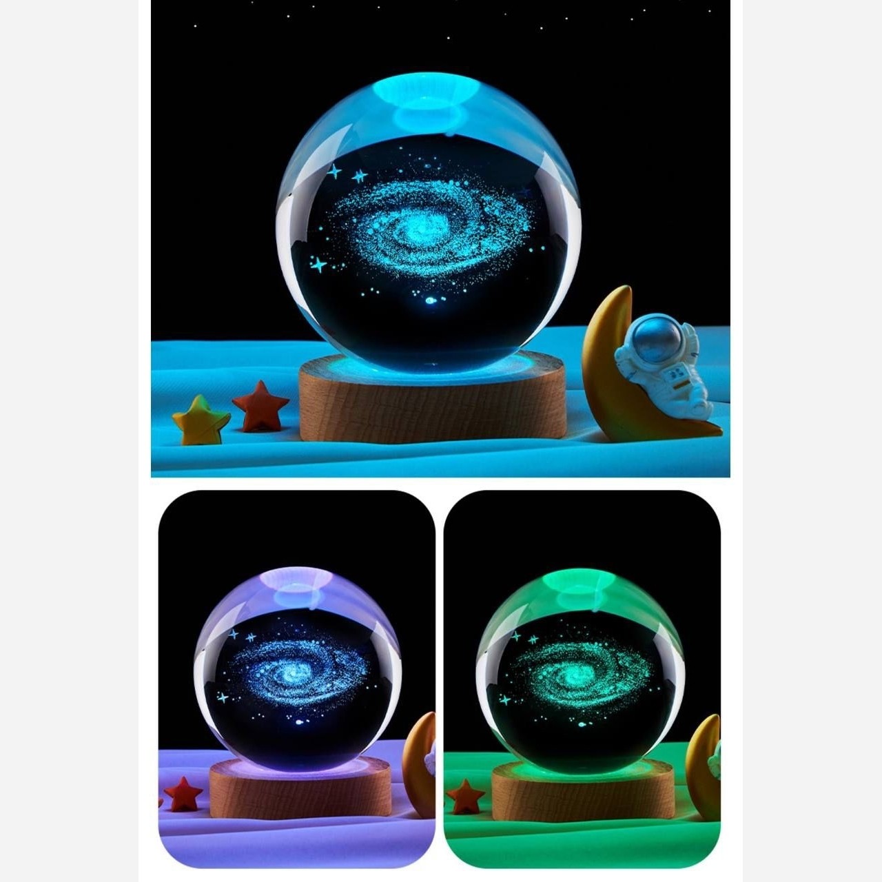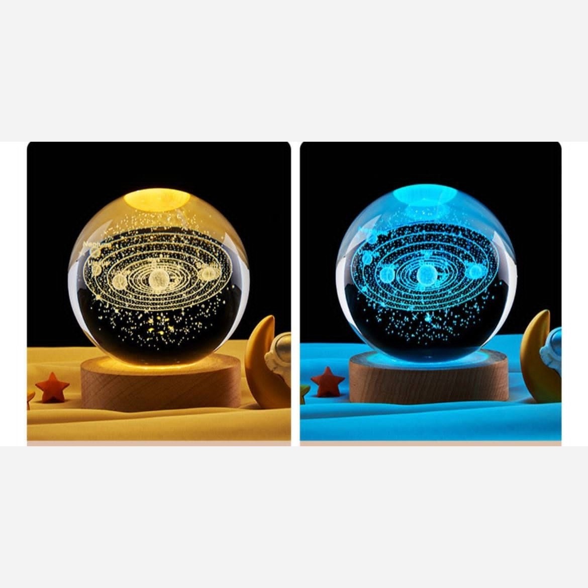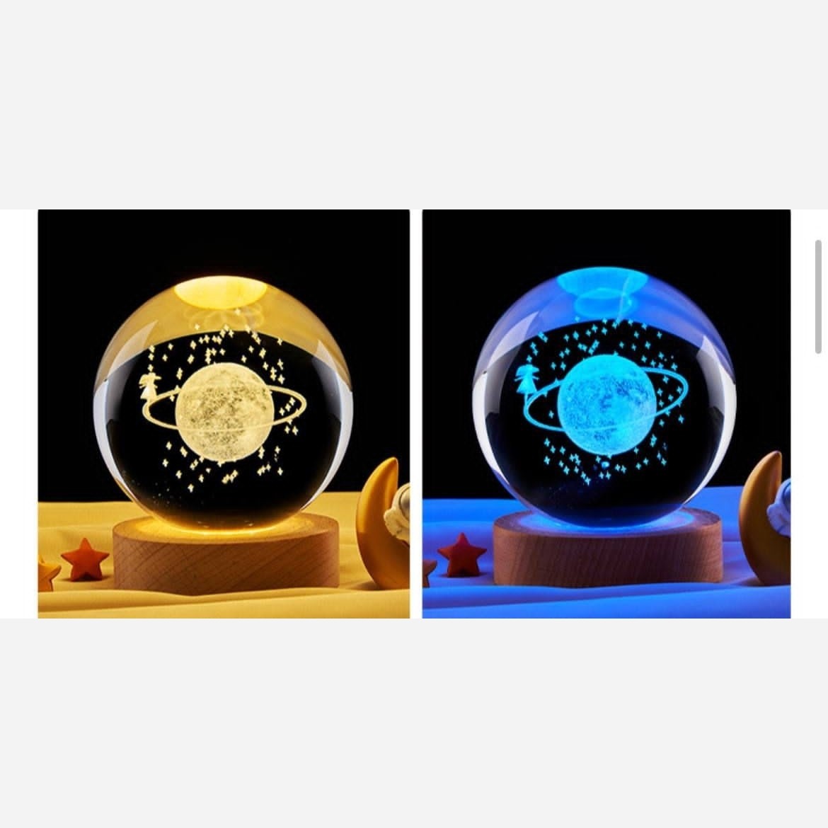 گوی های شیشه ای کریستالی شبخواب پایه چوبی قطر گوی 8 سانتی متر پایه چوبی ضخامت 2 سانتی متر نور پایه ها زرد رنگ و RGB کابل usb دارد و با شارژر 1 آمپر روشن میشود