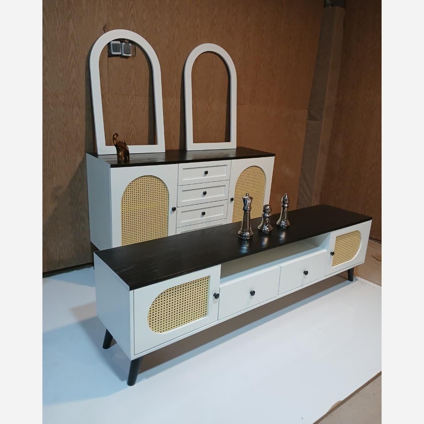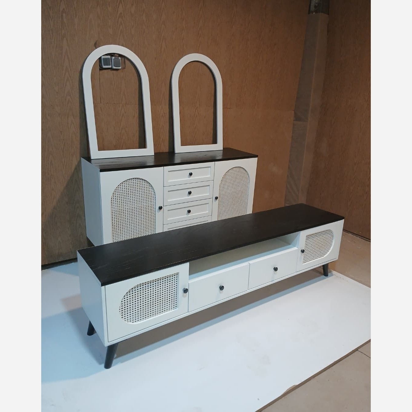 آینه کنسول حصیری طول 160 جنس ام دی اف درجه یک رنگبندی به سلیقه مشتری میز تلویزیون طول 160: 9/500 جاکفشی حصیری : 8/50 آینه کنسول 12/500
