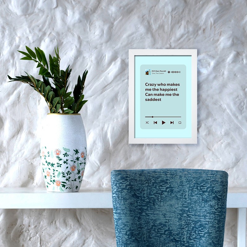 تابلوی موزیکال با طراحی مدرن و الهامگرفته از موسیقی، ترکیبی از هنر و احساسات، با نمایش بخشی از متن آهنگ و قاب ساده و مینیمالیست، گزینه ای عالی برای هدیه ای متفاوت و یا دکوراسیونی گفتگوآفرین، مناسب عاشقان موسیقی، دارای بارکد اسپاتیفای که با اسکن آن میتوان به آهنگ مورد نظر دسترسی پیدا کرد.