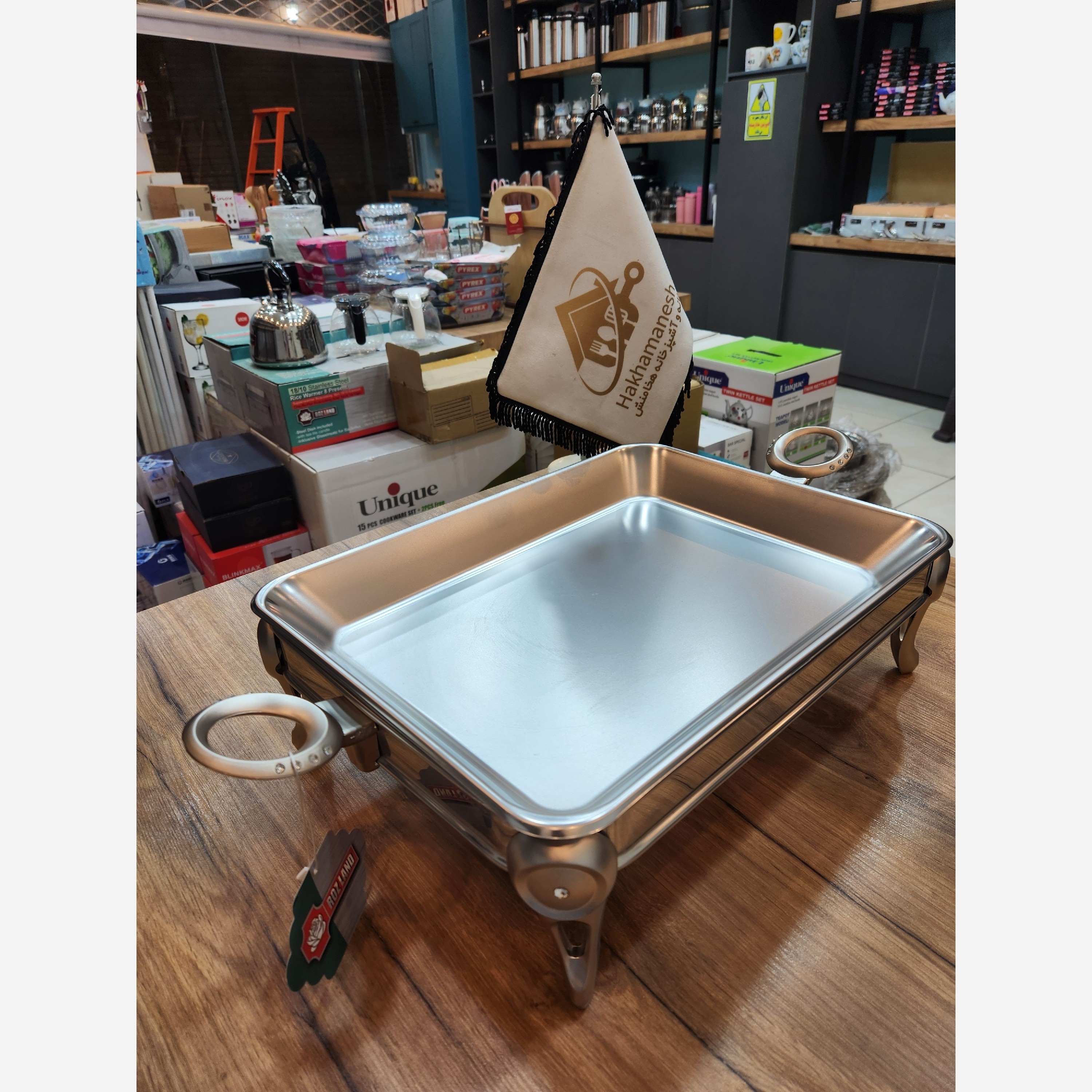 سوفله برنج خوری دسته نگین رزلند برای پذیرایی های مجالس مهمانی های شیک و لاکچری شما عزیزان است. بدنه استیل اعلا 18/10 نگیر ضد زنگ و سینی داخل نیز از جنس استیل با کیفیت و مرغوب می باشد. بدنه استیل در عین سادگی طراحی زیبا و چشم نوازی دارد که نگین کاری دسته ها و پایه ها زیبایی محصول را دو چندان کرده است.این محصول با کیفیت دارای دو عدد وارمر در قسمت پایین کار است که سبب گرم و لذیذ ماندن مواد غذایی برای مدت طولانی می شود. یک محصول به شدت کاربردی که صددرصد یک کدبانوی هنرمند ایرانی محتاج آن است. طول با احتساب دسته ها 54 سانتیمتر عرض 29 سانتیمتر ارتفاع 12 سانتیمتر