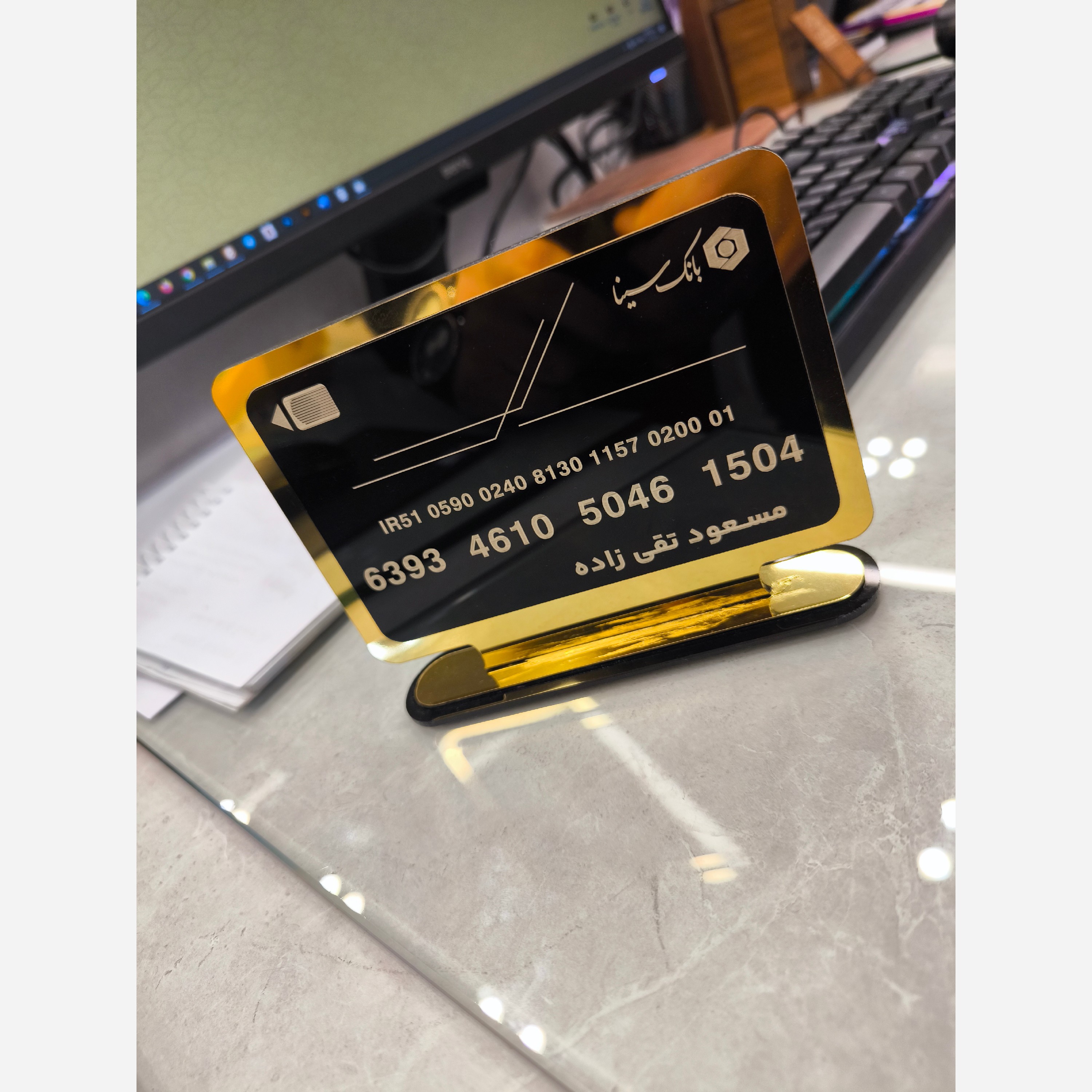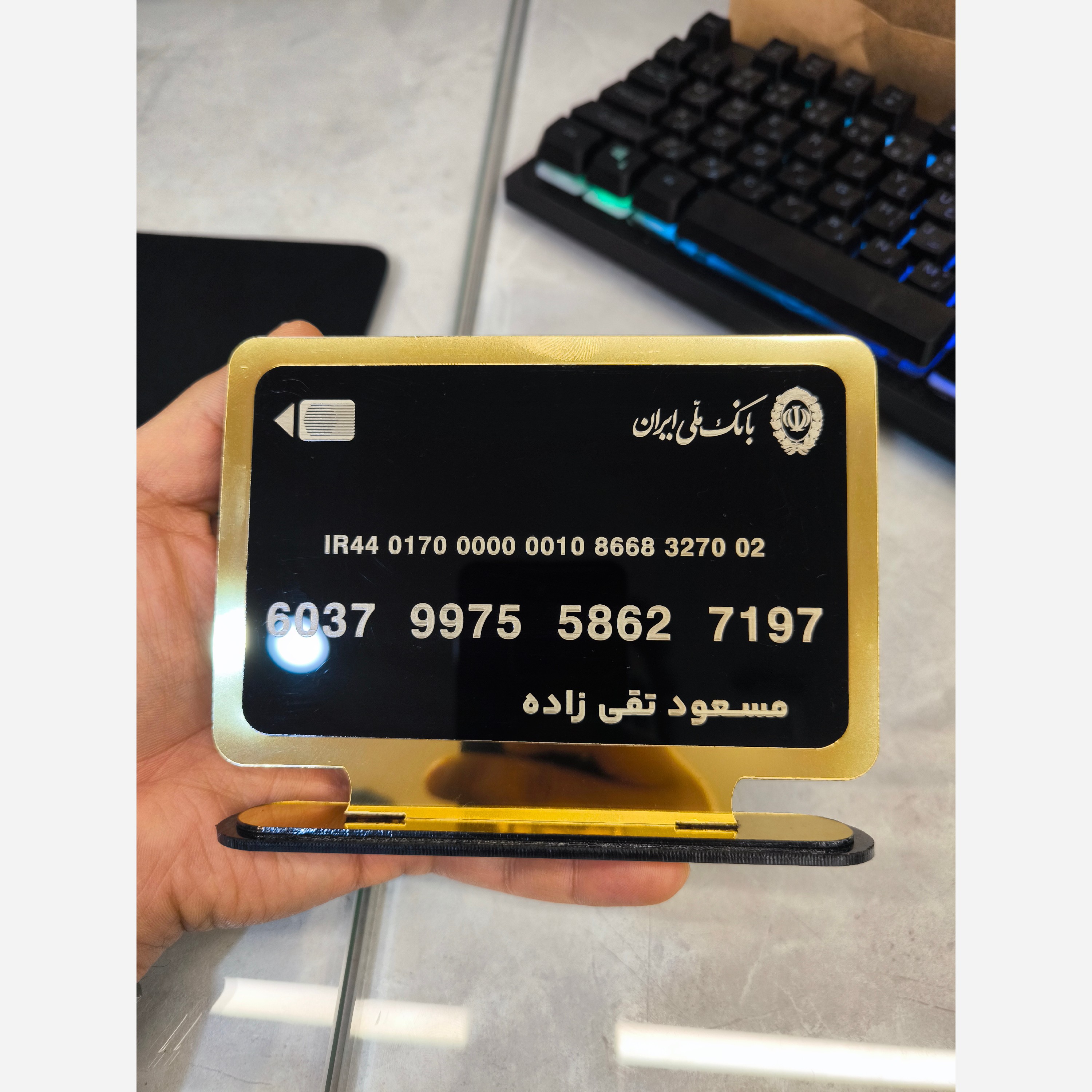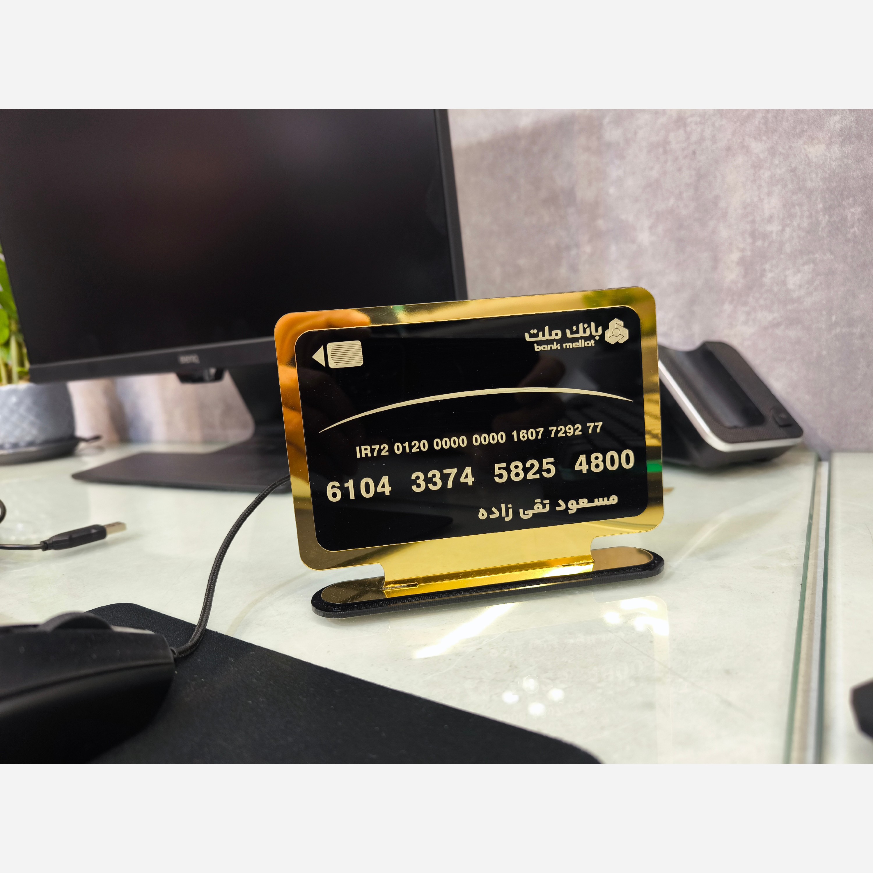 استند رومیزی شماره کارت بانکی جنس ترکیب پلکسی خارجی و مولتی طلایی یا نقره ای 📦 هزینه ارسال و پرداخت درب منزل می باشد . در صورت درخواست ارسال با پست در بخش گفتگو با ما در ارتباط باشید .