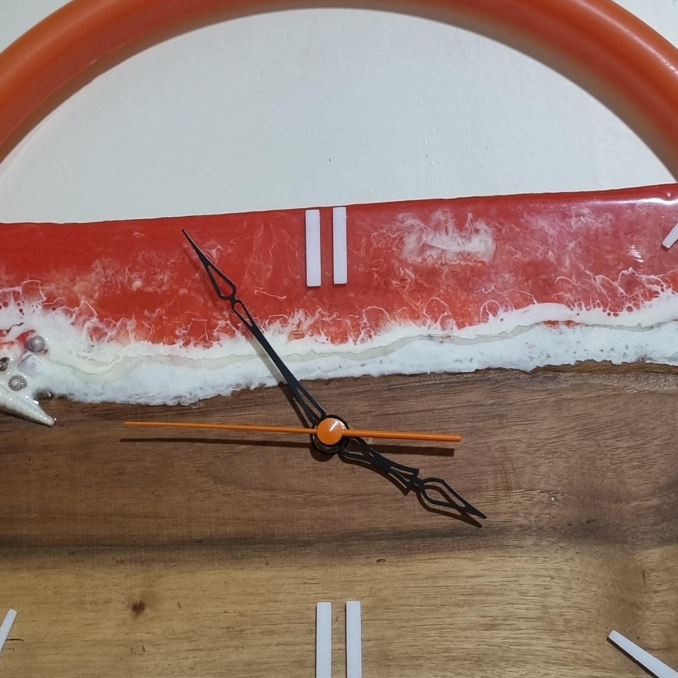 ساعت دیواری طرح دریا رزینی ترکیب چوب و رزین رینگ پلاستیک چوب گردو موتور تیک تاک به رنگ نارنجی موتور ساعت چینی درجه 1