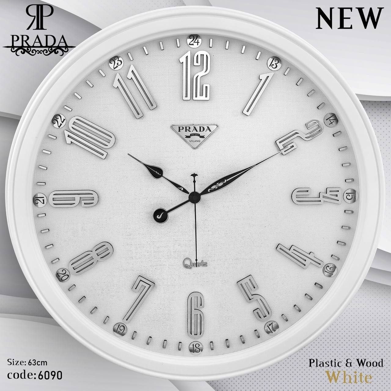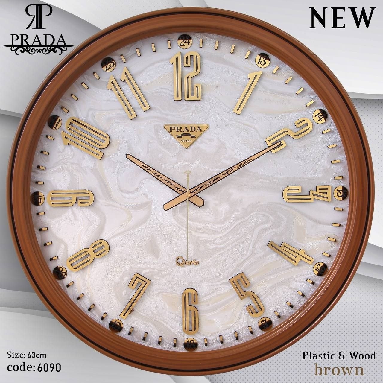 ساعت دیواری New برند پرادا 6090 فریم لاکی موتور آرامگرد ابعاد 65سانتی متر چهار رنگ سفید . قهوه ای . طوسی . بژ دارای ضمانت