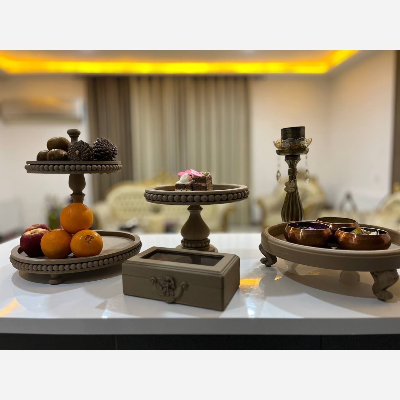 ظرف چوبی پذیرایی پایه دار مخصوص سرو کیک و شیرینی و شکلات و تنقلات و فینگر فود و...