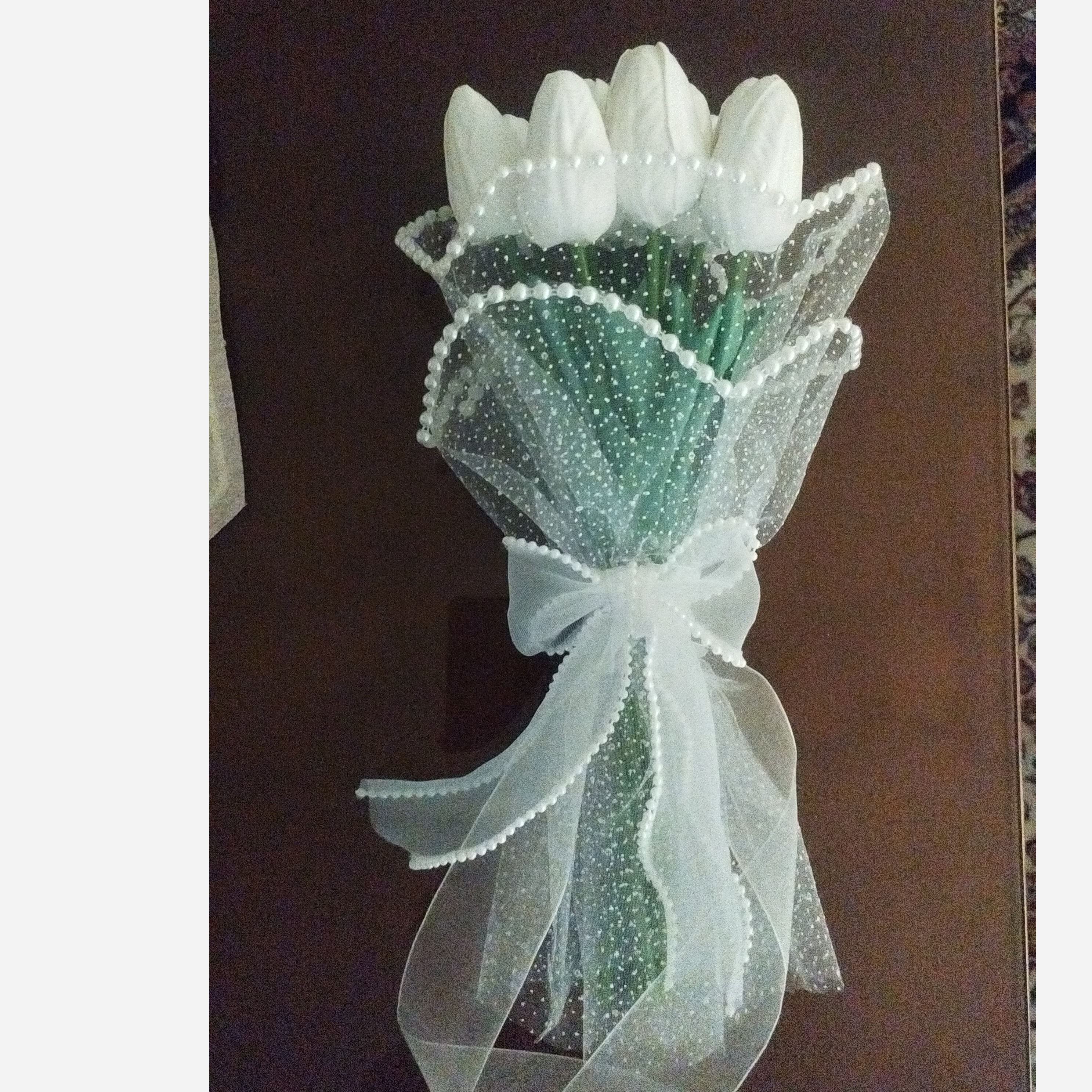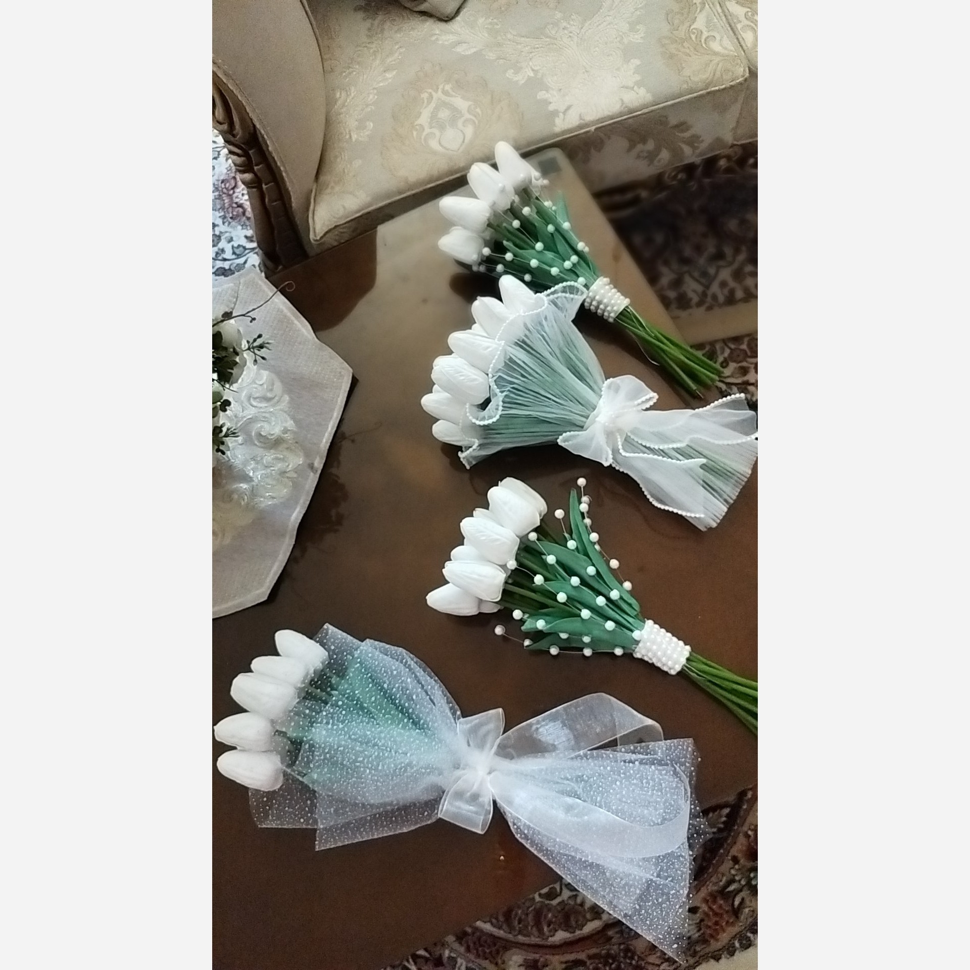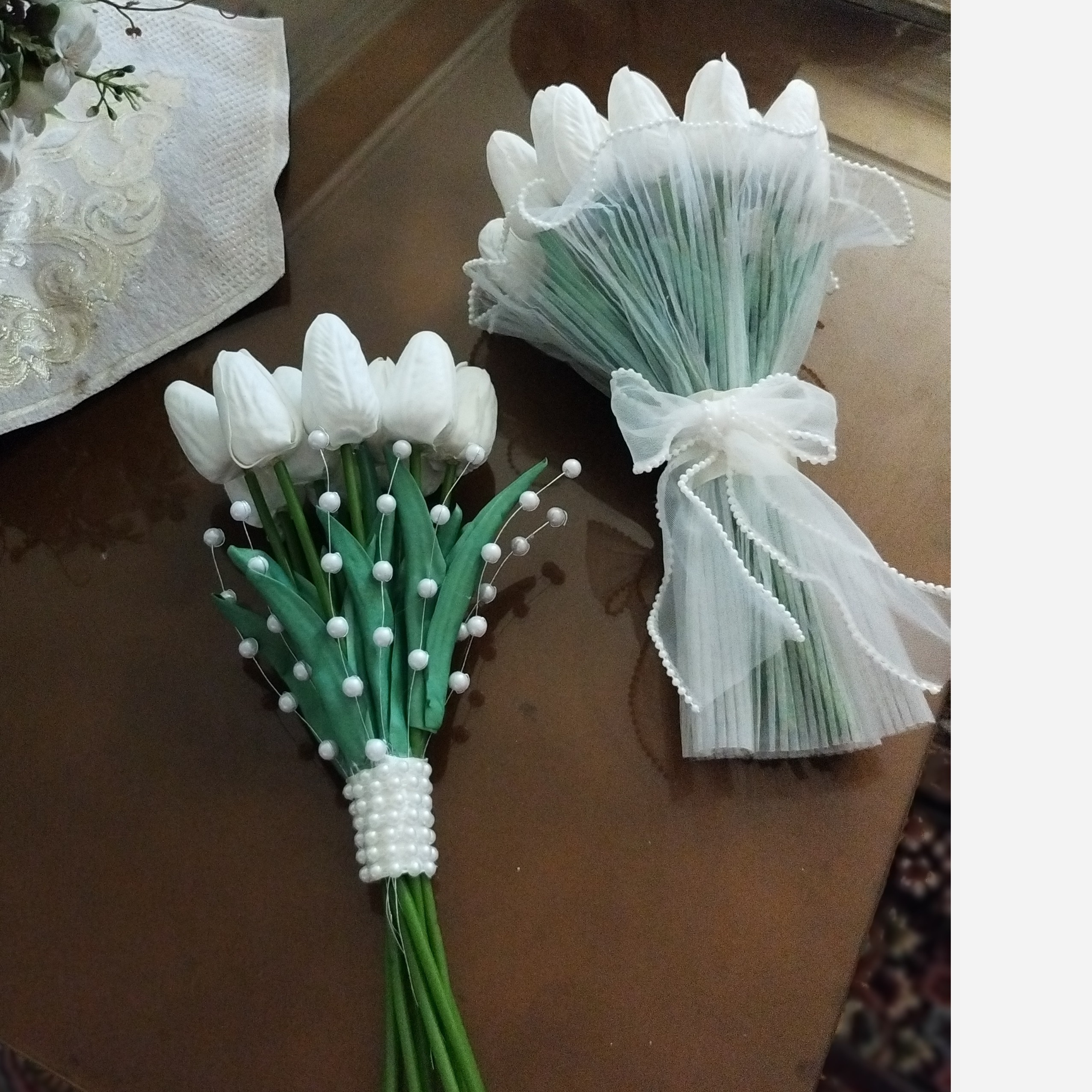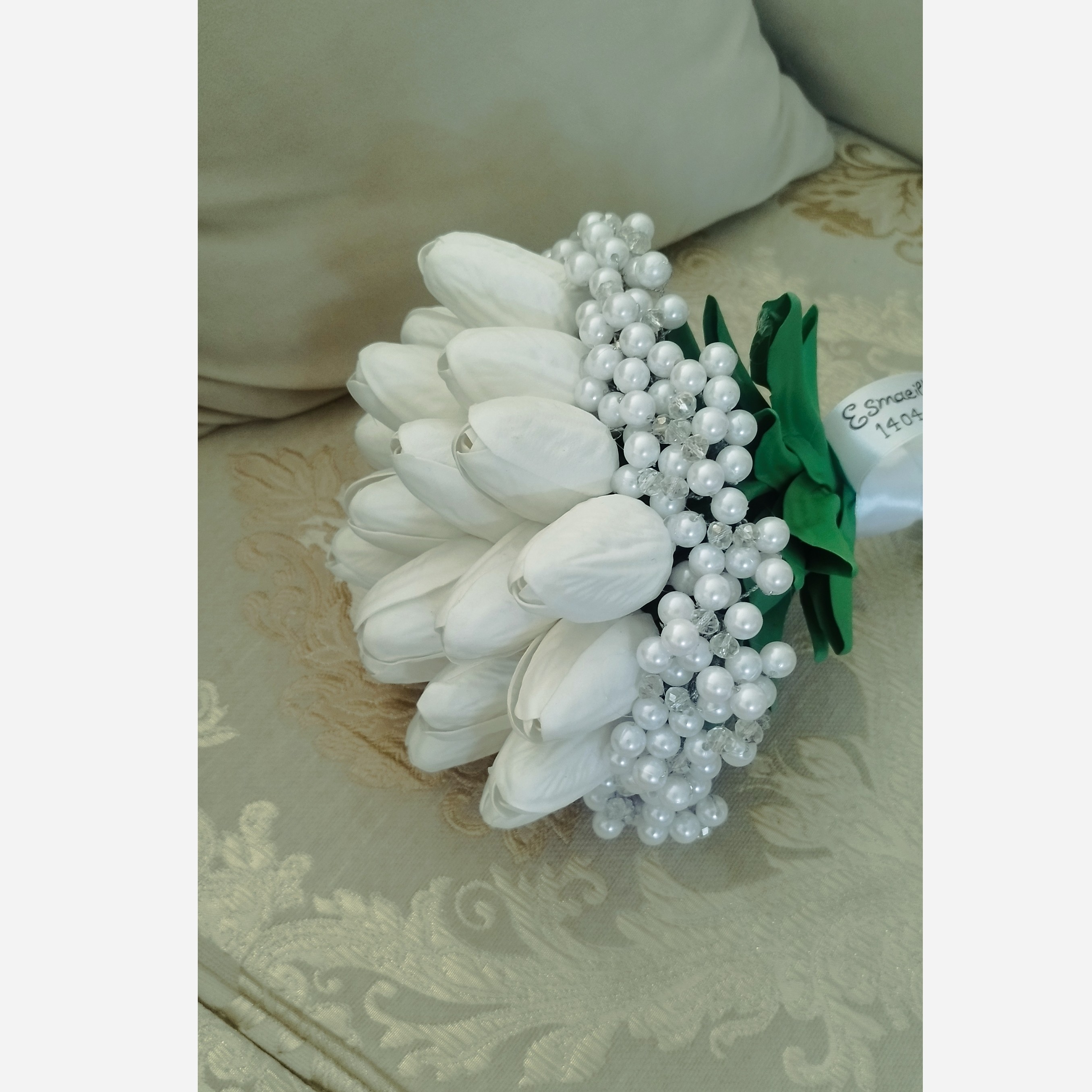 انواع دسته گل عروس با گل لاله فوم دیزاین همراه با ژیپسوفیلا ،مروارید ،تور برقی و تور پلیسه انتخاب با شماست