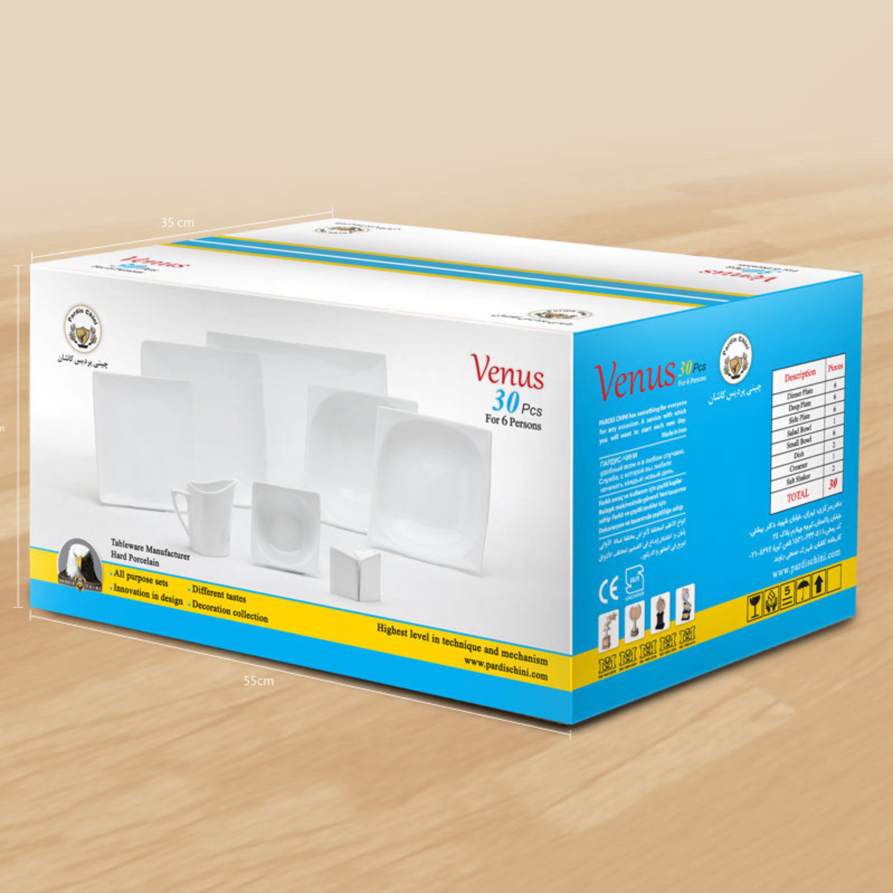 سرویس 101 پارچه چینی پردیس شامل: 12 عدد بشقاب برنج خوری 12 عدد بشقاب خورش خوری 12 عدد پیش دست 12 عدد پیاله ماست 3 عدد دیس 2 عدد ظرف سالاد 1 عدد ظرف سس خوری +1درب 6 عدد نمک پاش چینی 1 عدد فلفل پاش چینی 1 عددشیرخوری+ادرب 12 عدد فنجان 12 عدد زیر فنجان 2 قندان+2درب قندان 1 عدد سوپ خوری+1درب سوپ خوری 6 عدد نمک پاش 1 عدد کفگیر 1 عدد جای دستمال 6 عدد حلقه این سرویس با طرح و قالبی بسیار زیبا توسط کارخانه ی چینی پردیس کاشان تولید شده و در یک بسته بندی فوق العاده شیک و مطمئن قرار دارد تا برای جابجایی ها نیز دچار آسیب نشود این سرویس ها گزینه مناسبی برای کسانی است ک ب پذیرایی مجلل و شیک از مهمان و ست بودن ظروف اهمیت می دهند چینی پردیس کاشان بسیار با کیفیت بوده و به واسطه ی قرار گرفتن ظروف بعد از طراحی در کوره ی دمای بالا ، دارای طرح و رنگی ثابت است.