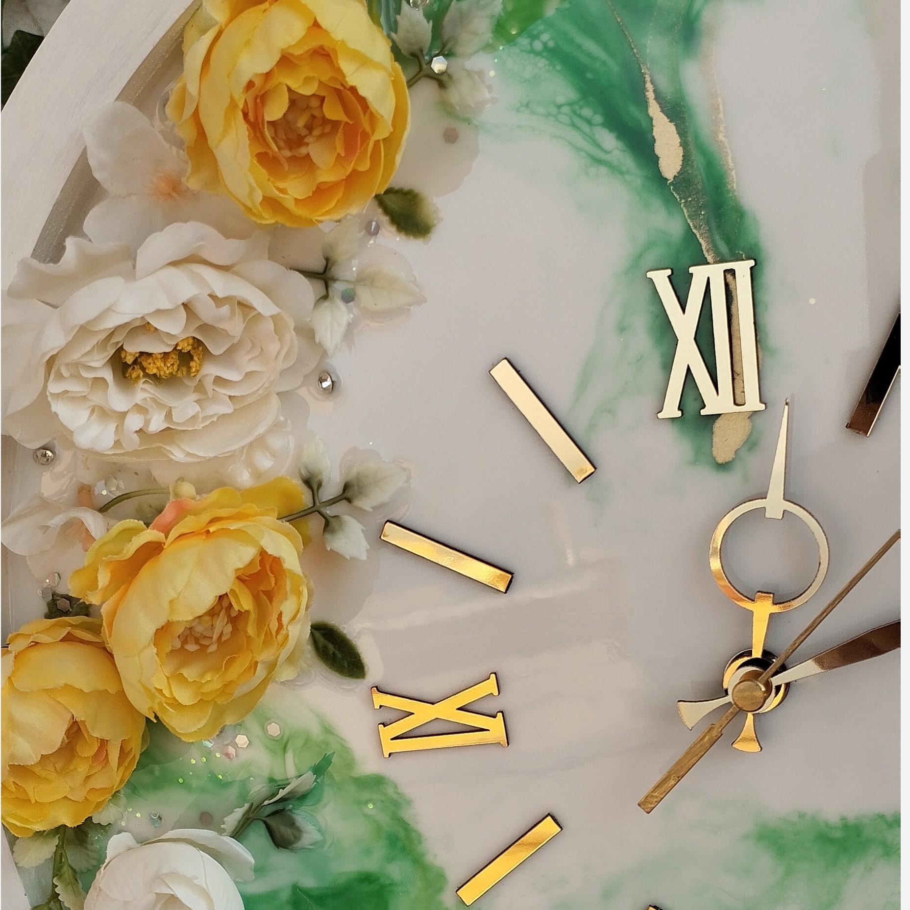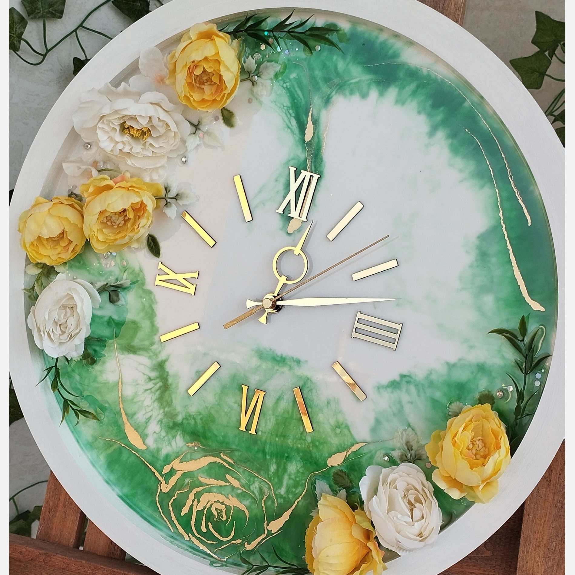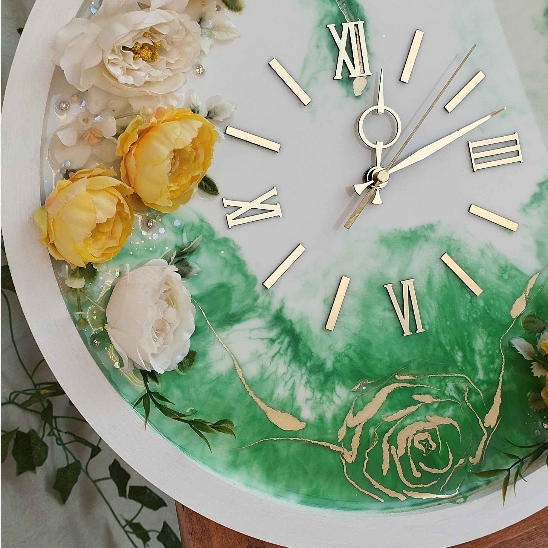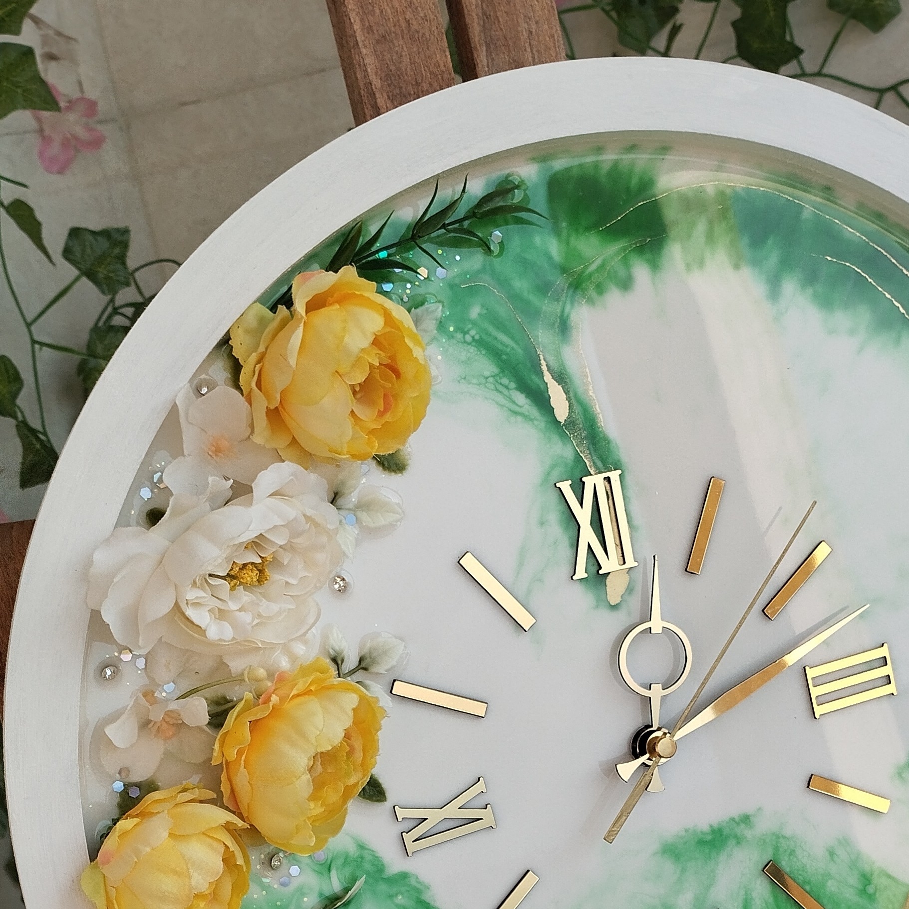 کار شده با رزین سوپر شفاف اعداد و عقربه مولتی استایل نقره ای رنگ ثابت بیس ام دی اف درجه یک موتور آرامگرد تایوان اصل گل های مصنوعی پیونی