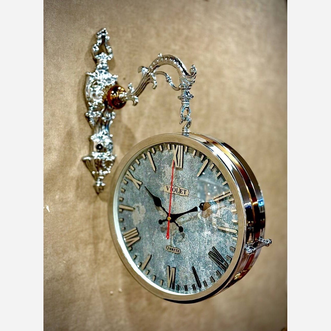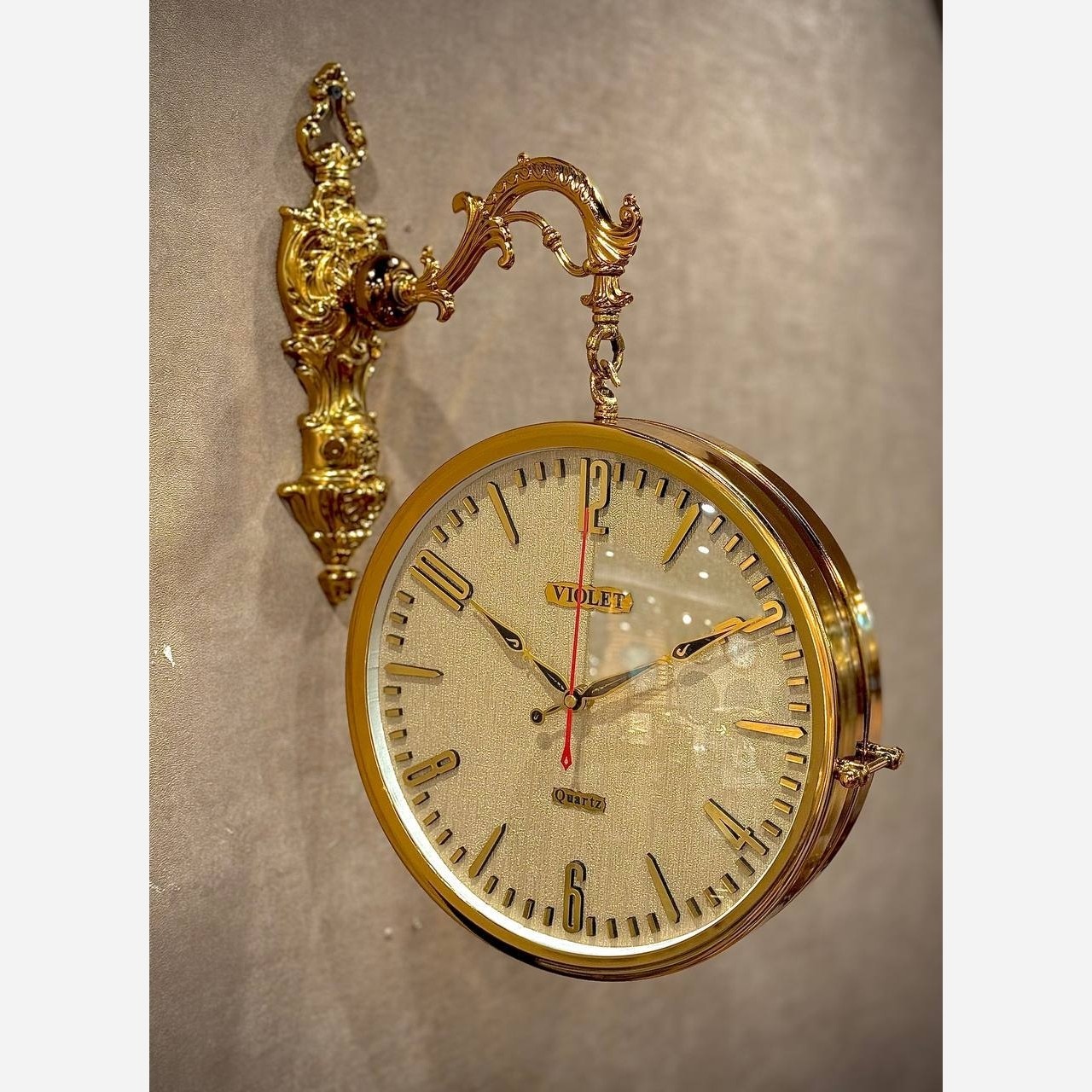 ساعت دیواری دو طرفه برند : ویلوت فریم فلزی صفحه عددی و یونانی موتور آرامگرد و بیصدا دارای ضمانت غیر قابل تغییر رنگ بدنه رنگبندی طلایی و نقره ای