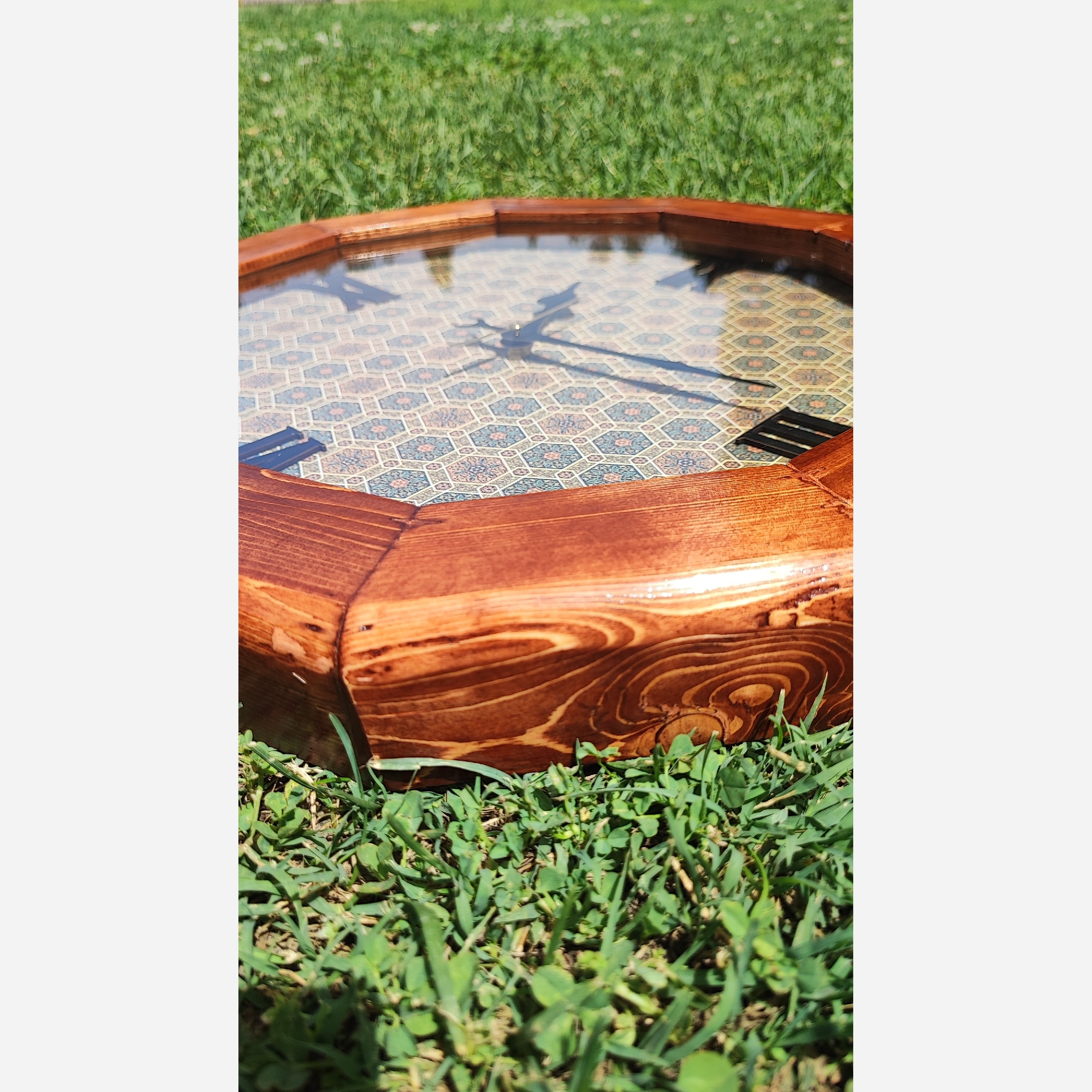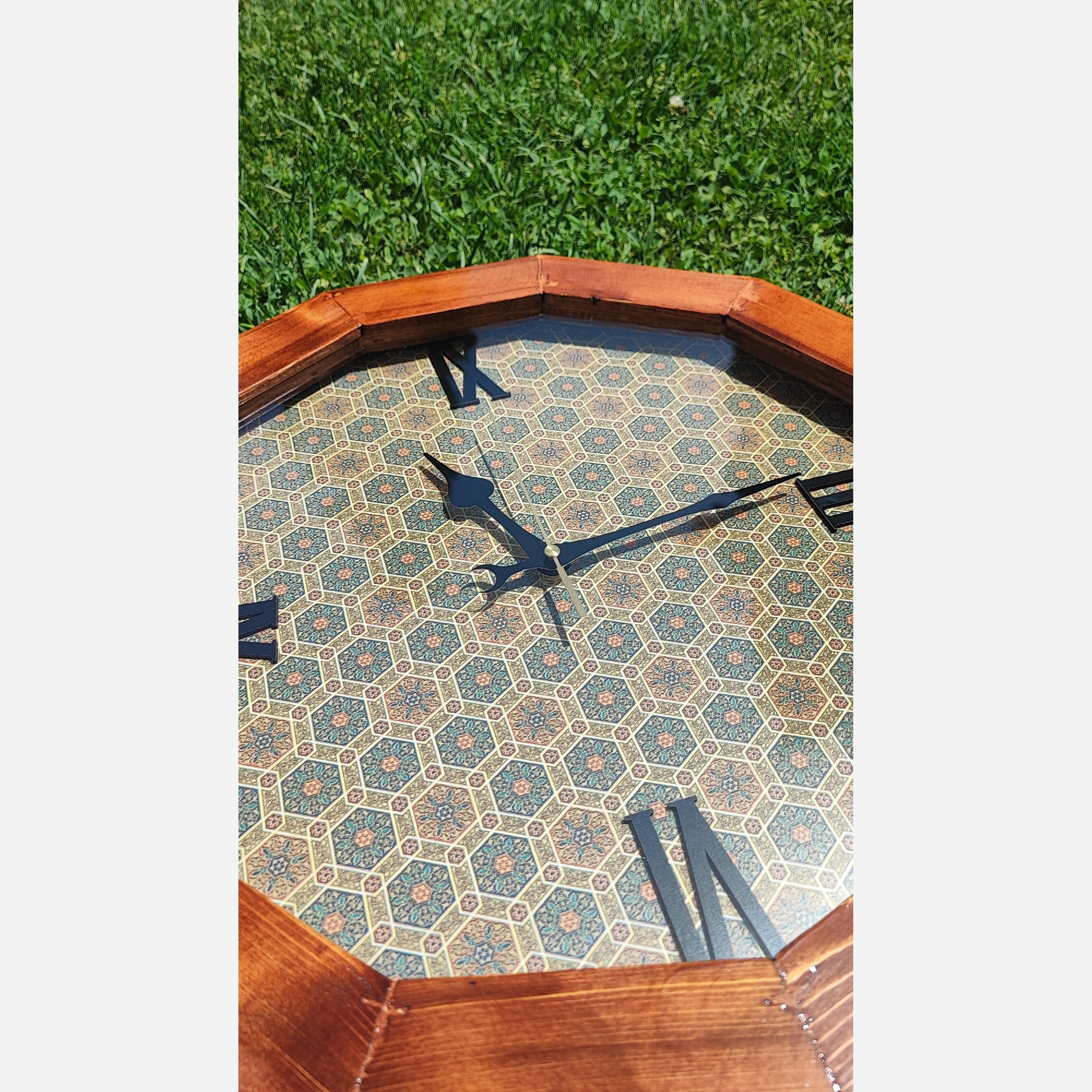 ساعت دیواری چوبی چندضلعی پس زمینه : چوب طرح مینا اعداد : چوبی یونانی موتور: آرام گرد تایوانی بدون صدا فریم: چوب روس پوشش نهایی پلی استر سایز: 50
